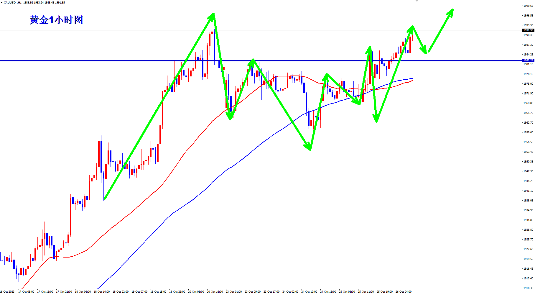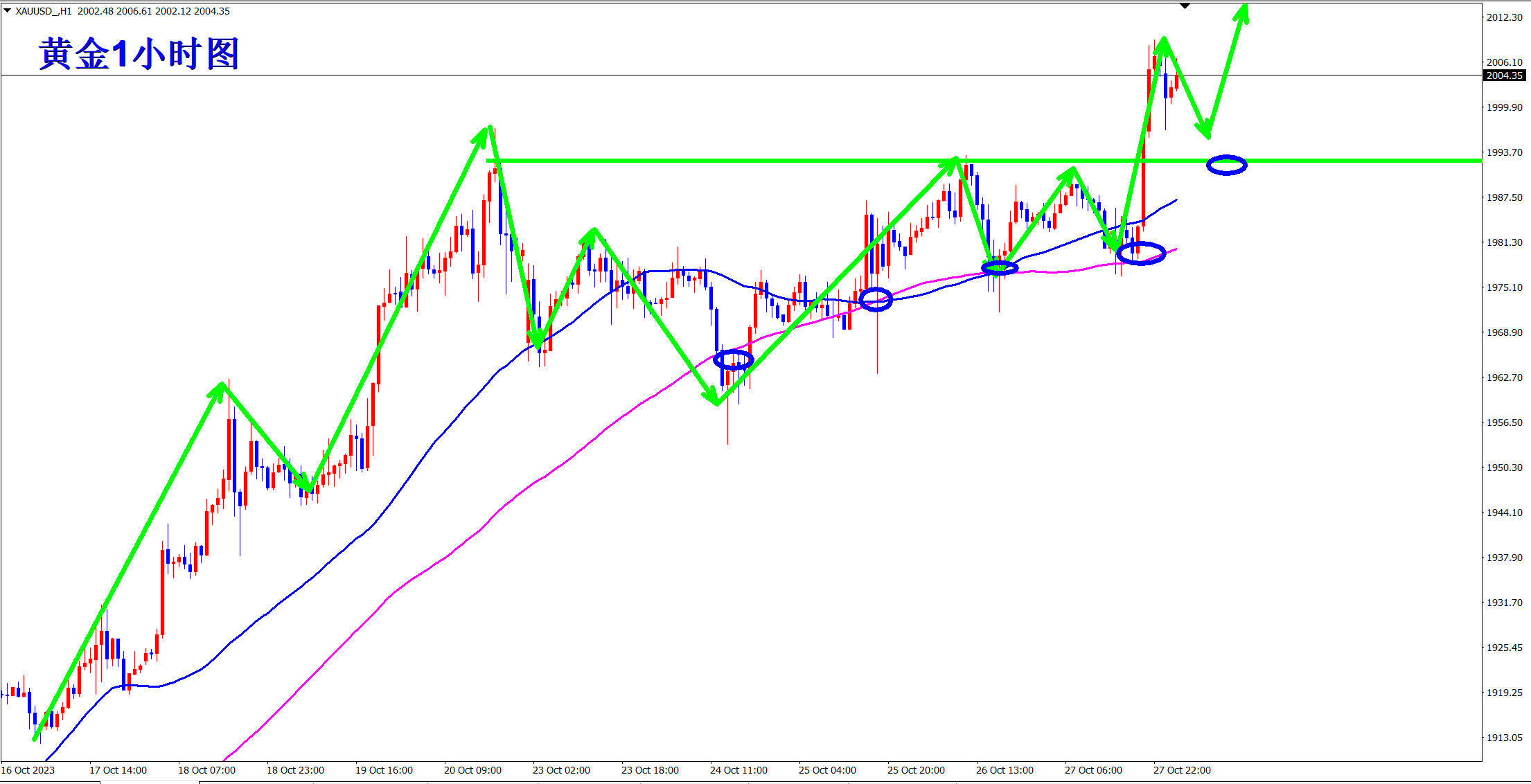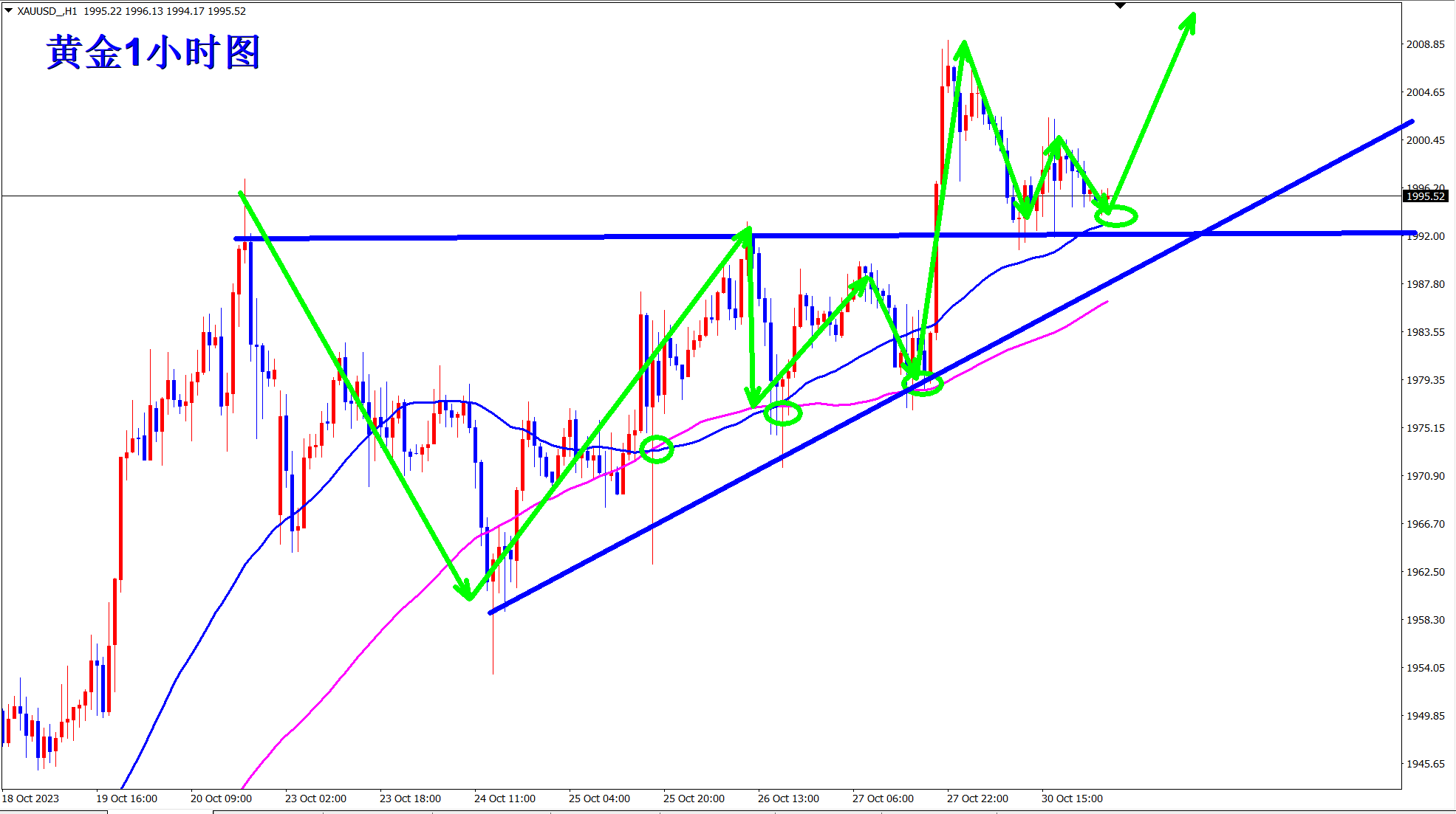 顺势轻飘飘,逆势乱糟糟!黄金继续上涨突破新高!王杨也一直顺势而为的策略,上周不断低多,周五终于大涨突破新高!当前涨势继续,早盘依托1993的支撑继续做多看涨! 趋势为王,点位致胜!当前涨势继续,操作上依旧低多看涨!黄金从1小时级别上看,均线由之前的粘合状态开始发散,意味着新的上涨趋势开始!均线