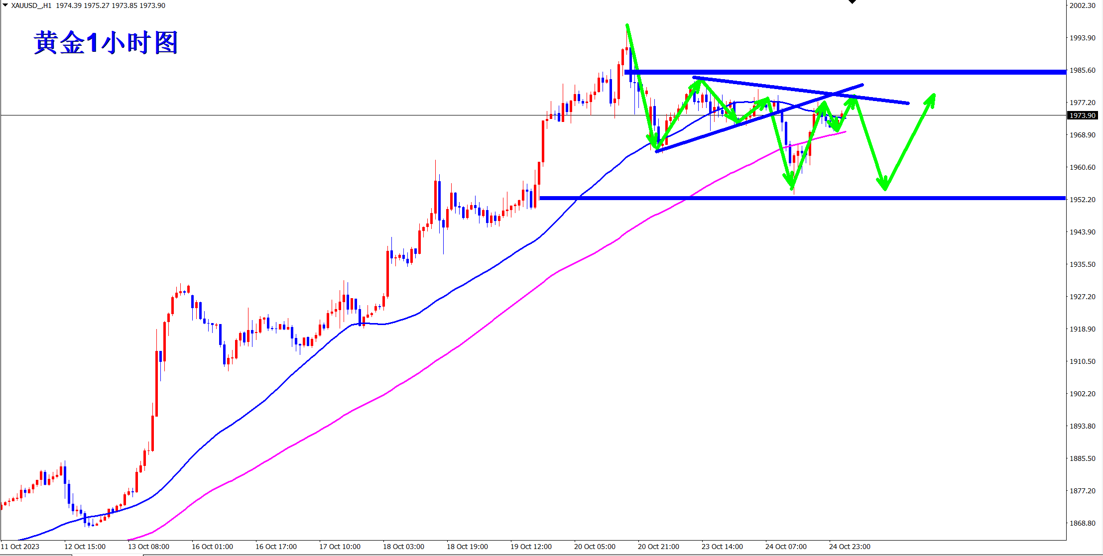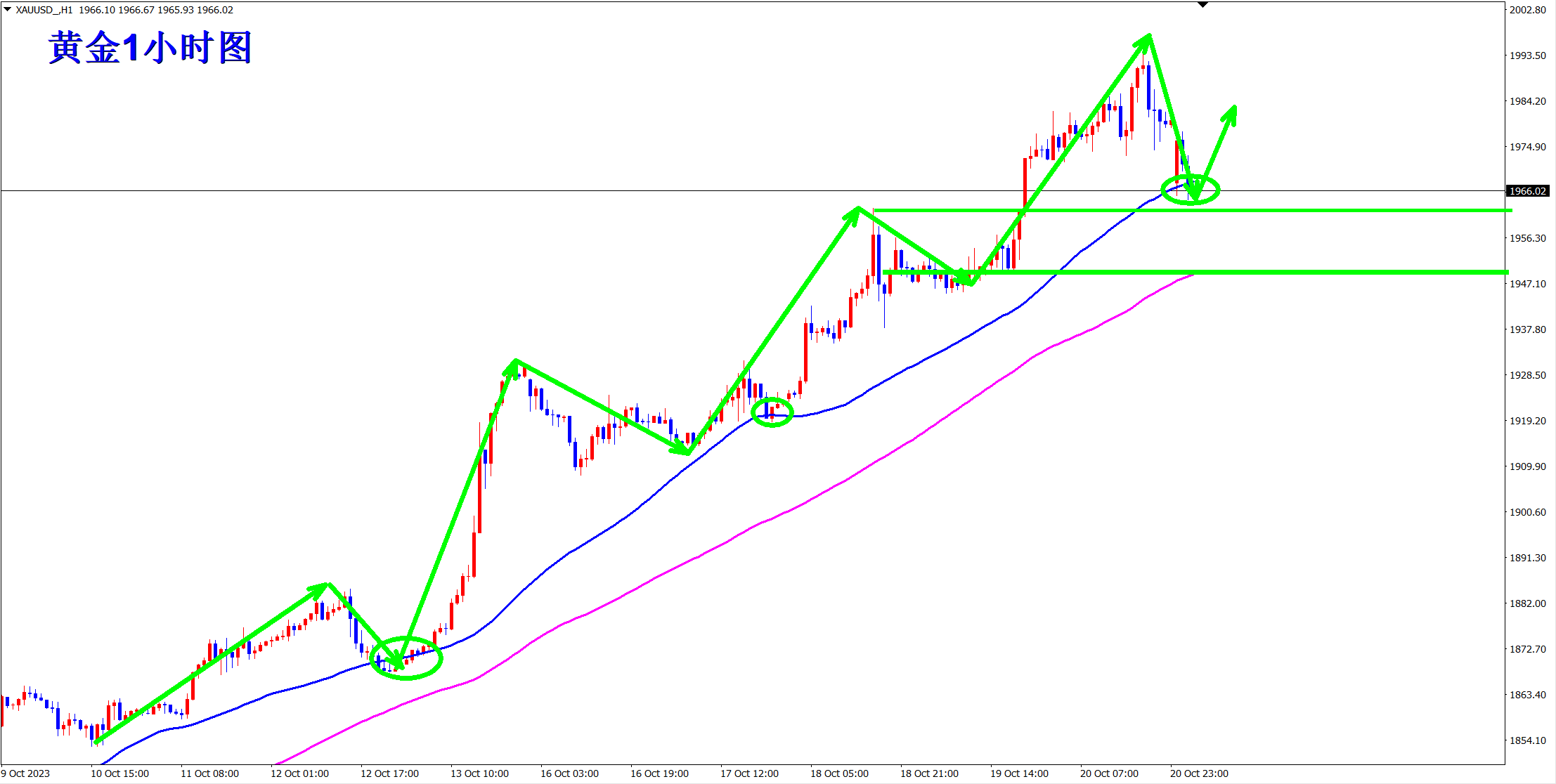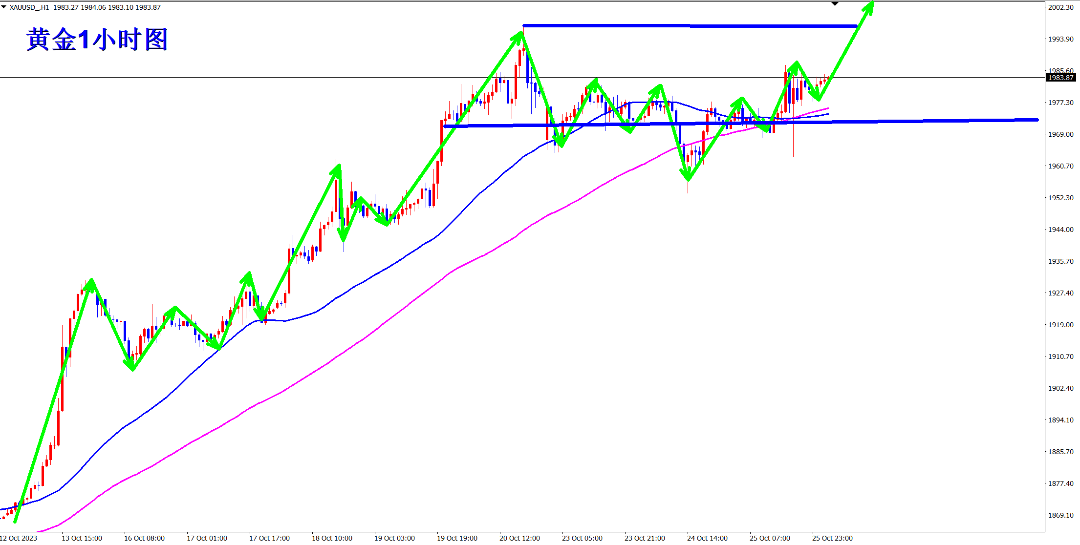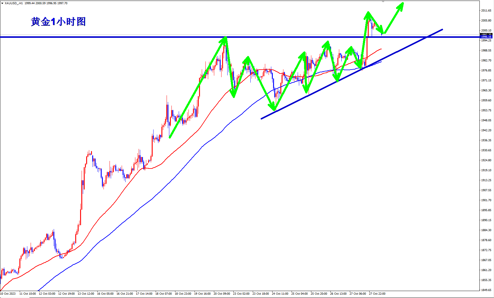 顺势轻飘飘,逆势乱糟糟!黄金继续上涨突破新高!王杨也一直顺势而为的策略,上周不断低多,周五终于大涨突破新高!当前涨势继续,早盘依托1993的支撑继续做多看涨! 趋势为王,点位致胜!当前涨势继续,操作上依旧低多看涨!黄金从1小时级别上看,均线由之前的粘合状态开始发散,意味着新的上涨趋势开始!均线