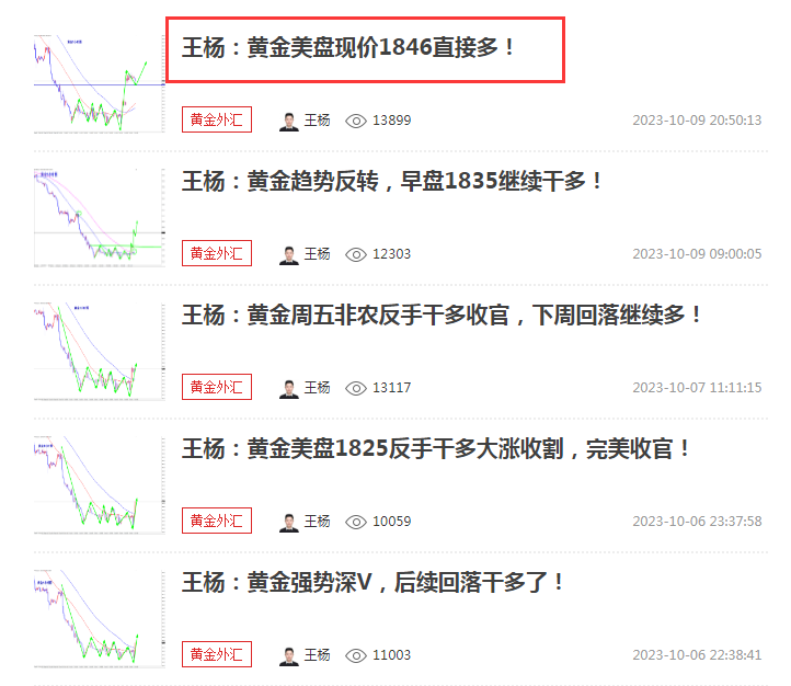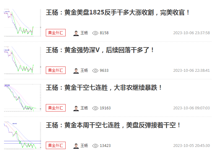 王杨上周先空后多,八胜一负,战绩斐然!王杨不仅是趋势交易者,对于拐点的把握也是非常到位!临盘应对,才能体现一个交易者的实力! 当前受到巴以冲突的影响直接跳空高开!其实趋势早已转变,消息仅仅是加剧了行情的表现!那么当前的黄金策略就一目了然了,干多! 接下来的黄金将开启多头上涨趋势,