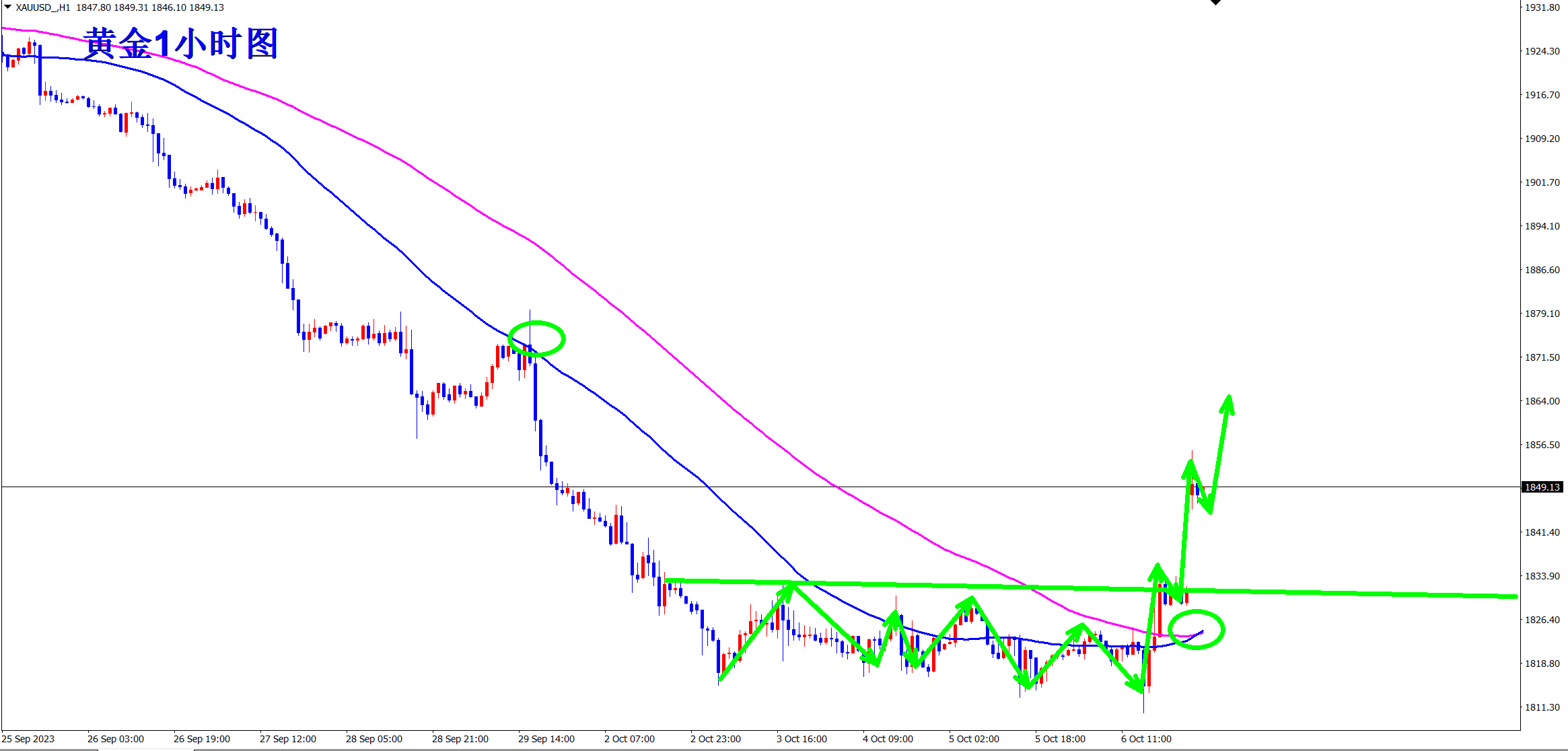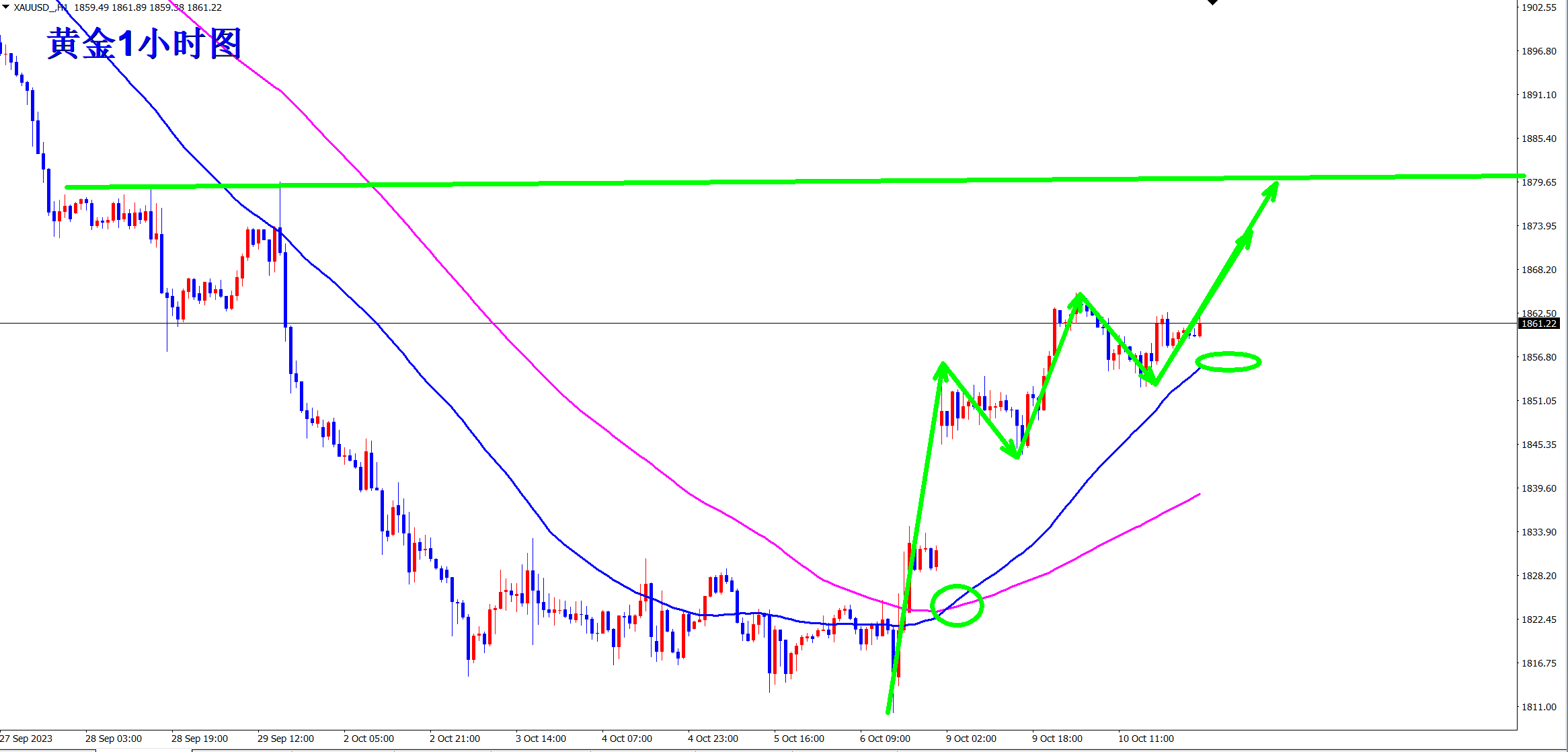 黄金当前明显的上涨趋势,操作上抓住回调果断多!当前的支撑1855,早盘依托此位置继续看涨! 黄金大非农数据后突破均线的压制,小时图上均线金叉,意味着趋势的反转!王杨也是及时转多,拿下两连胜!当前的k线受到均线的支撑,因为此前消息刺激,k线离均线太远,所以这两天进行震荡修正!但现在k线再次和均线重