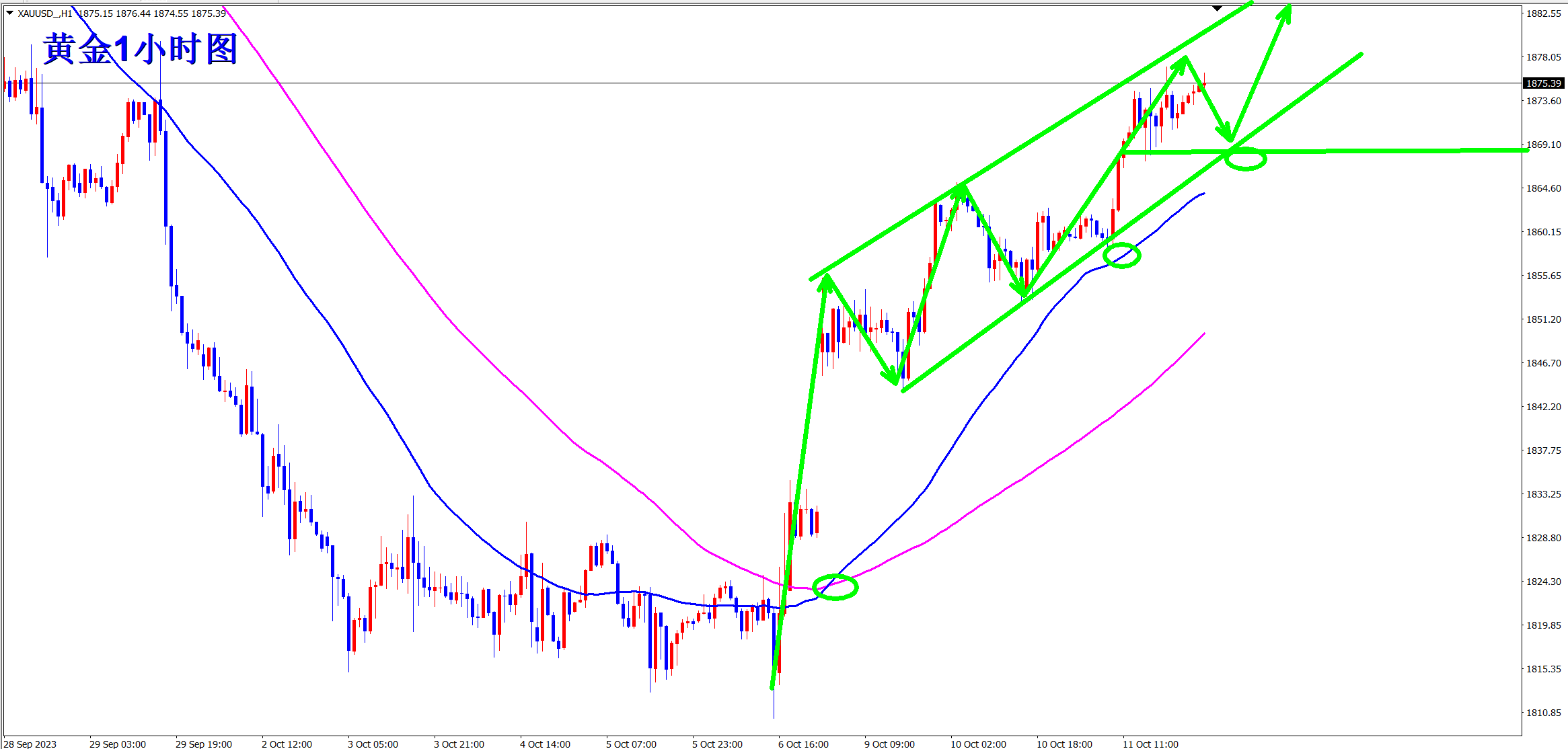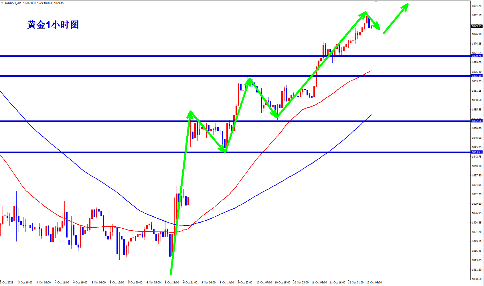 顺势轻飘飘,逆势乱糟糟!当前的黄金还是强势多头上涨趋势,我们干多已经拿下三连胜,今日还要继续干多,早盘回踩1868附近后直接多,看涨! 黄金从1小时级别上看,当前一直维持低点不断抬高,高点不断新高的趋势走势!明显的多头上涨趋势,当前的低点连线形成的有效支撑,将成为回落后我们再次做多有力防守!趋
