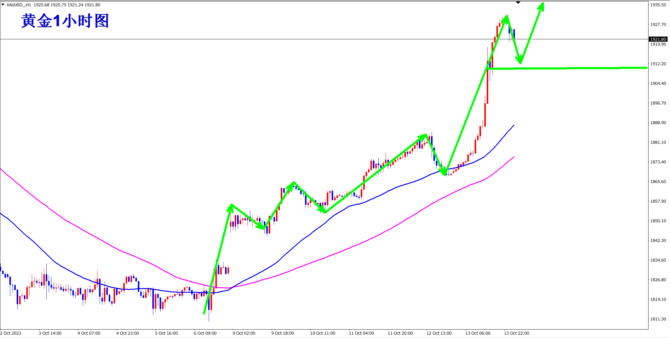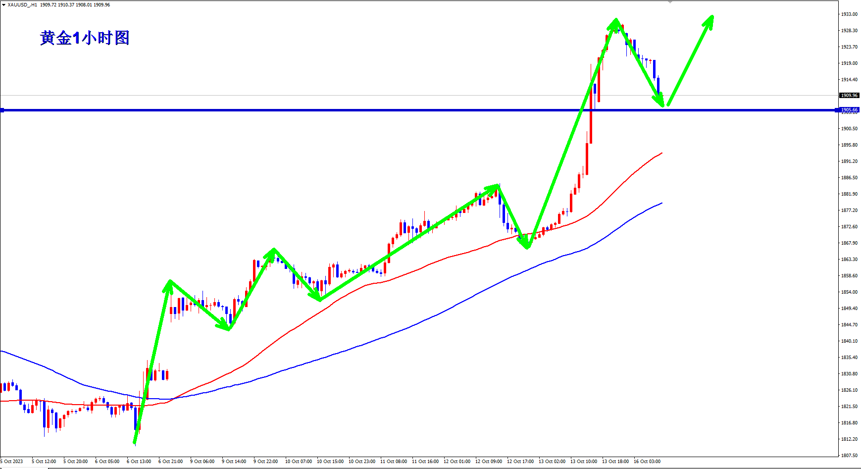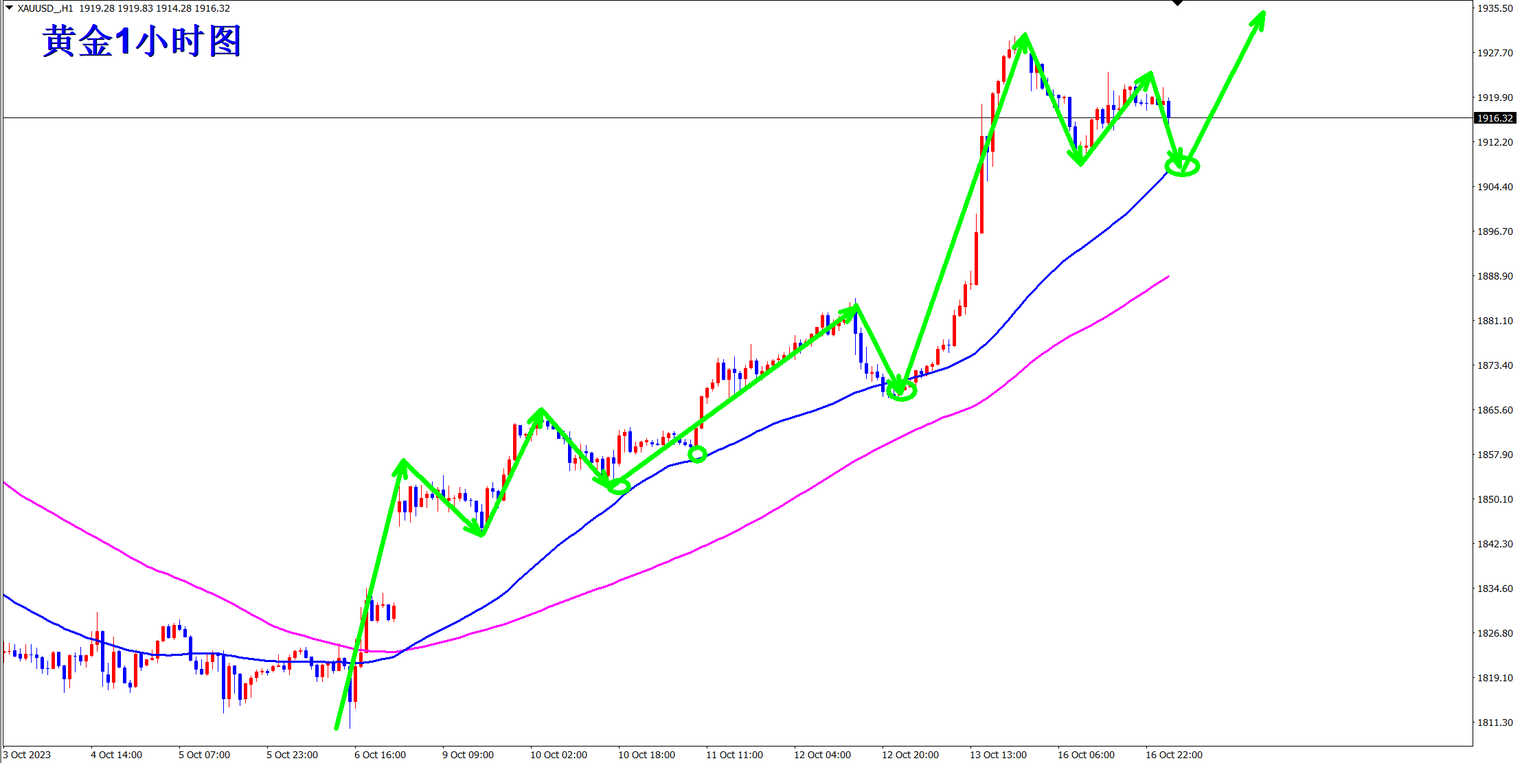 黄金当前还是上涨趋势没有改变,昨日1918多也如期上涨获利!当前黄金维持1905支撑上方运行,回调依旧是干多机会! 从1小时级别上看,黄金一直维持均线上方运行!每次回踩均线后就直接拉起!因为上周五黄金大涨,所以k线与均线距离较远!当前正好回踩支撑,日内触及均线后可以继续干多! 早盘依托1905