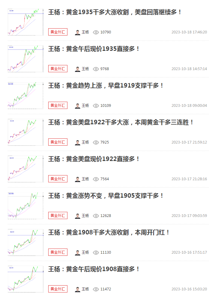 黄金昨日走势可谓一波三折,先是大涨突破新高,后又深度回踩!然后开始震荡!昨日王杨分别1935做多和1946多,都大涨获利收割!当前黄金涨势不变,早盘依托1938的支撑继续干多! 强势的上涨走势,操作上就要顺势而为!趋势为王,点位致胜!从1828到现在,王杨一直都是做多,一百多美金的大行情!没有人比王杨更