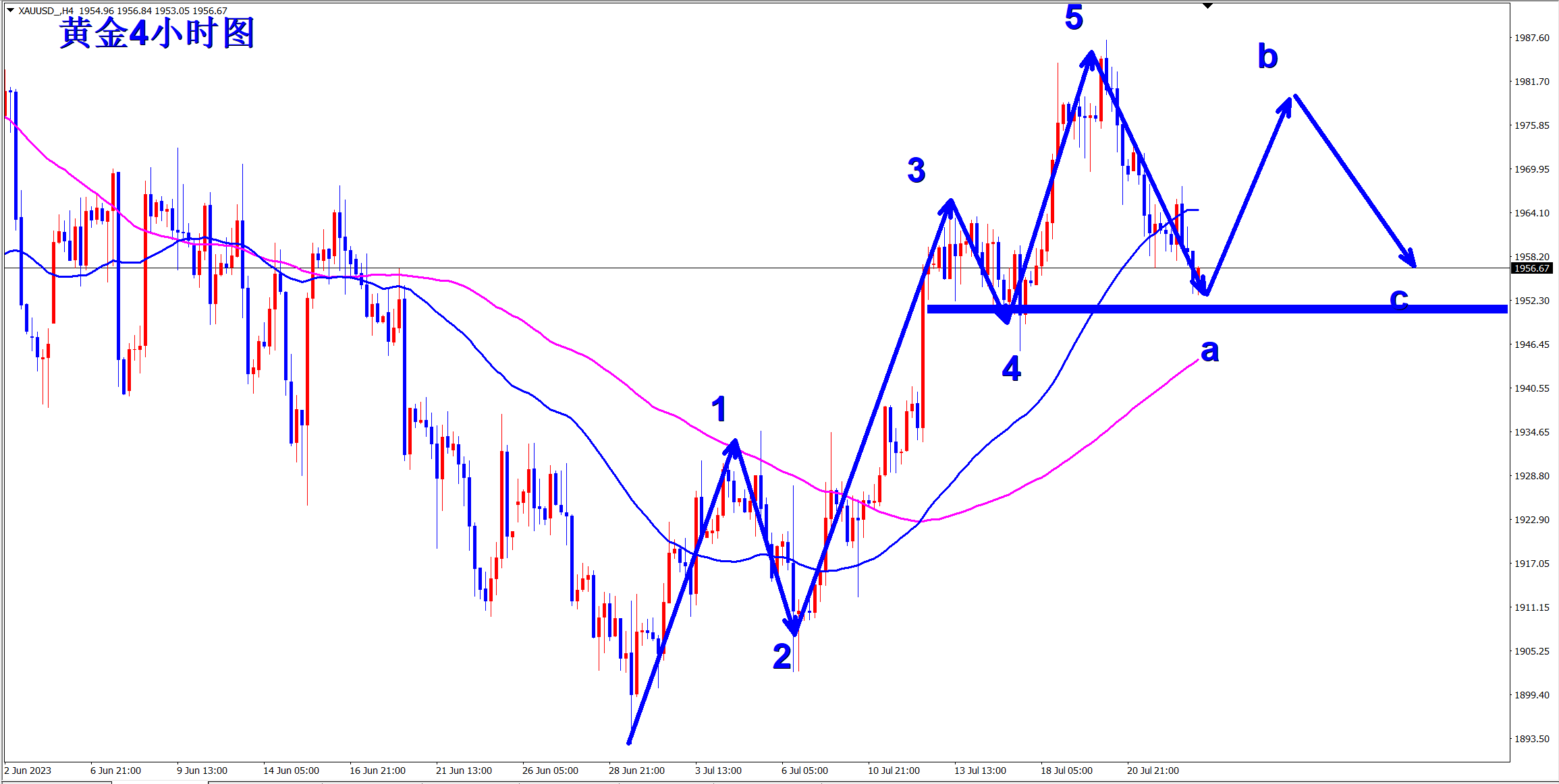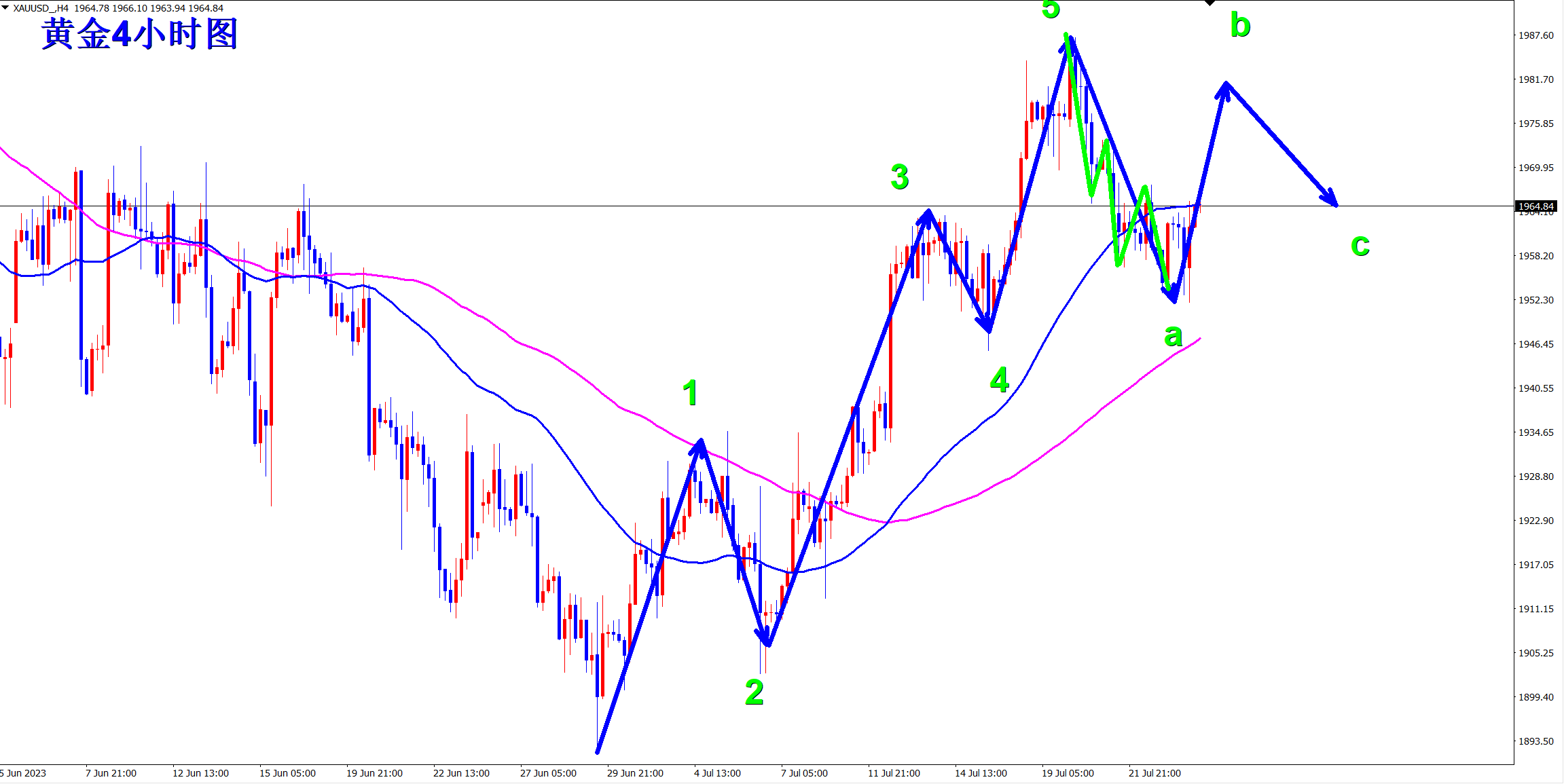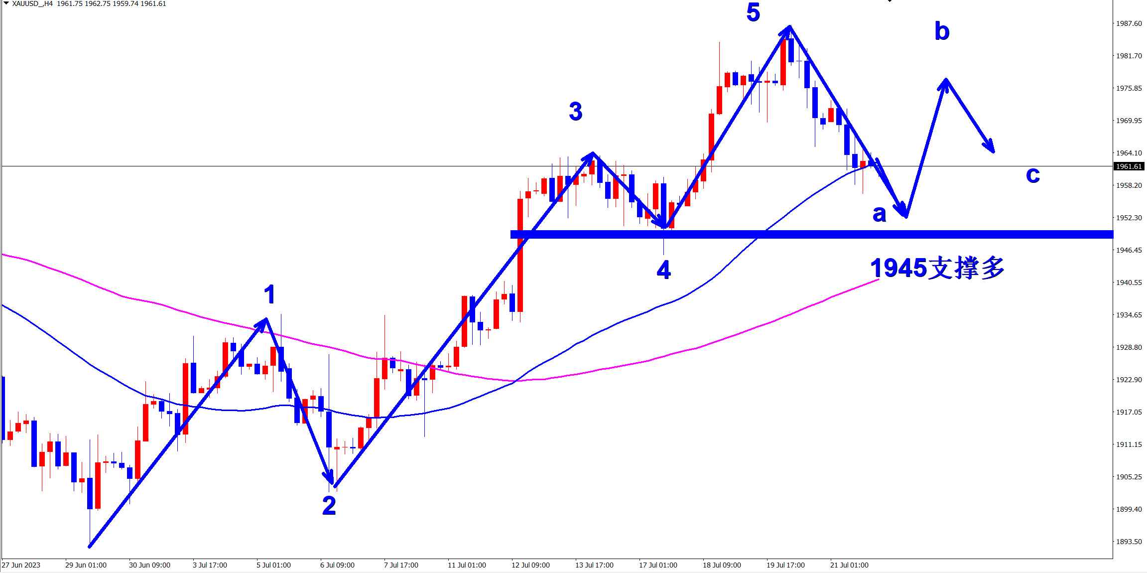黄金当前属于调整走势,a浪下跌已经完成,接下来进行b浪反弹!早盘依托1945的支撑,1950附近即可直接干多,看反弹! 黄金4小时级别上从1893位置开始上涨至1987一线,是明显的5浪上涨结构!因为1987位置遇阻,所以现在行情开启调整走势,大概率将会是abc的调整浪,而现在a浪下跌已经完成! 当前开启b浪反弹,操