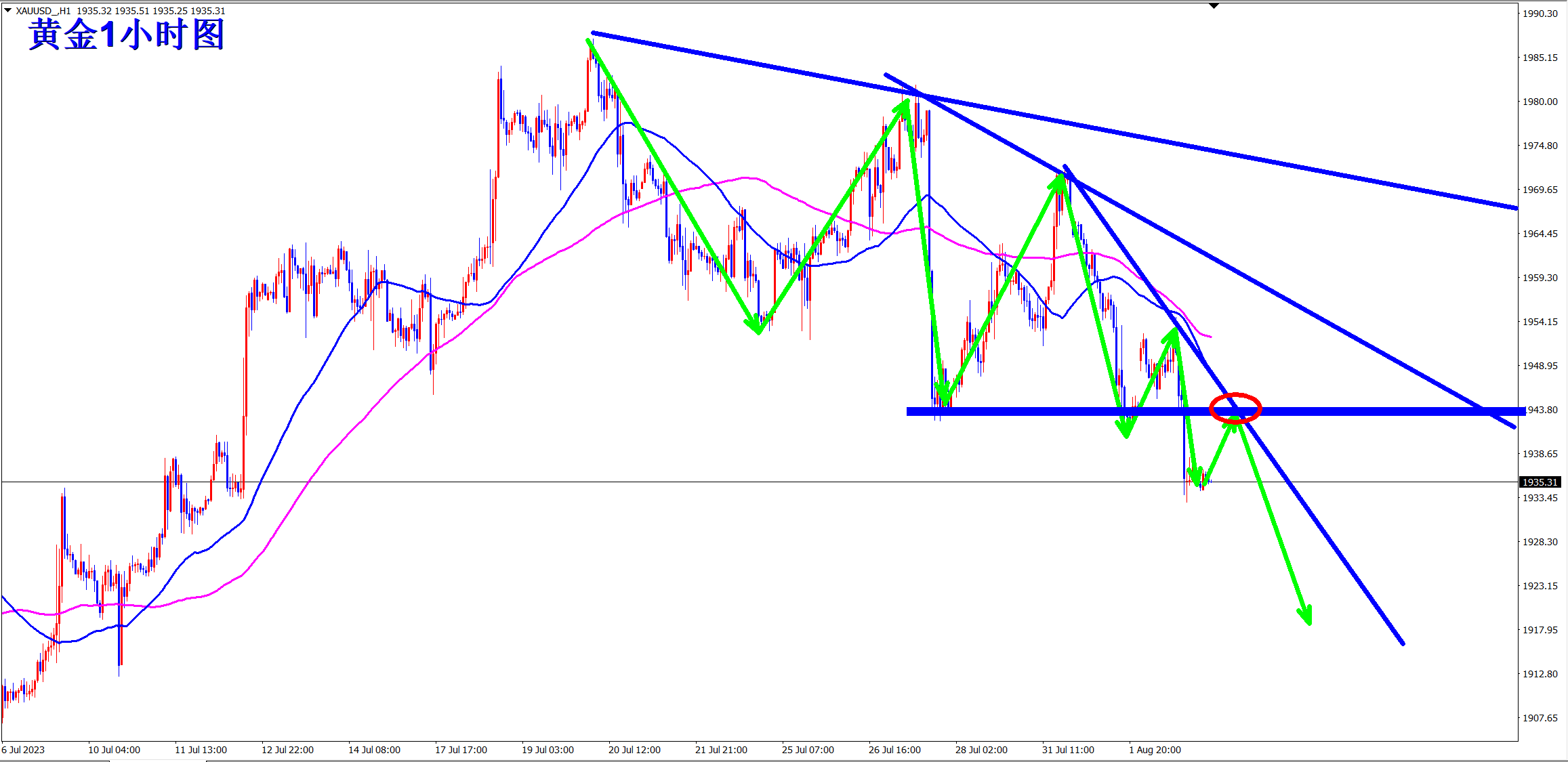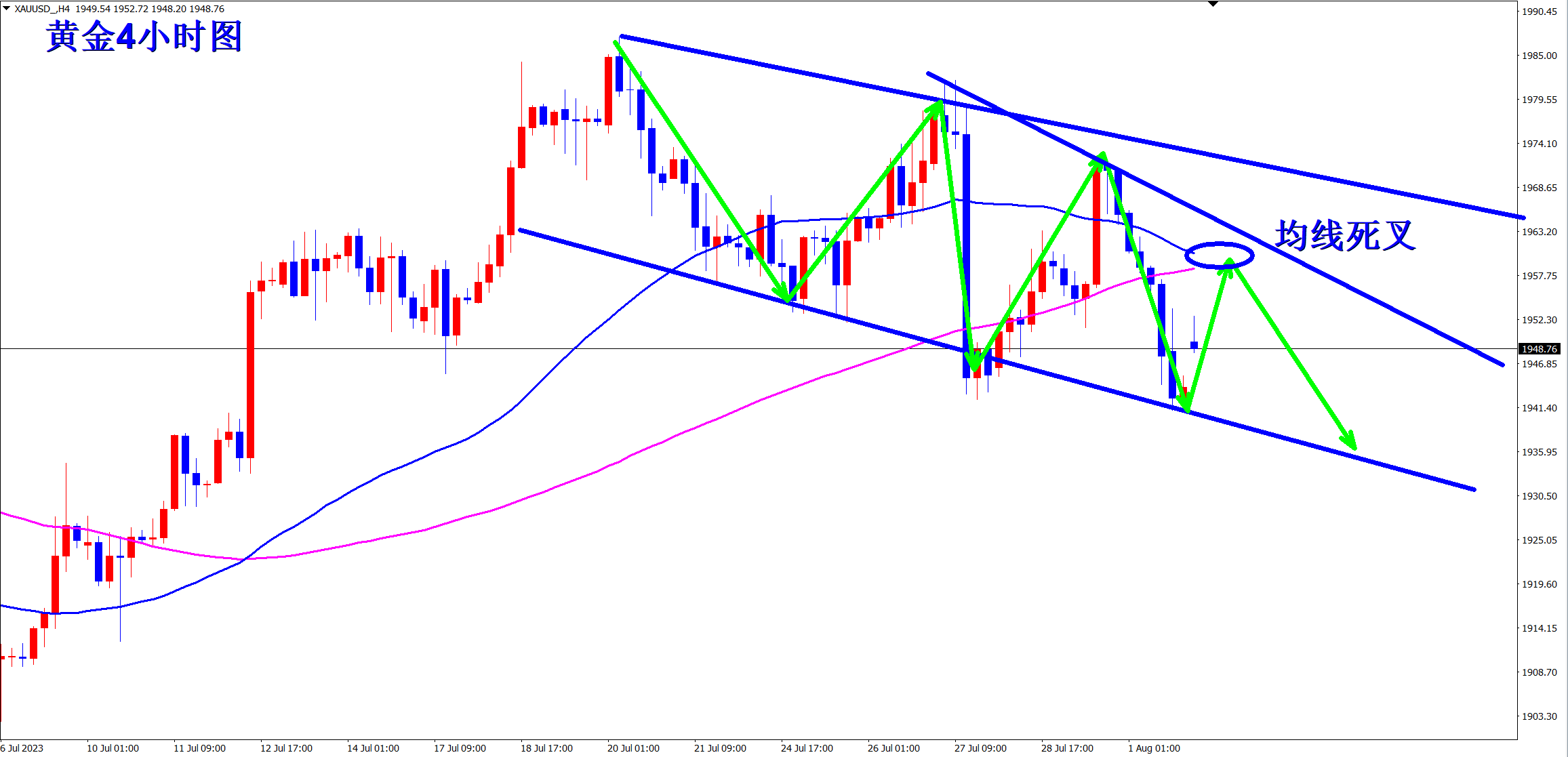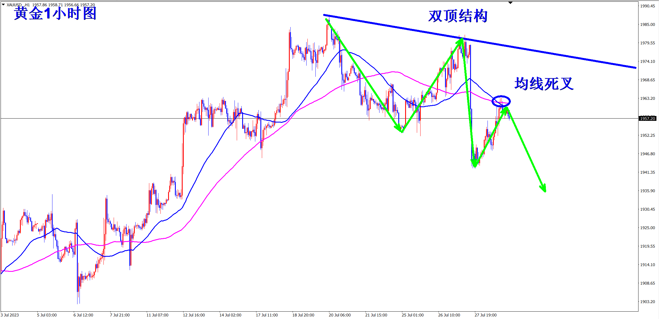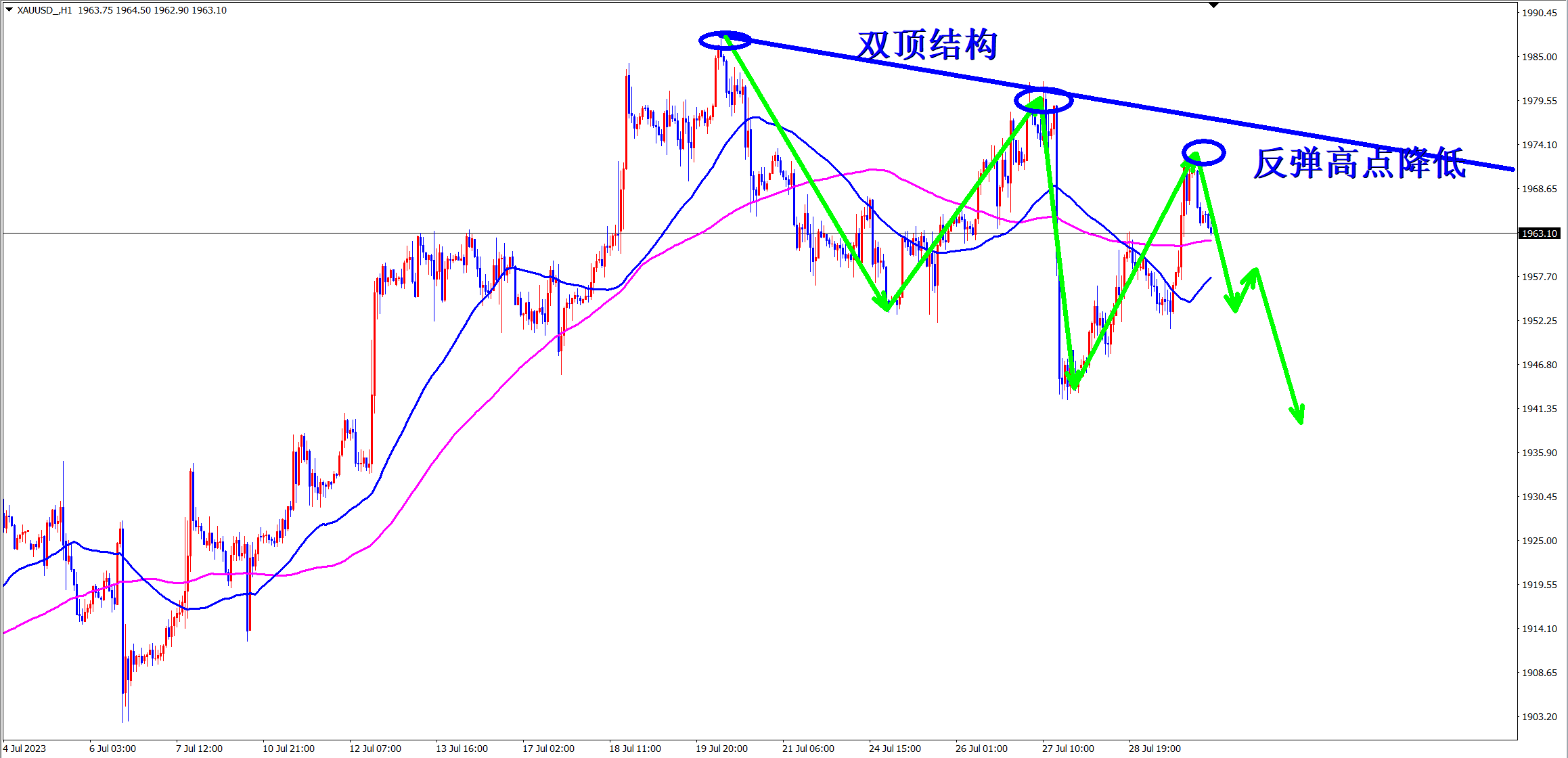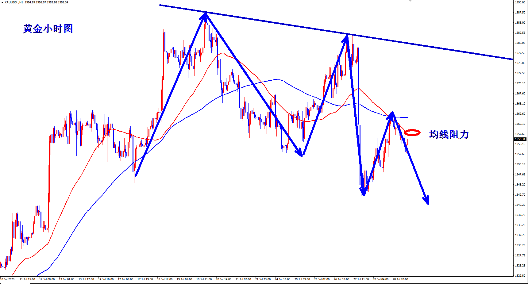 黄金昨日继续破位下跌,空单再次暴跌获利!顺势轻飘飘,逆势乱糟糟!跟上王杨的节奏,顺势而为,轻松拿下!当前跌势延续,早盘依托1944的压力干空! 黄金小时级别上可以看出明显的下跌趋势,自从高位构建双底结构后,行情一路震荡下行!而且通过高点的连线可以看出,反弹的高点再不断的降低,斜率越来越大,说明行