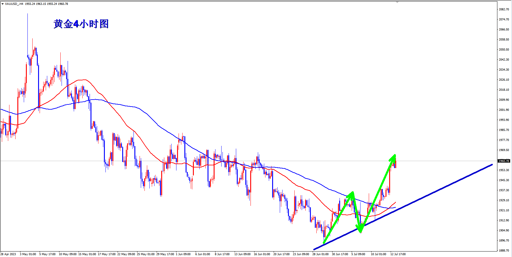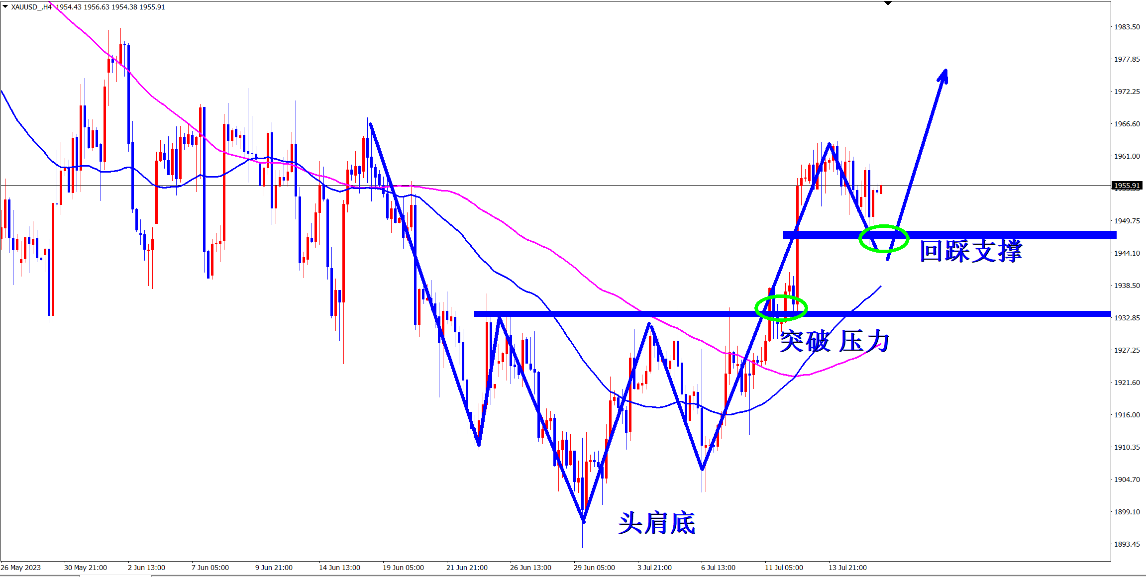 黄金当前继续上涨趋势,回撤依旧是干多机会,早盘依托昨日回踩低点1945的支撑继续低多看涨!上方压力关注1970! 黄金4小时级别形成头肩底形态,突破后经过回踩确认!底部结构成立!下跌趋势结束,当前开启上涨趋势!顺势轻飘飘,逆势乱糟糟!当前涨势继续,昨日经过回撤蓄势后,今日重启涨势! 多,早盘支撑位