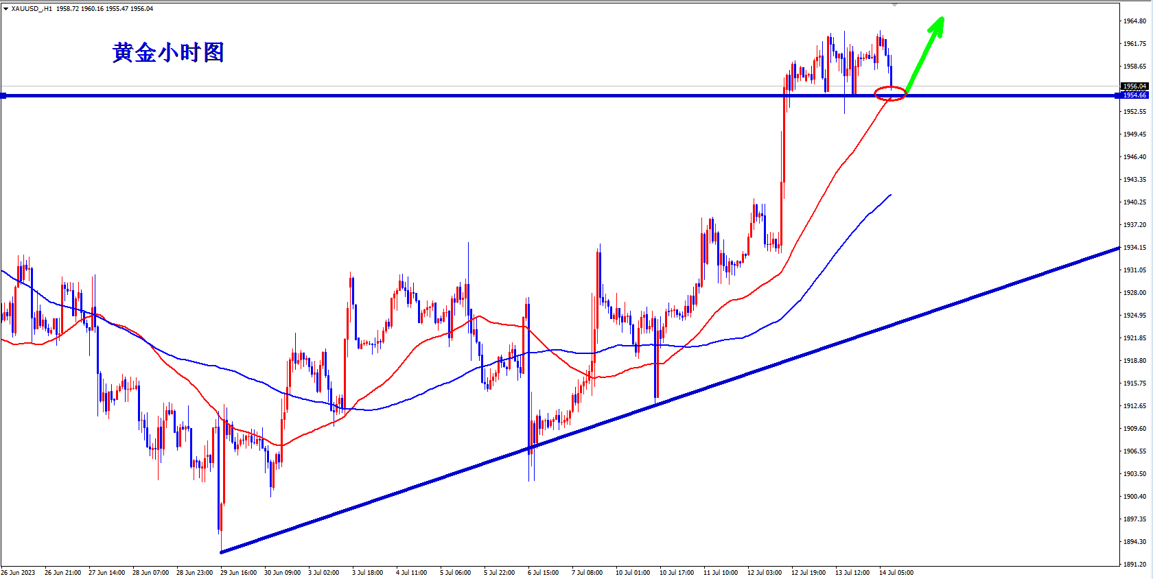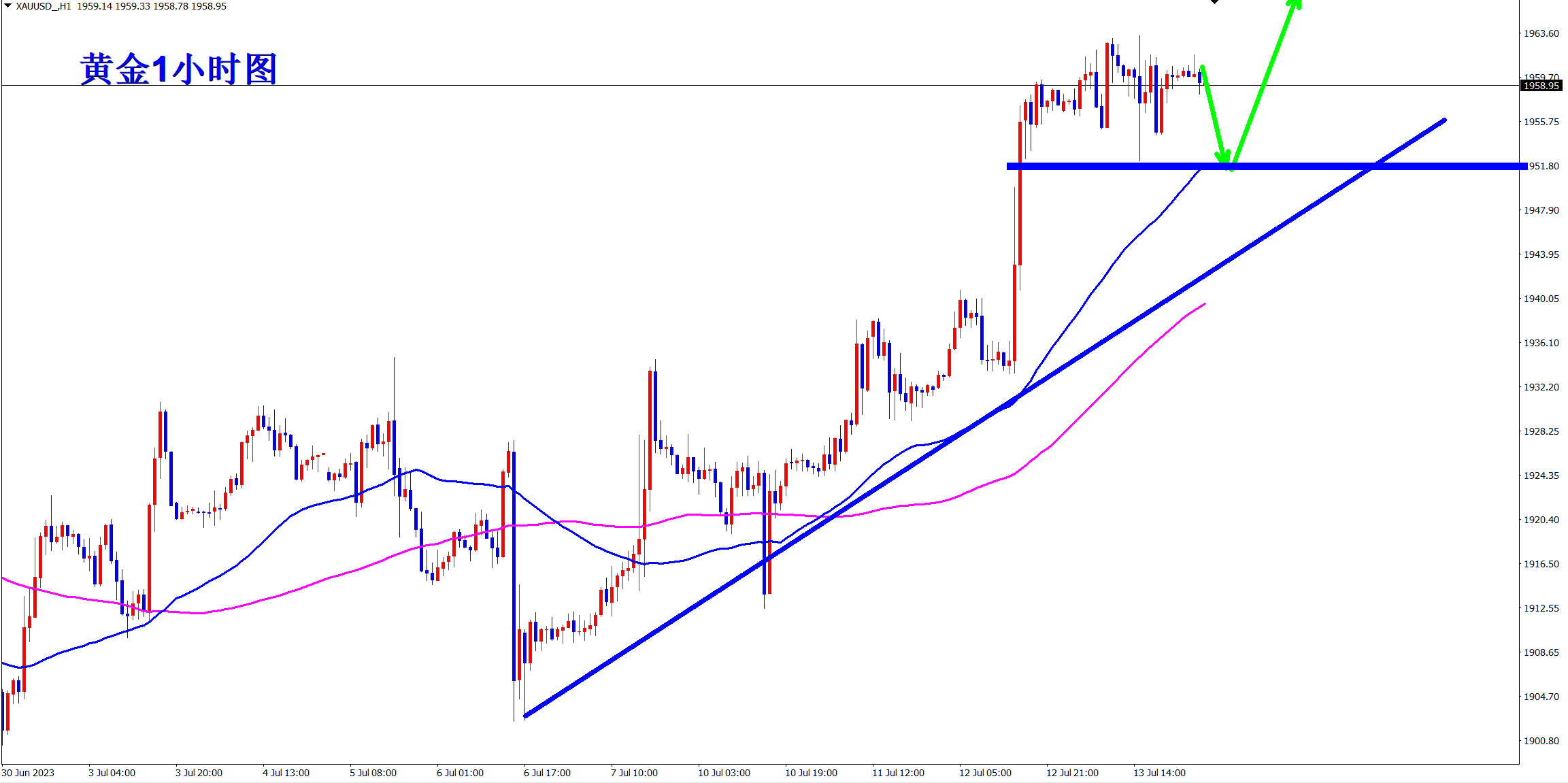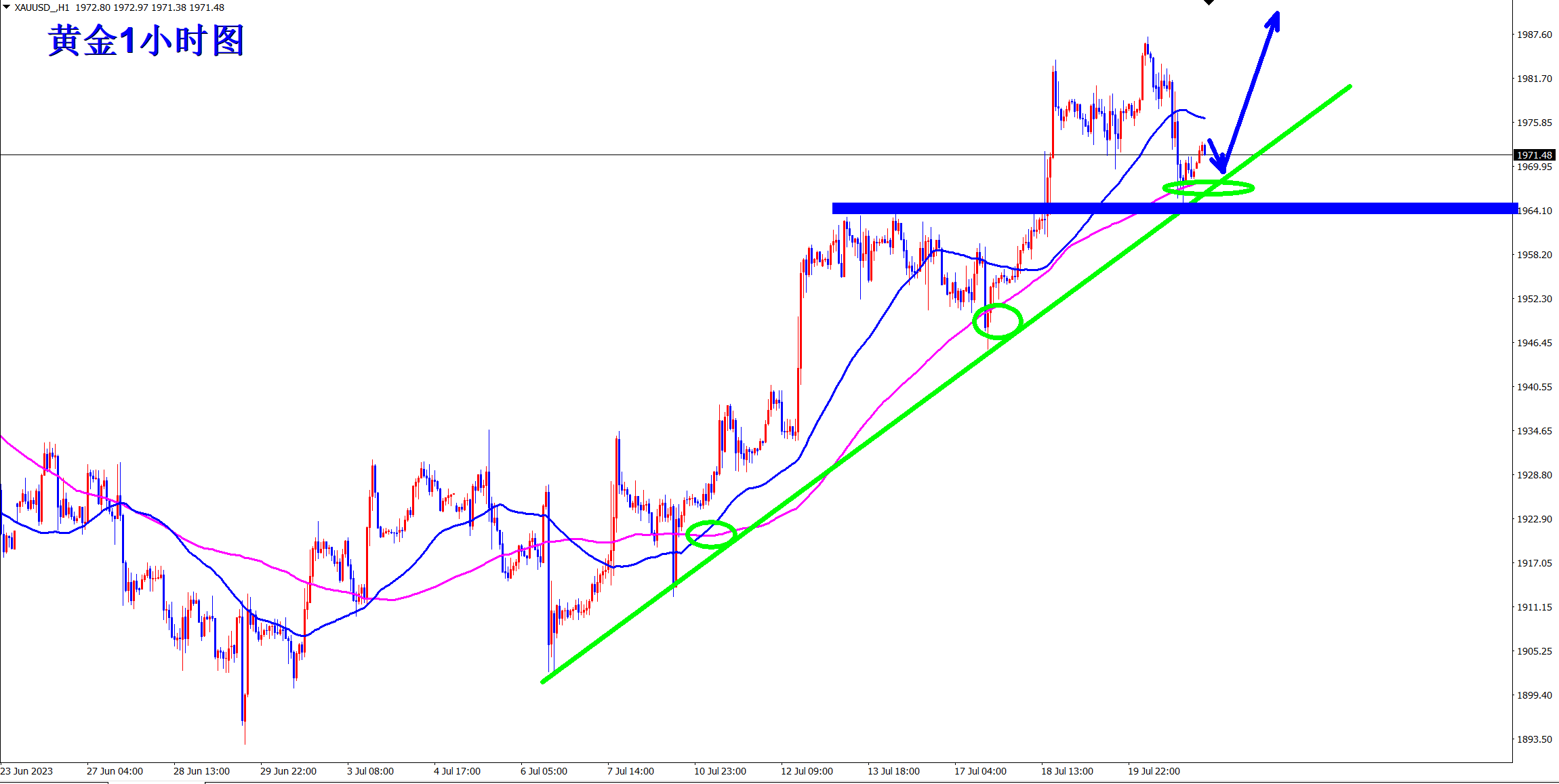 黄金当前还是上涨趋势,当前回踩支撑位置,并且获得支撑,早盘依托1964位置干多看涨! 黄金1小时级别上震荡上扬,低点连线形成上涨趋势线!支撑行情不断上移!昨日行情正好回落支撑位置,并且站稳!而且当前的行情并没有跌破均线的支撑,虽然昨日大跌,但属于数据利空后的消息刺激!均线没有形成死叉! 多头上