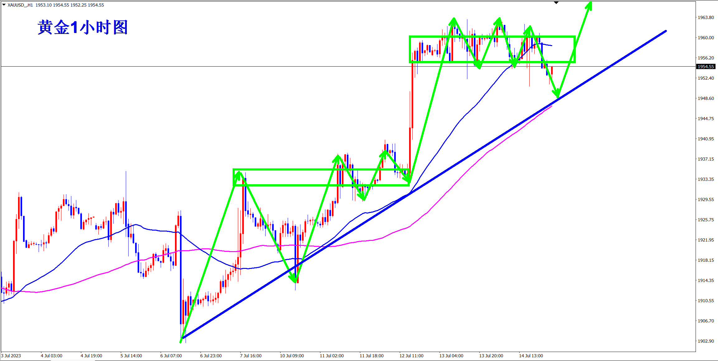 黄金还是多头趋势,黄金午后现价1955直接多! 黄金1小时受上行趋势线支撑,同时均线金叉向上多头排列,均线支撑短线就在1955附近,午后黄金1955直接干多。 不要一点点回调就慌,觉得趋势就变了,没有只涨不跌的市场,也没有只跌不涨的市场,回落刚好是给继续干多的机会。 欧盘操作思路 黄金1955