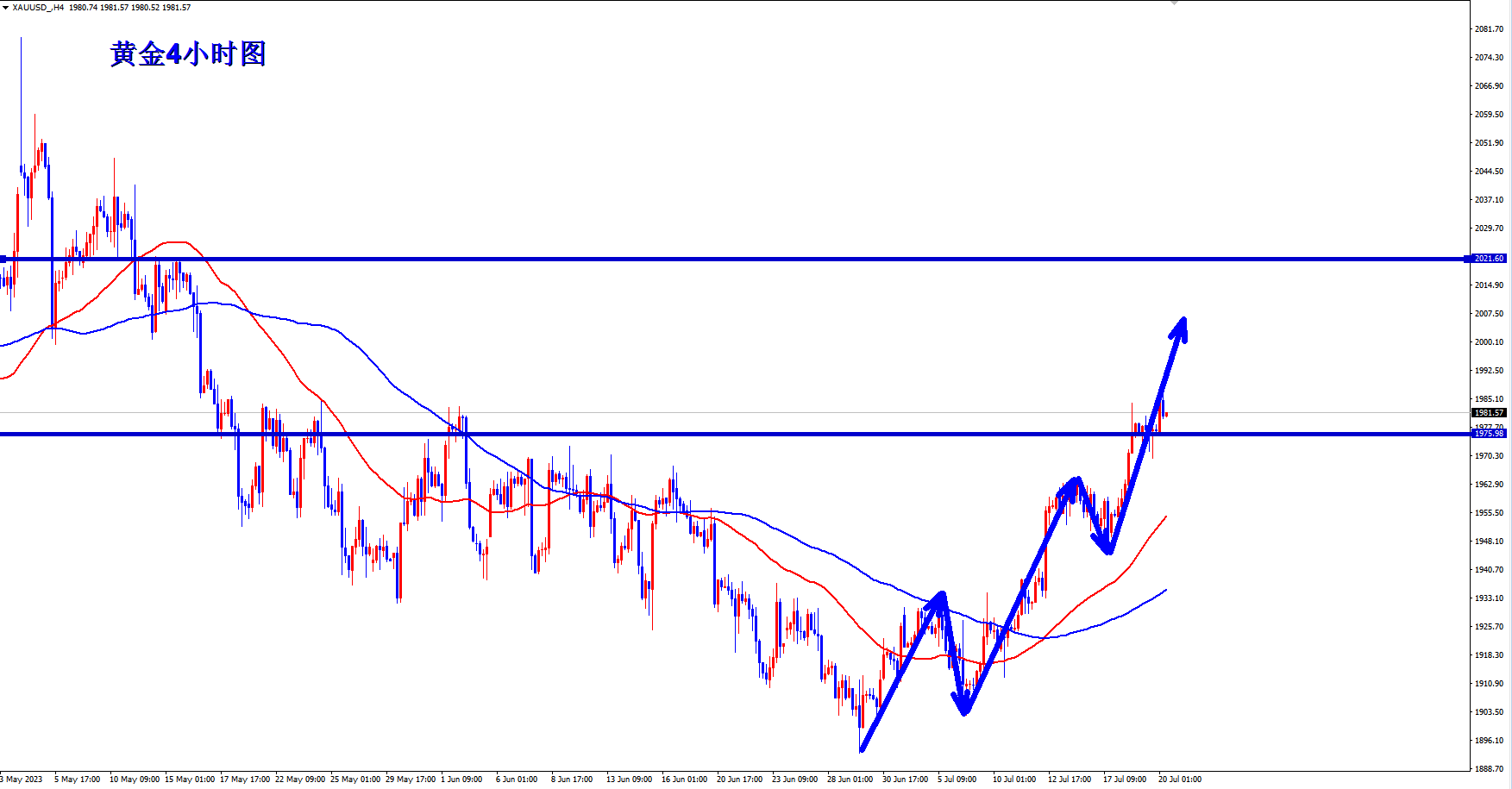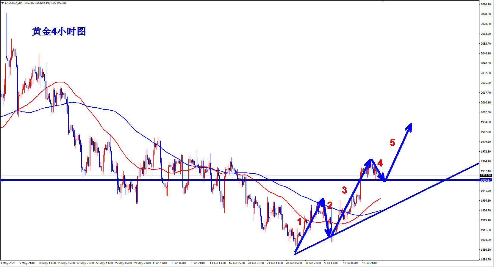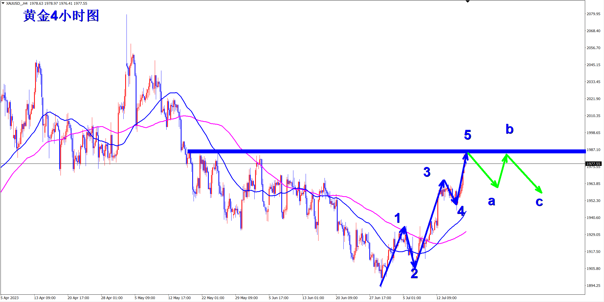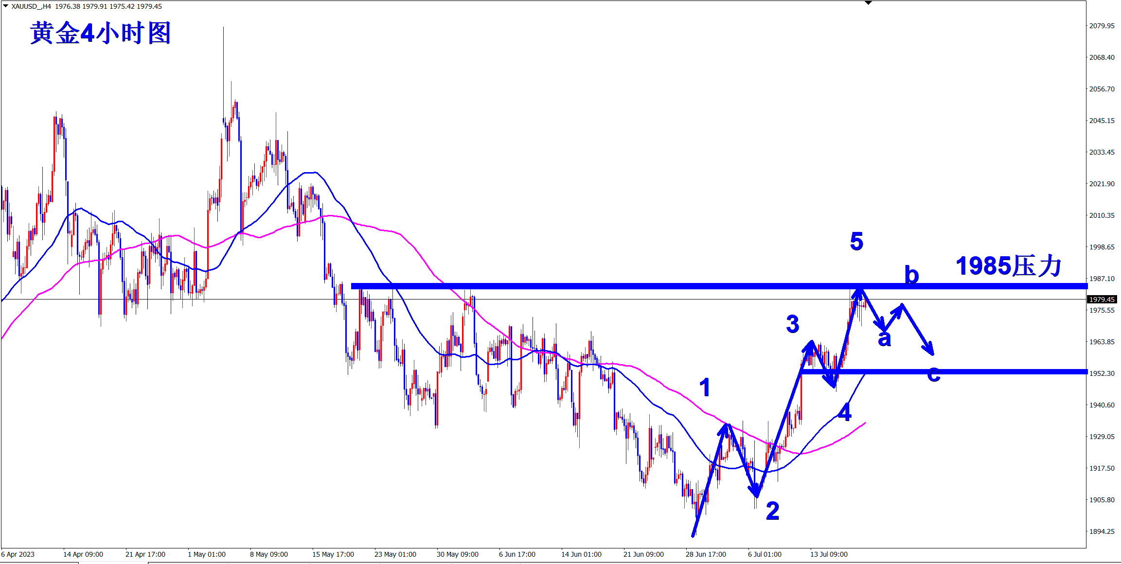 黄金1985突破了,咋弄?那就不要再空了,既然黄金突破了1985,接下来就要测试下一个阻力位。黄金1980先做多了。 黄金4小时五浪上涨的结构没有变化,只不过第五浪到底在哪里结束的问题,首先黄金第一次选择在1985附近是前期的近两个月的高点,选择在这个地方结束也是合理的,不过黄金现在既然突破了。那么就要寻找下