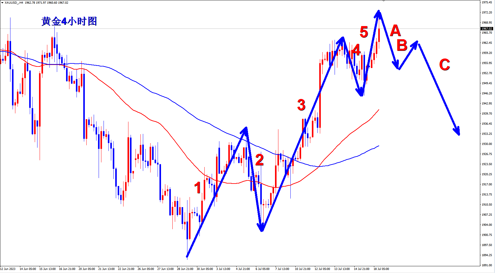 黄金美盘零售月率利多,不过黄金没有延续上涨,利多不涨看跌,黄金已经两次冲高回落了,黄金1968现价直接干空。 黄金4小时五浪上涨,目前已经处于第五浪,已经不再适合高位追多了,黄金今日两次突破1970之后冲高回落,说明1970上方阻力还是比较大,而且高点一次降低,黄金从1892反弹开始4小时5浪上涨完成,向上即使