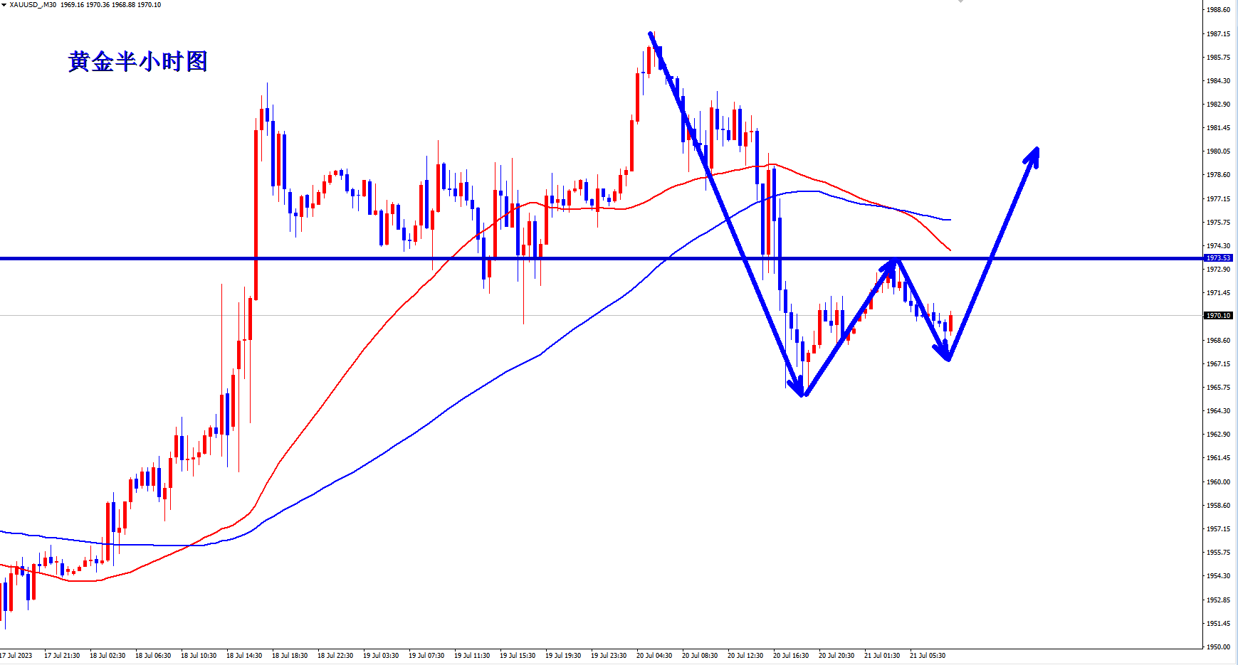 黄金午后现价1970直接多! 黄金4小时上涨趋势线还没有被破坏,黄金午后下探,黄金半小时小双底,如果突破颈线位1974,黄金将直接大涨,午后现价1970直接先多,黄金只要不破昨日低点1965,半小时小双底结构,还是看涨为主。 黄金4小时来说即使五浪上涨结束,那么黄金也存在B浪的反弹,只有B浪反弹不破新高1988
