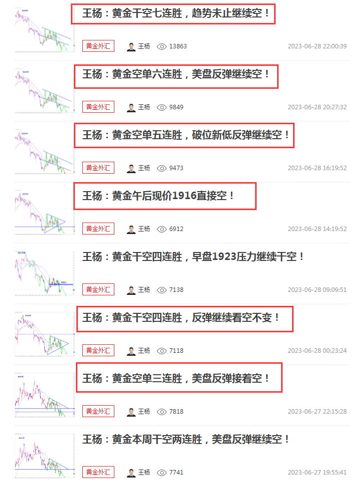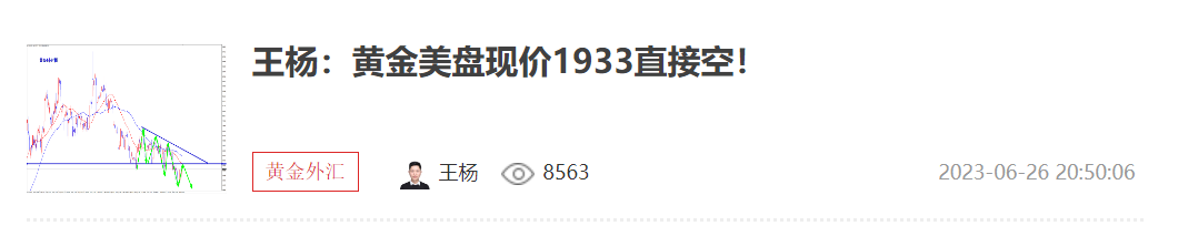 黄金昨日美盘直线跳水,王杨分别两次在1927位置干空,位置干空,如期暴跌收割!本周干空已经四连胜!当前跌势依旧,早盘1923压力还是空!继续看跌! 黄金的走势王杨已经说了无数遍,月线三重大顶,日线上更是不断地震荡下行!空头跌势非常明显,从2070位置,我们也是一路高空!例如最近两天的震荡调整过程中,