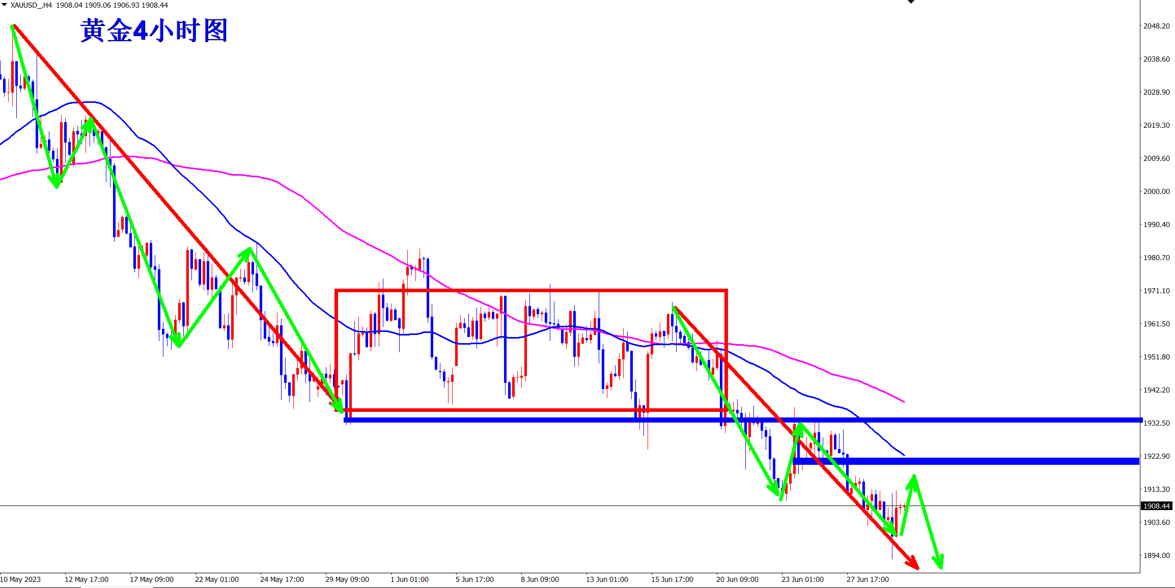 黄金趋势下跌虽然没有结束,但短线获得支撑,行情将会进行震荡调整,然后再开启新的波段下跌!短线行情将维持1910-30区域内震荡,今日区间内高抛低吸操作,1910支撑多,1930压力空! 黄金月线三重大顶后,不断震荡下行!到目前为止,行情还没有出现反转,只有行情突破1930压力,我们才会改变看跌的思路!顺势而为,