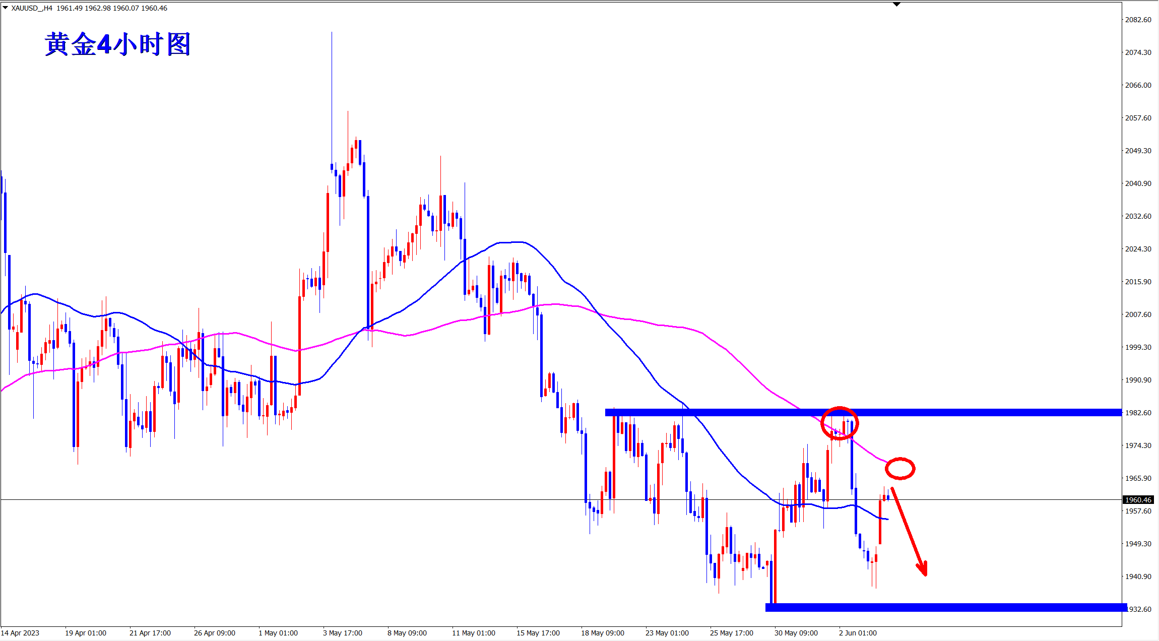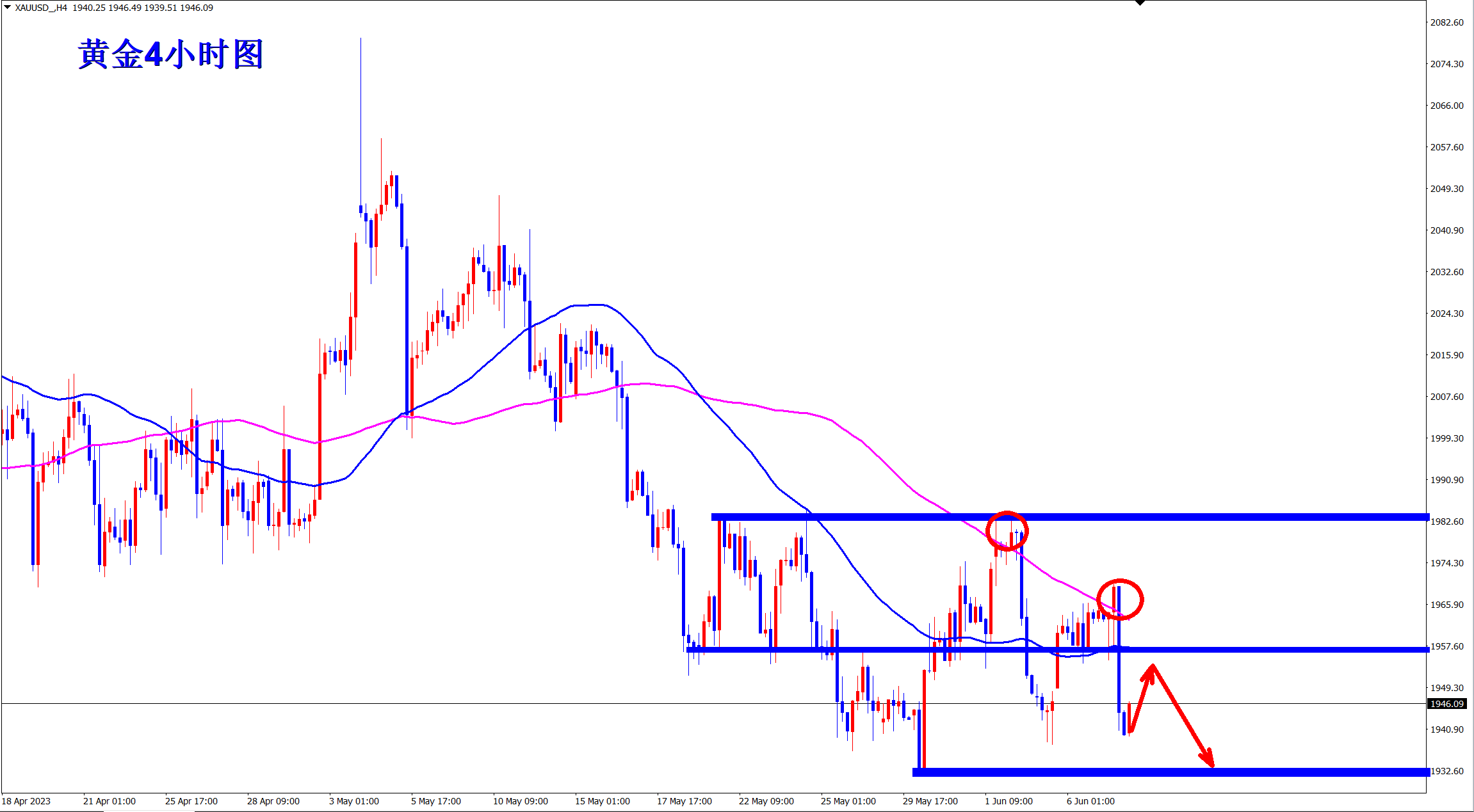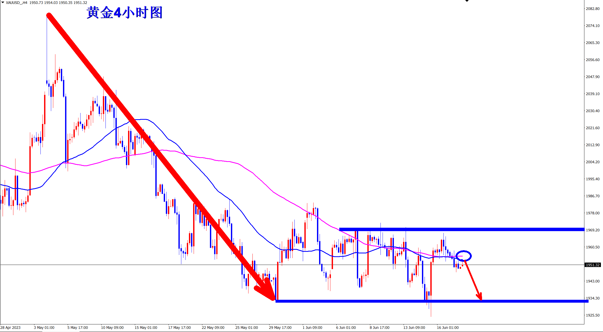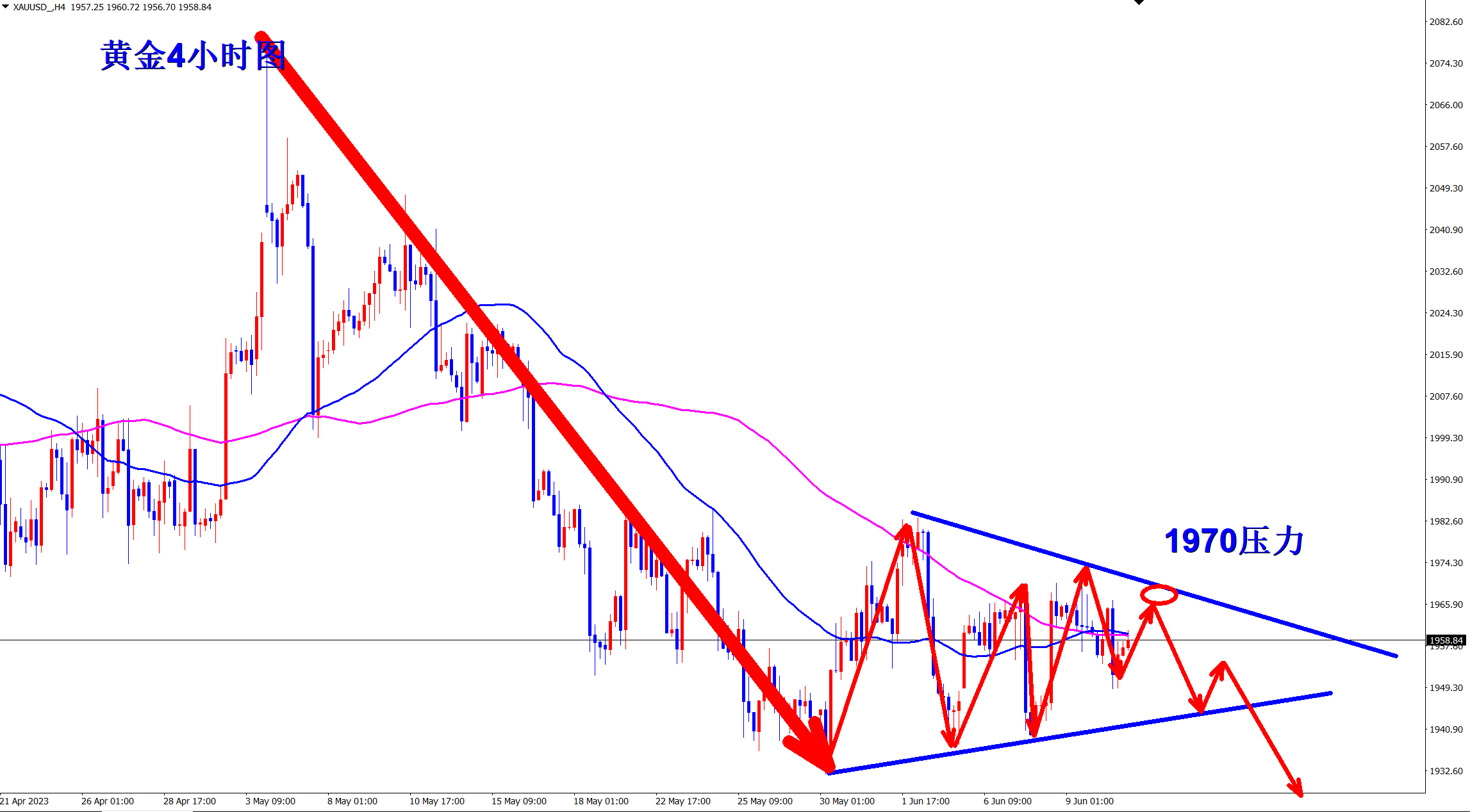 黄金整体还是下跌趋势,短线震荡!昨日王杨现在1943位置坐了一个反弹多单,如期上涨获利!但上涨并没有真正突破1965的关键压力位置,还是空头,所以今日还需继续做空,1965压力下继续干空! 黄金4小时上看,属于下跌趋势不变,因为现在的反弹依旧受到长期均线的压制!趋势不变,顺势交易,反弹都是再次做空的机会!