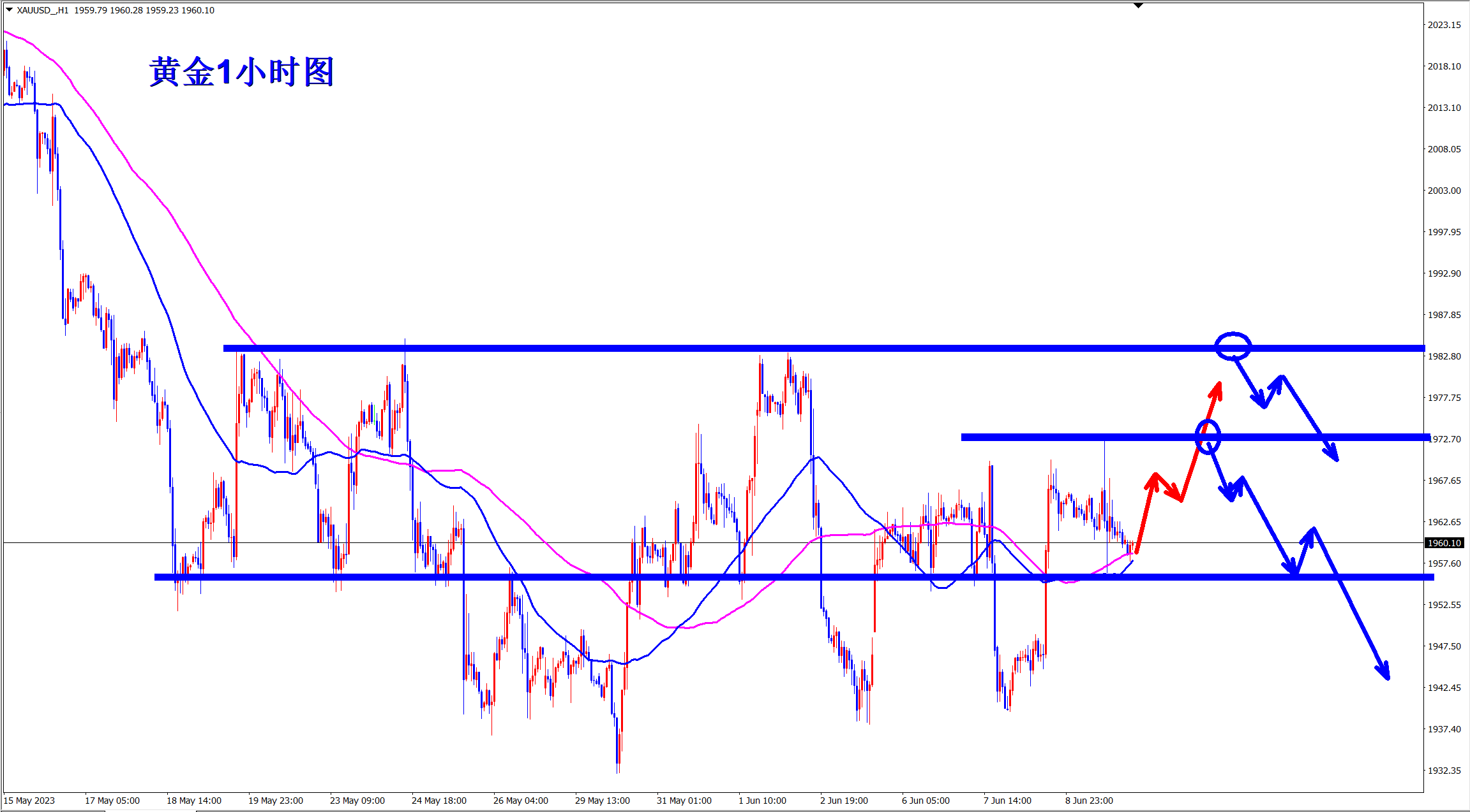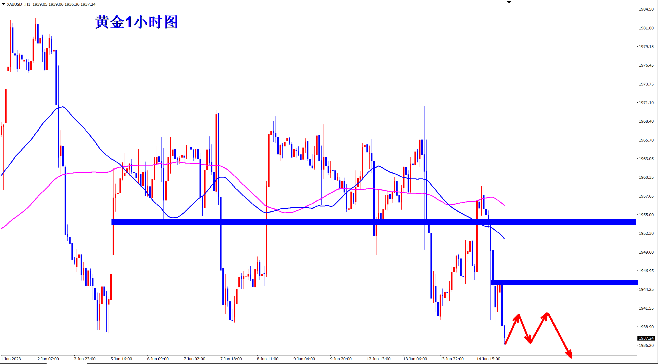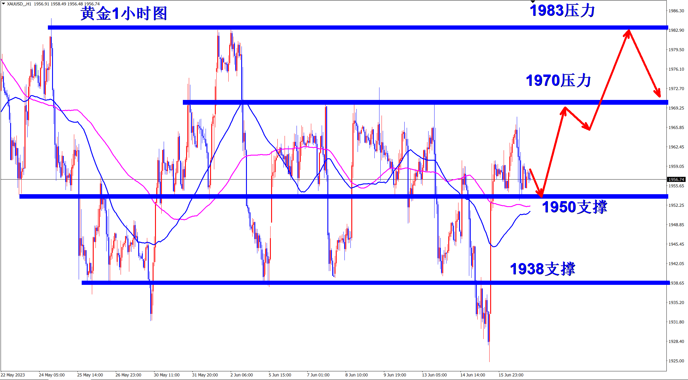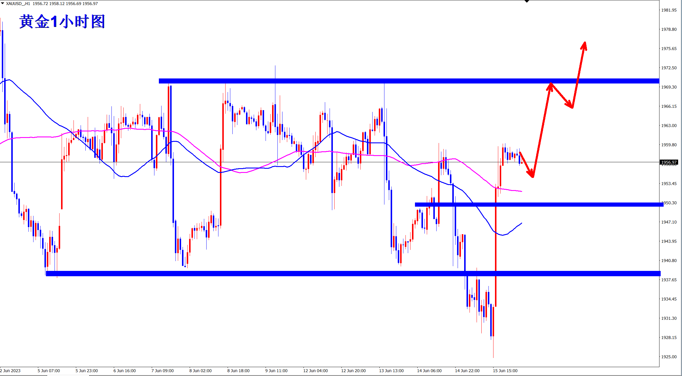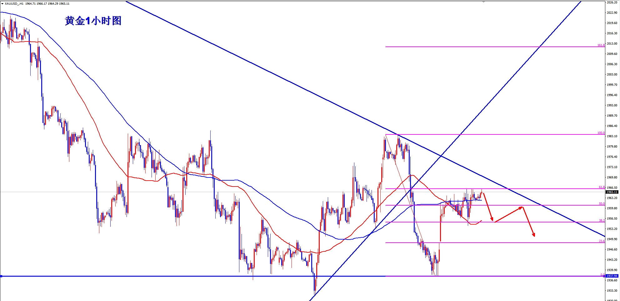 黄金当前反弹,早盘先依托1950的支撑低多看涨,反弹遇阻后再空! 当前的黄金大周期上依旧是空头下跌走势,周线三重大顶,日线上更是不断地新低,短线上黄金则是处于1940-80的大区间震荡过程中,这是属于下跌中继形态!震荡后必将再次下跌新低! 当前黄金探底后快速重新回到区间内继续震荡,现在反弹继续,日内