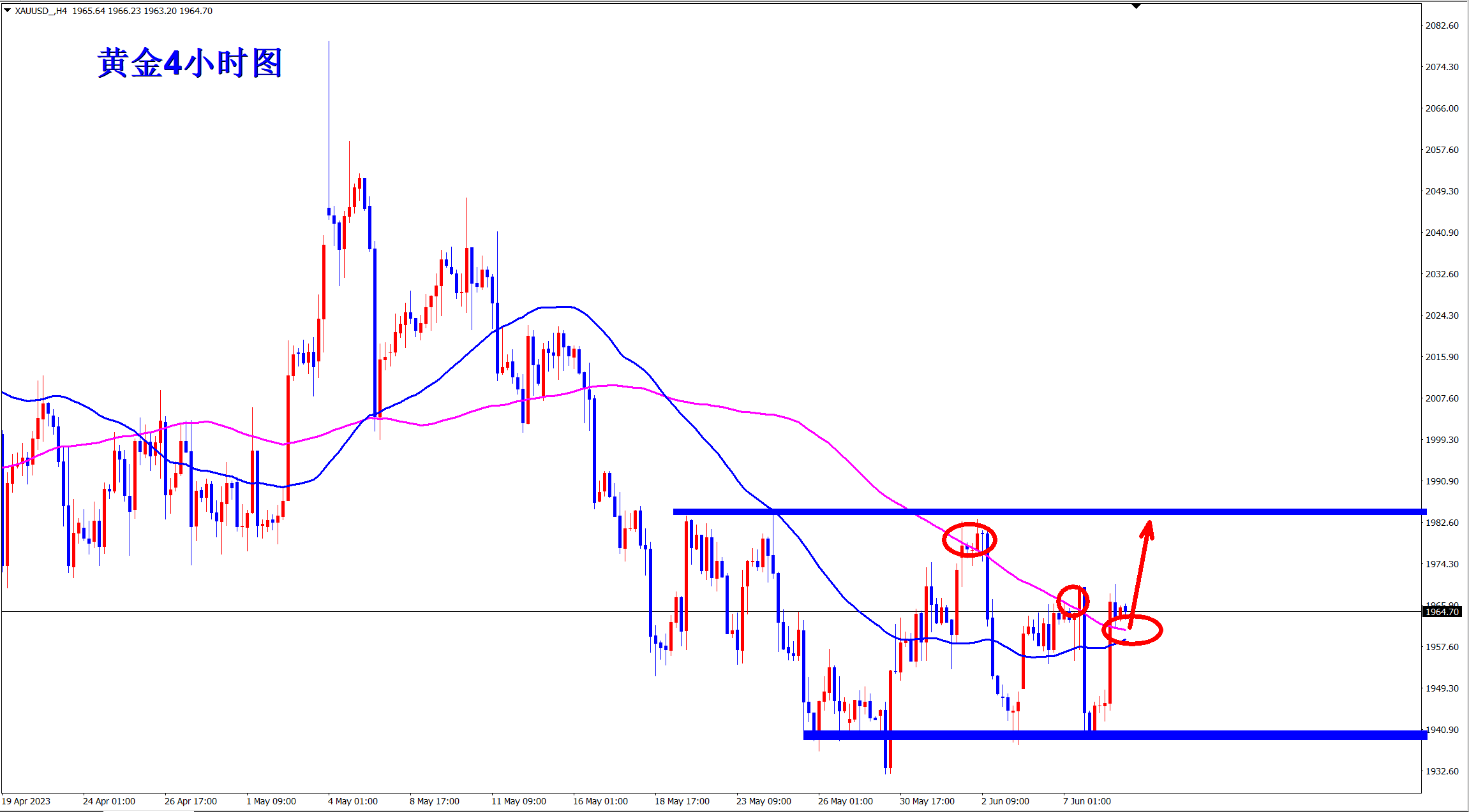 黄金昨日直线拉升,深V反转,并且再次站稳在均线上方,行情转多,今日1958的支撑做多看涨,上方目标1980! 黄金从4小时级别上看,此前一直是下跌趋势!当前在底部盘整震荡,昨日行情再次强势拉升,再一次突破了均线的压制!此前已经有两次突破记录,但是最终都是大阴线直接杀跌!所以这一次尤为关键,如果能回踩站