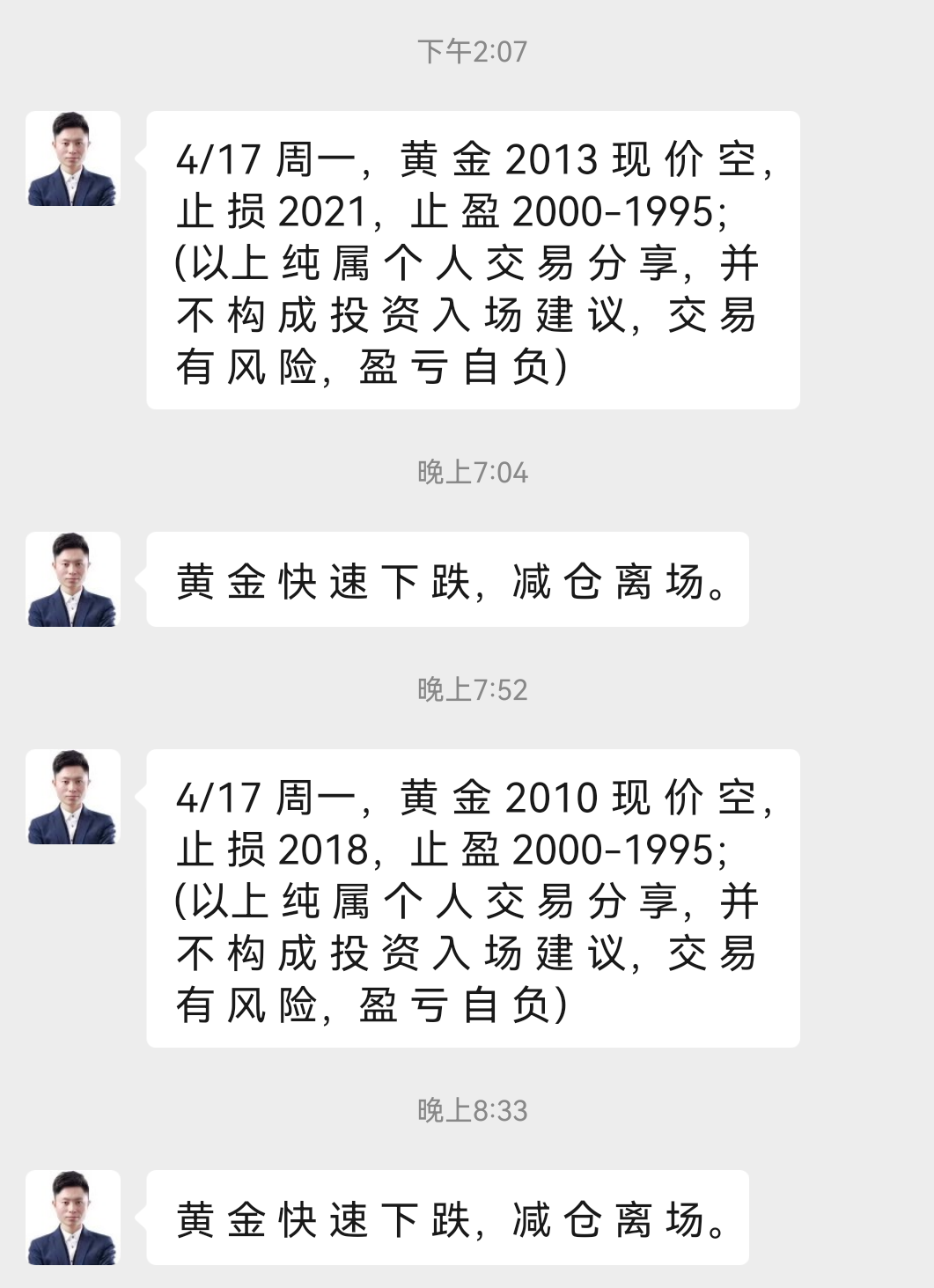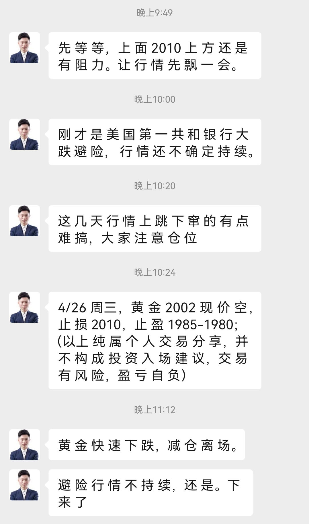黄金当前今日下跌波段!王杨从2040就一直开始提示波段看跌,昨日分别2010空,2015空,全部大跌获利!今日黄金还是继续干空,早盘2005空! 顺势轻飘飘,逆势乱糟糟!黄金很明显的上涨波段结束,开启新的下跌趋势!熟悉王杨的朋友都知道,我们是趋势型选手,每一波行情都从头吃到尾!当前跌势开启,我们一路追随