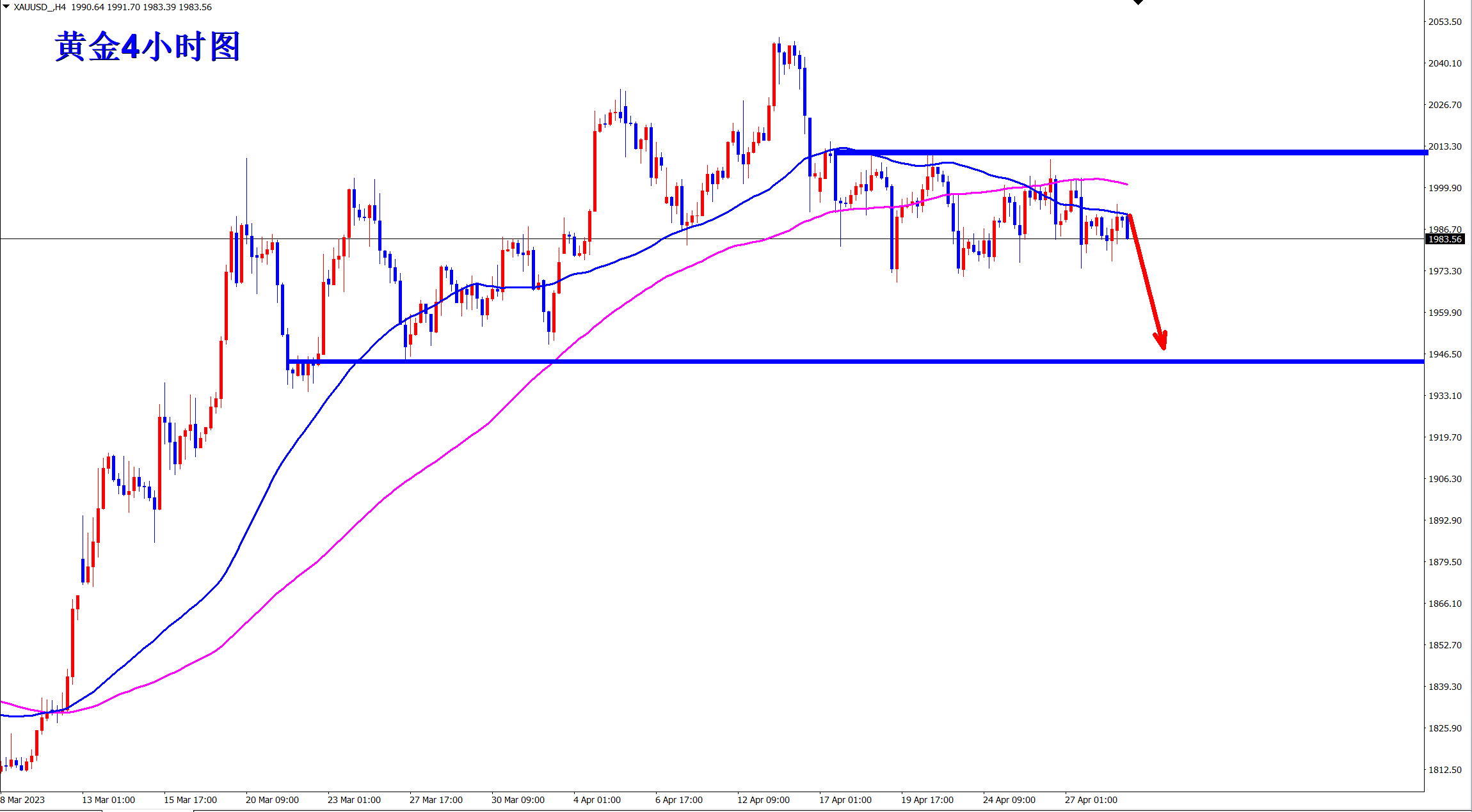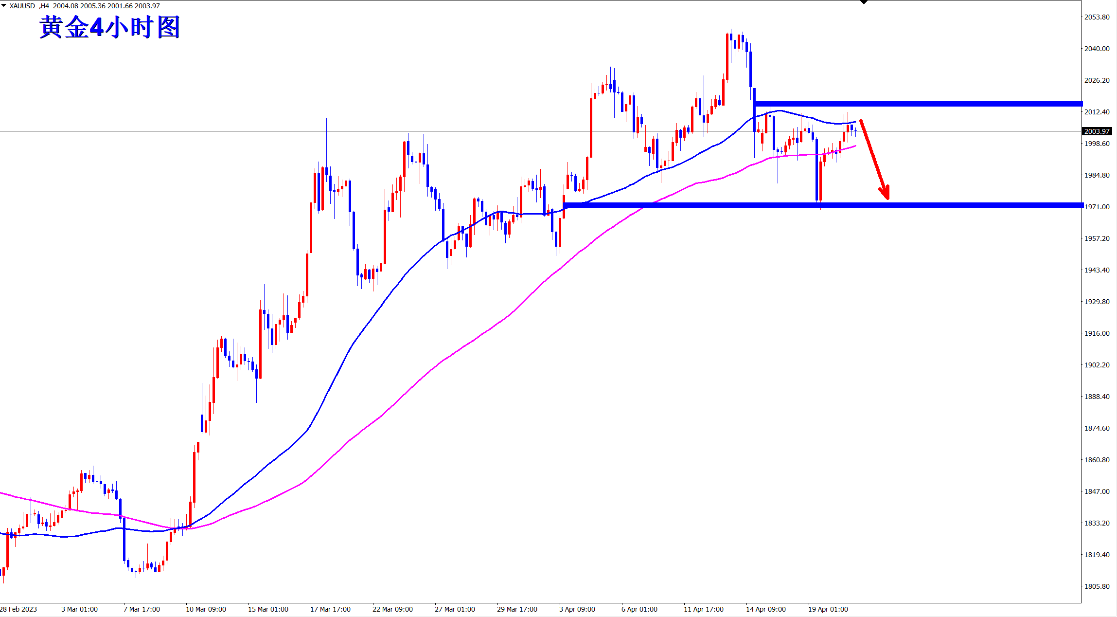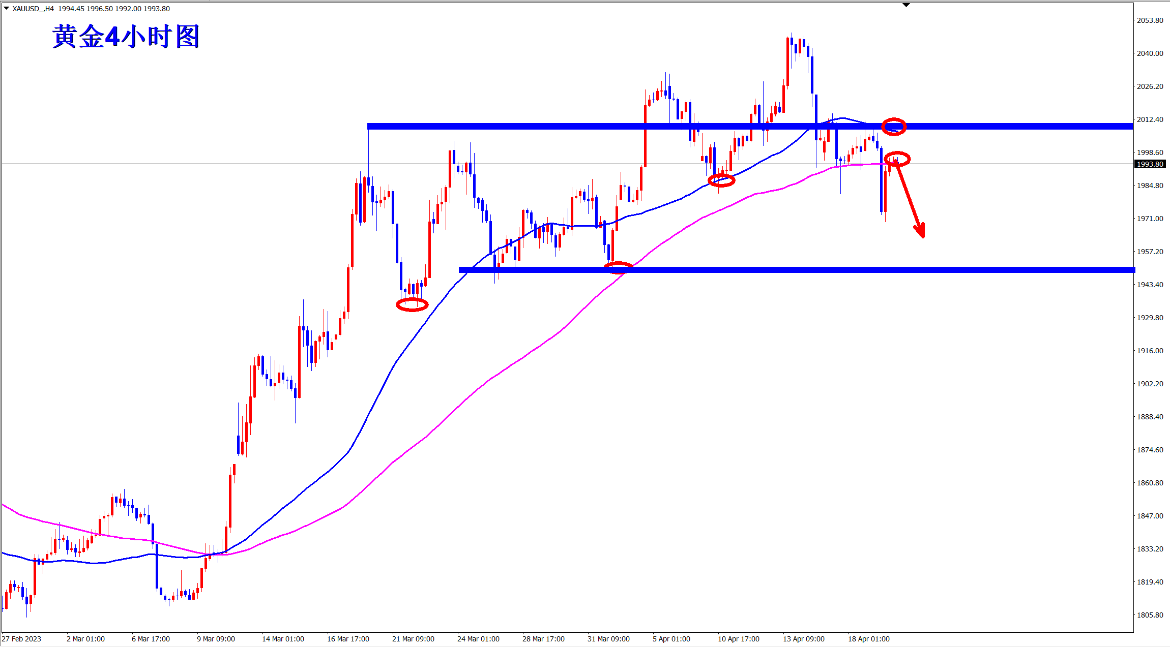 黄金昨日虽然震荡,但终究未能突破关键压力,还是空头!王杨2002果断空,如期下跌获利!当前黄金跌势继续,空,早盘依托2000压力继续干空! 黄金4小时级别上可以看出,从2048开始下跌后维持横盘整理!此前的黄金一直是维持均线上方运行,属于多头上涨趋势!而当前趋势已经发生改变!首先k线跌破均线支撑,这是