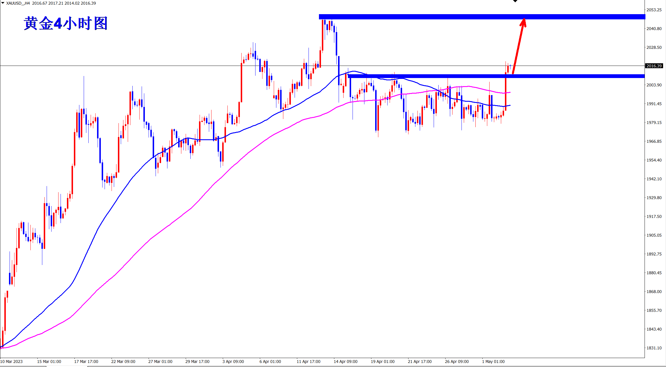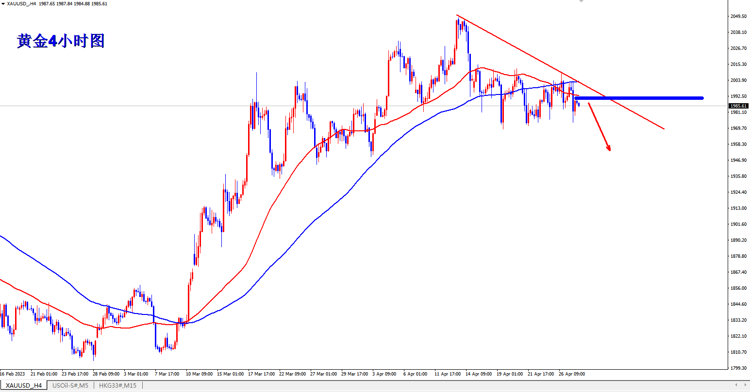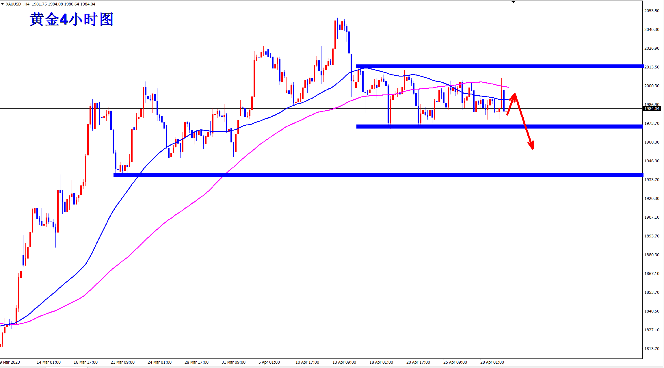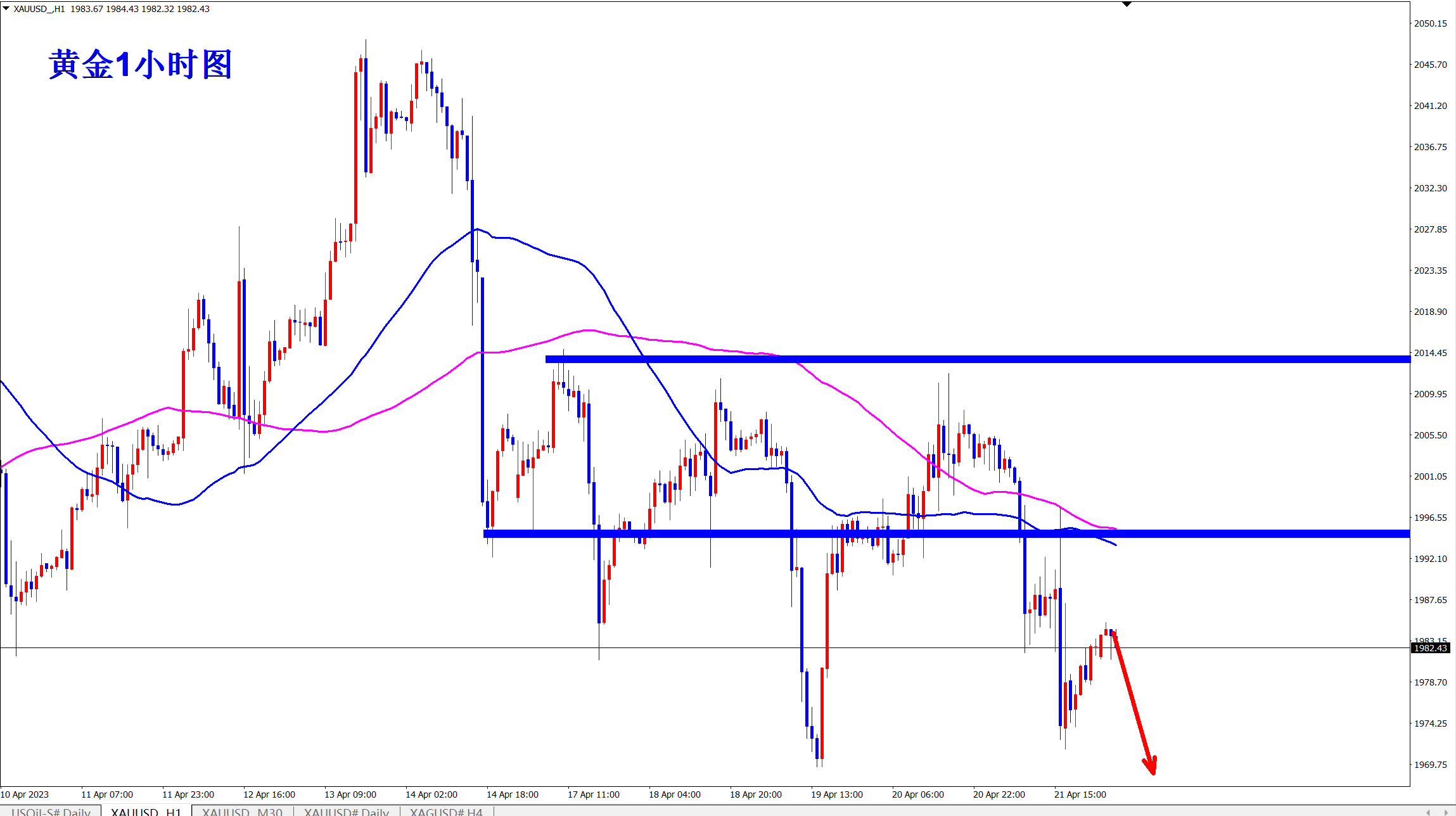 黄金昨日虽然震荡,但终究未能突破关键压力,还是空头!王杨2002果断空,如期下跌获利!当前黄金跌势继续,空,早盘依托2000压力继续干空! 黄金4小时级别上可以看出,从2048开始下跌后维持横盘整理!此前的黄金一直是维持均线上方运行,属于多头上涨趋势!而当前趋势已经发生改变!首先k线跌破均线支撑,这是