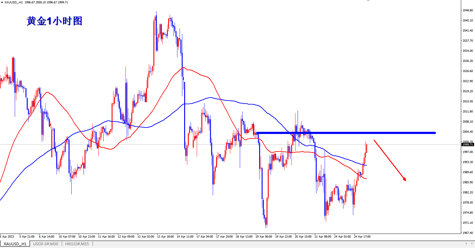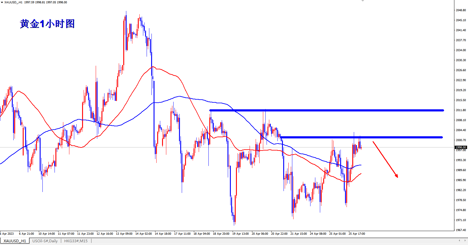 黄金后半夜由于美国第一共和银行大跌避险再次重上2000,早盘回落,黄金2000上方阻力重重,早盘2000直接干空。黄金早盘两次冲高并未站稳2000,今天继续干空。将空头进行到底。我是王杨,今天继续位空头保驾护航。 黄金周线三重顶还在,上方压力山大。上上周周线收长上影线,上周收阴线,这周周线又还没有直接大阳包