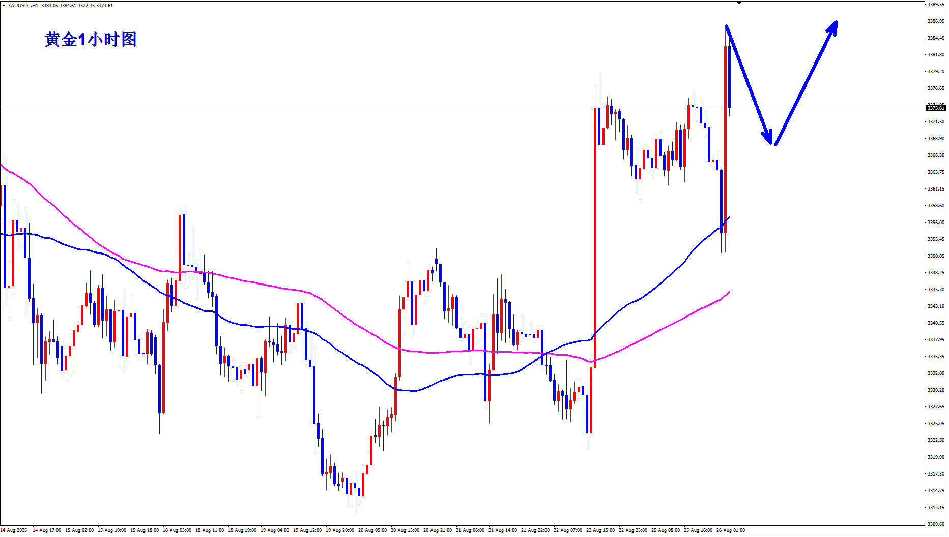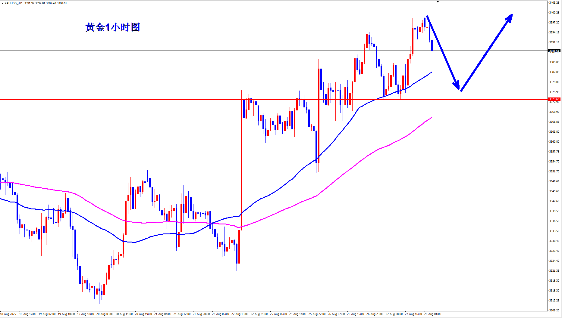 黄金周五3360反手做多开始,周一行情波动小,没有什么参与机会,周二黄金3372直接还是顺势做多,黄金如期上涨收割,黄金做多斩获两连胜,黄金现在多头气势汹汹,早盘回落还是继续多。 黄金1小时均线还是继续金叉向上的多头排列发散,黄金1小时现在呈台阶式上涨,黄金多头节节高升,黄金昨天多次回踩3367一线之