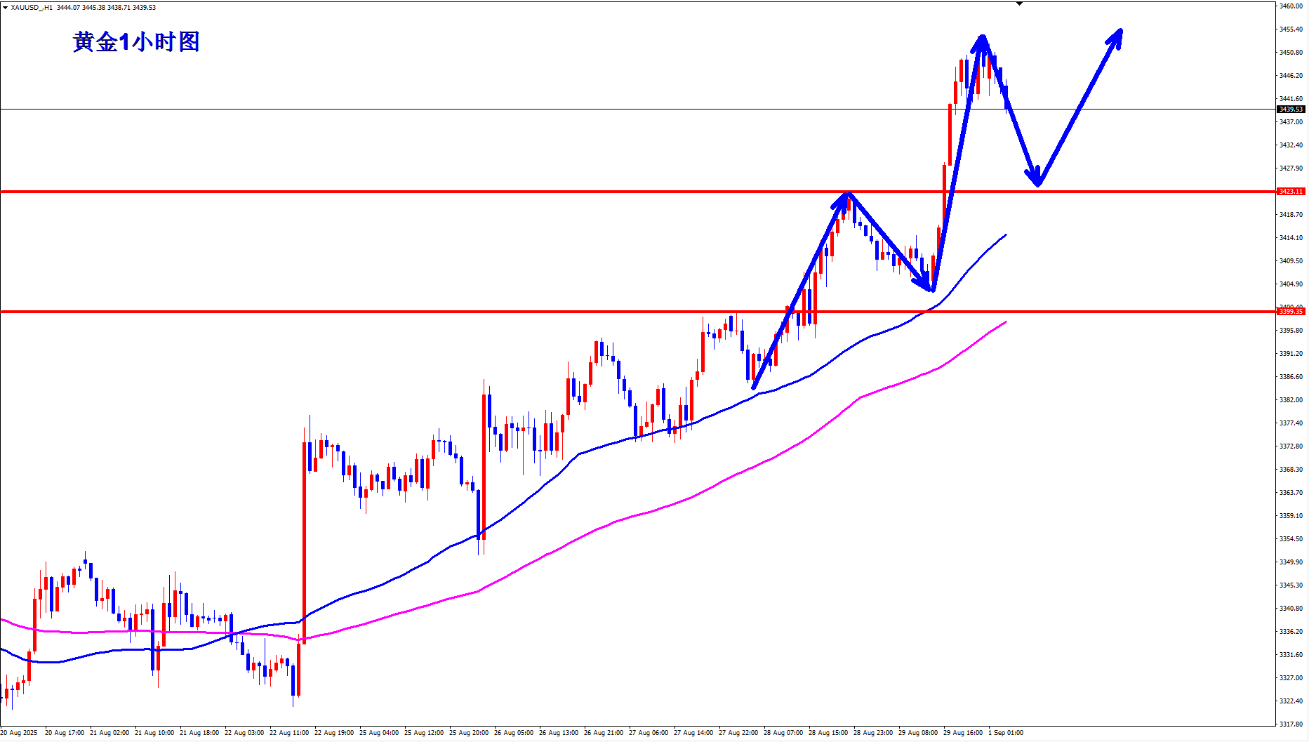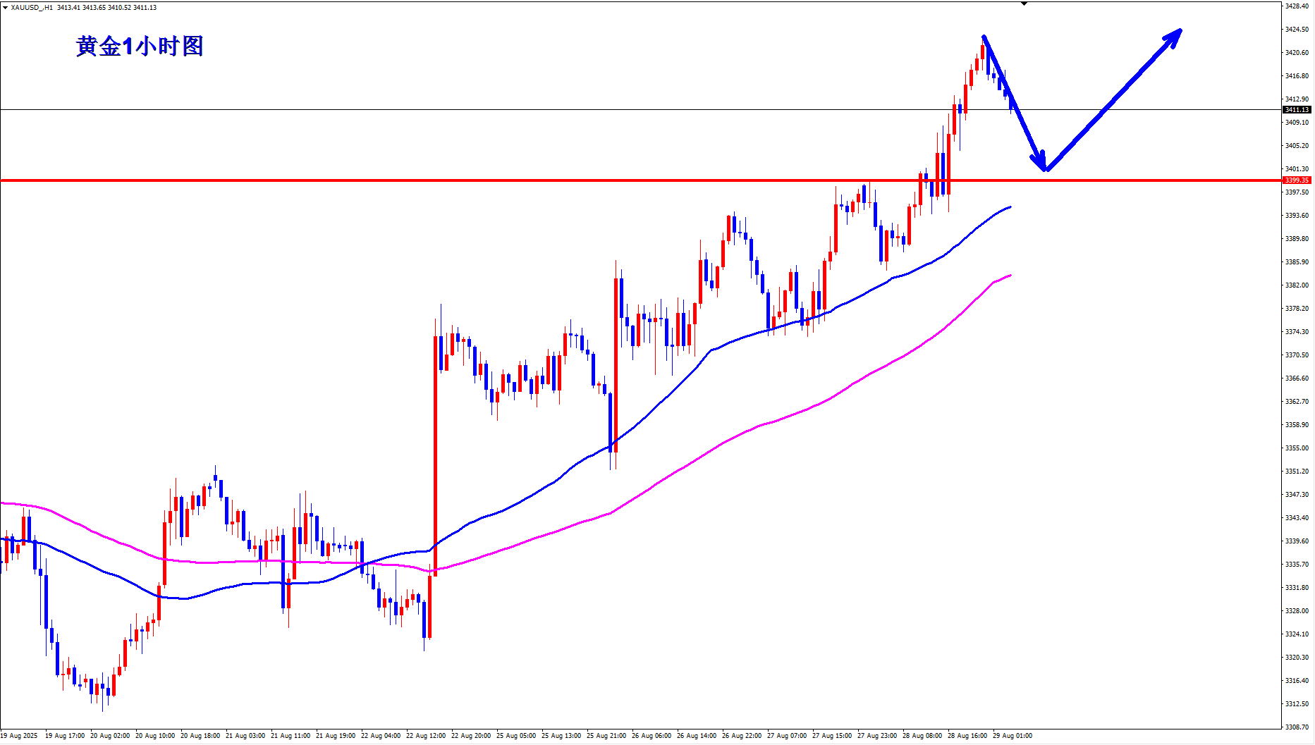 黄金现在还是多头的天下,黄金又创近期新高,最近我们都是一路做多,黄金也是一路上涨,黄金多头还能继续往上冲吗?黄金现在还是多头趋势,回落就是继续给多的机会,上涨不言顶,早盘回踩还是继续顺势多。 黄金1小时均线还是继续金叉向上的多头排列发散,黄金短期的支撑关注3400一线,黄金只要不破3400,那么黄