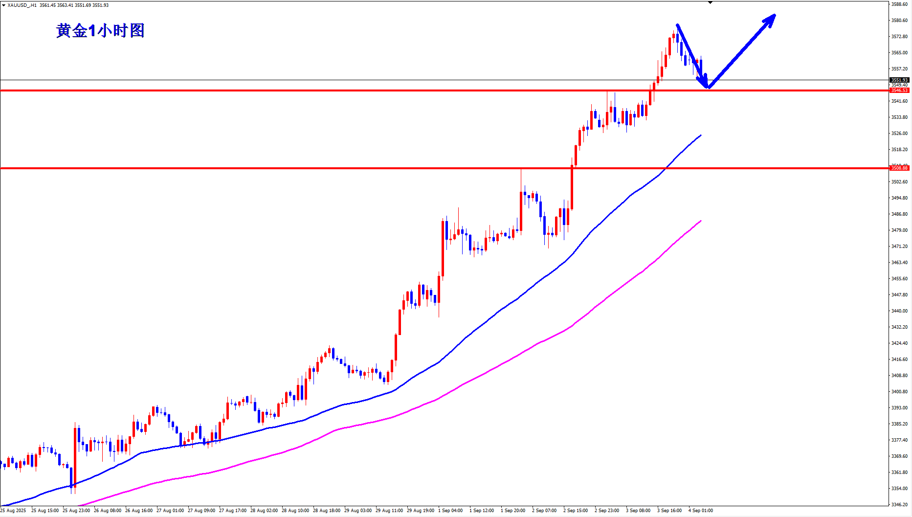 黄金最近不断刷新历史高点,黄金大牛市,气势如虹,多头趋势还是继续强势,黄金早盘回落还是继续顺势做多。 黄金1小时均线还是继续金叉向上的多头排列,黄金多头还有力度,黄金1小时多头突破上次高点3546之后继续扶摇直上;黄金多头支撑现在上移到3546一线,早盘回落3546上继续逢低做多。黄金现在多头强势,标
