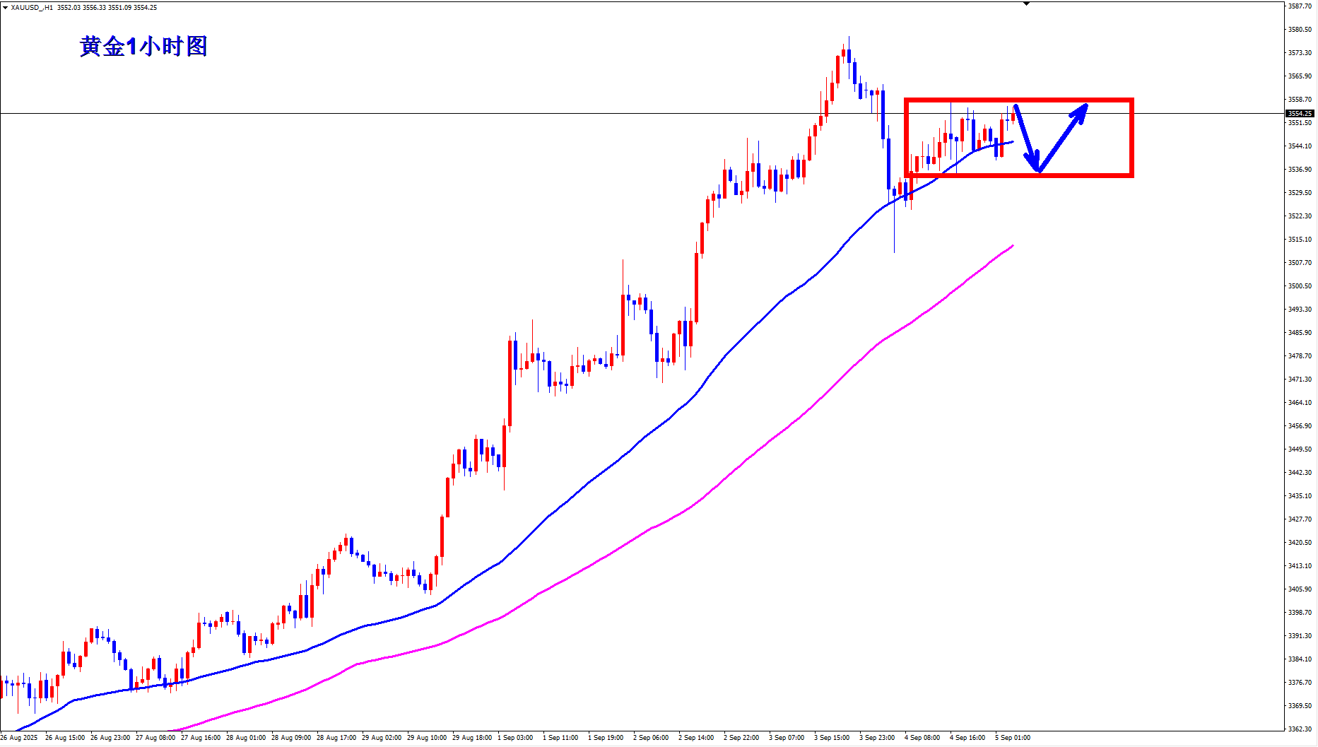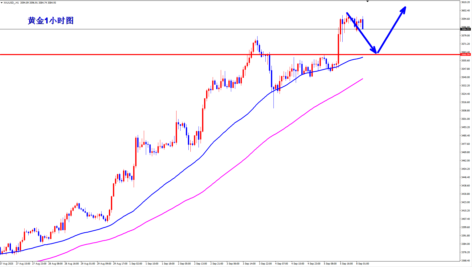 黄金现在多头气势如虹,多头势不可挡,现在回落就还是继续给多的机会,顺势轻飘飘,逆势乱糟糟,现在还是黄金大牛市,早盘回落继续顺势多。 黄金1小时均线还是继续金叉向上的多头排列发散,均线支撑也上移到3560附近,黄金3560也是短期的多空转折位,黄金早盘回落3560上继续逢低做多。黄金现在还是标准的多头趋