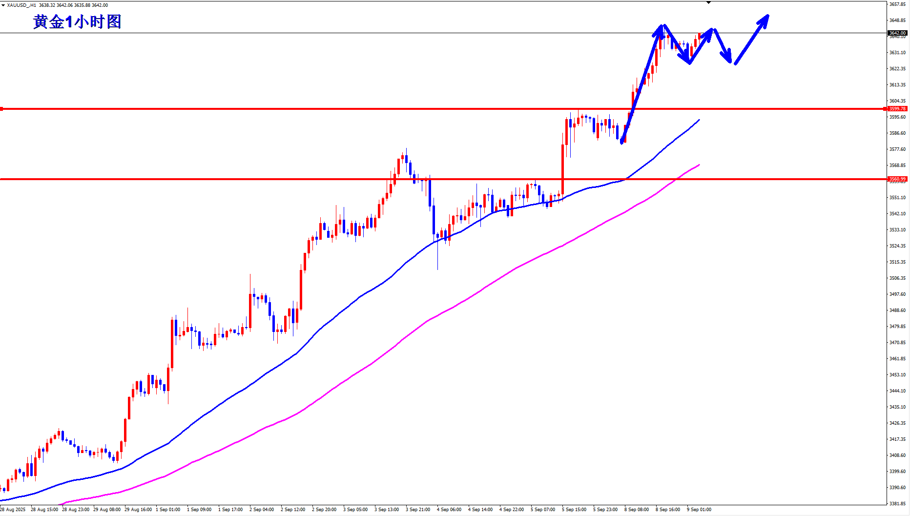 黄金多头势不可挡,基本上没有什么大的回落,那么现在黄金就只能继续强下去,黄金现在如果想等过大的回落,基本上不太可能,如果开始大幅回落,那么就不是调整了。现在行情就是强势不回调,回调不强势。早盘回落还是顺势多。 黄金1小时均线还是继续金叉向上的多头排列发散,黄金昨天突破3600一线之后就开始继续