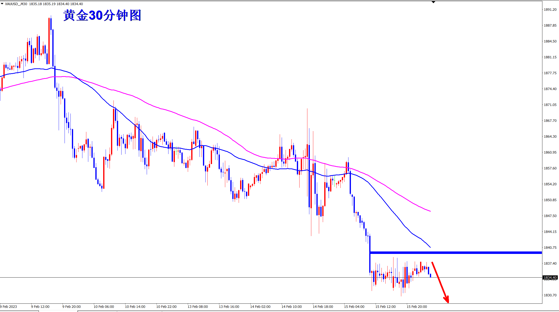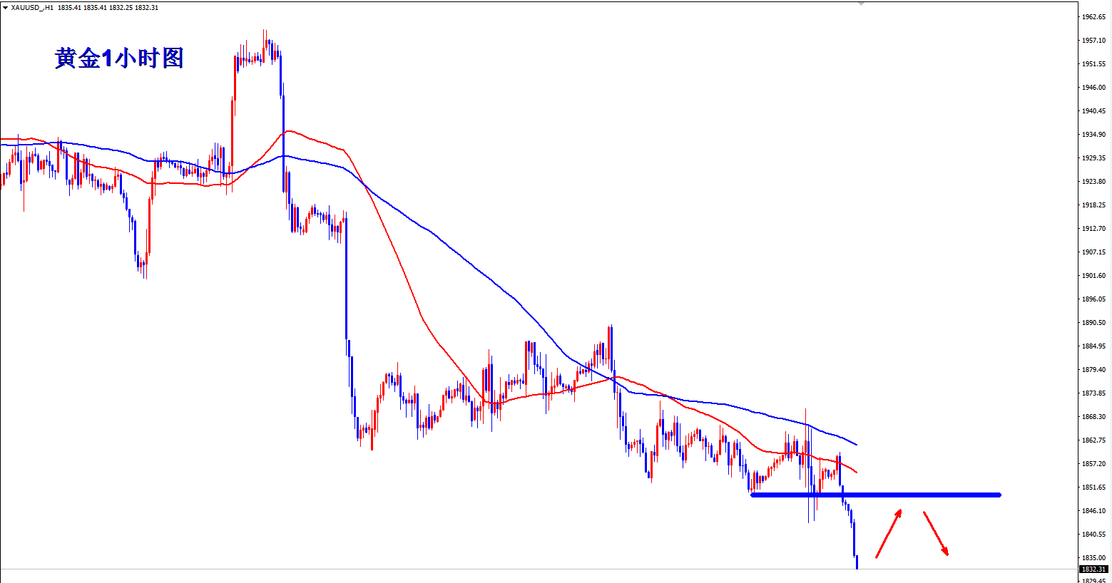 黄金空头下跌趋势没有改变,不断新低!顺势而为,早盘依托1840的压力继续做空看跌! 黄金当前的走势阴跌不止,而且反弹无力!空头跌势,顺势轻飘飘,逆势乱糟糟!趋势下跌,反弹都是做空机会!当前1840位置是短线空头压制位置,也是昨日反弹遇阻的压力!今日将依托这一阻力做空看跌! 黄金最近单边下跌,没有