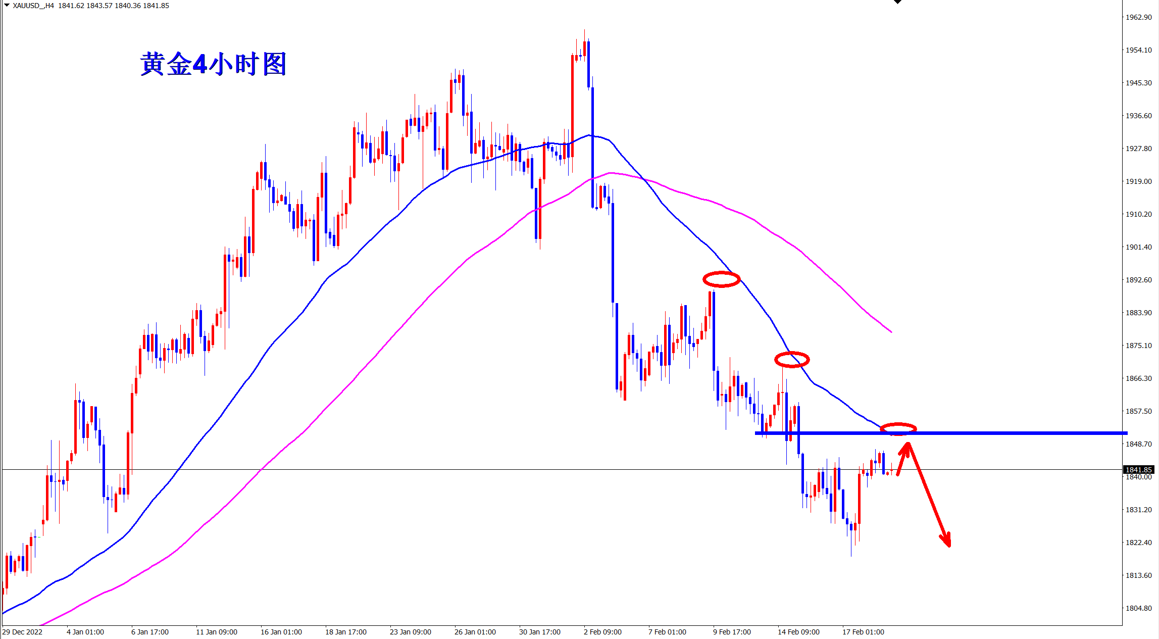 黄金昨日反弹,但是无力!依旧受到1850位置的压制,今日早盘依托1850的压力干空,看跌! 黄金当前很明显的趋势下跌走势,并且每次反弹都是受到均线的压制,一直未能突破!这一次也不例外!虽然看似强势,依旧维持均线压力位置下方!还是空头跌势! 早盘依托均线的压力继续做空看跌!继续新低!只有行情强势突