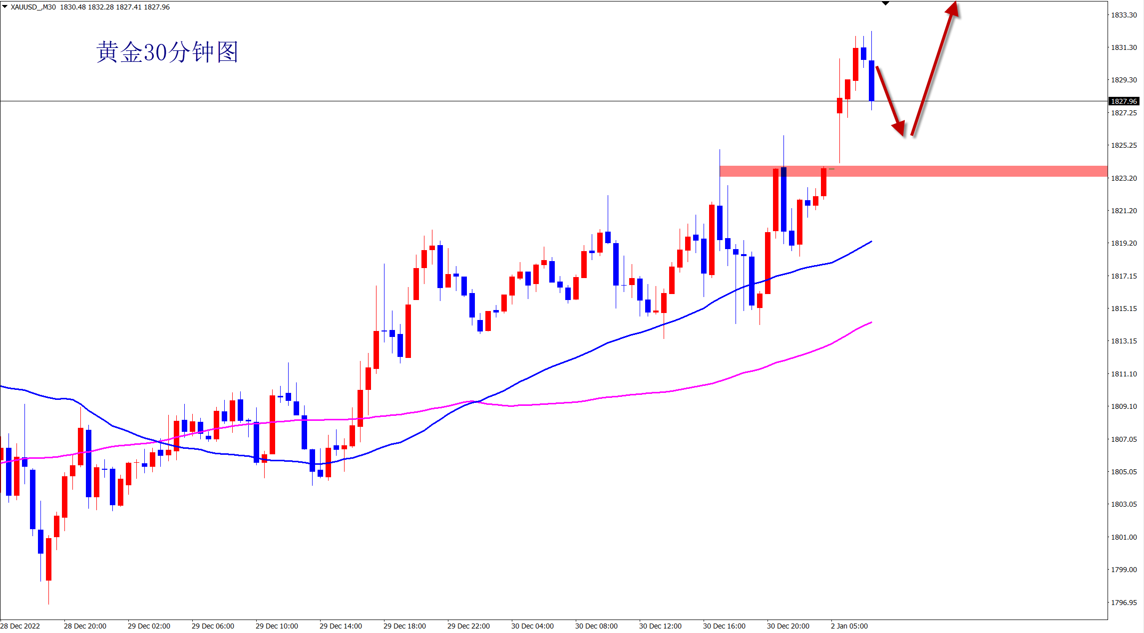 黄金早盘开盘即强势上涨,新年新气象!黄金即将变盘,开启新的上涨波段,早盘顺势依托1823支撑直接多! 明显的多头走势,并且突破压力,多头上涨,势不可挡!接下来继续开启新的上涨波段!顺势而为,趋势为王!早盘回落直接多,依托开盘1823的支撑干多,上方1835短线压力! 强势的上涨走势,回落都是做多的机