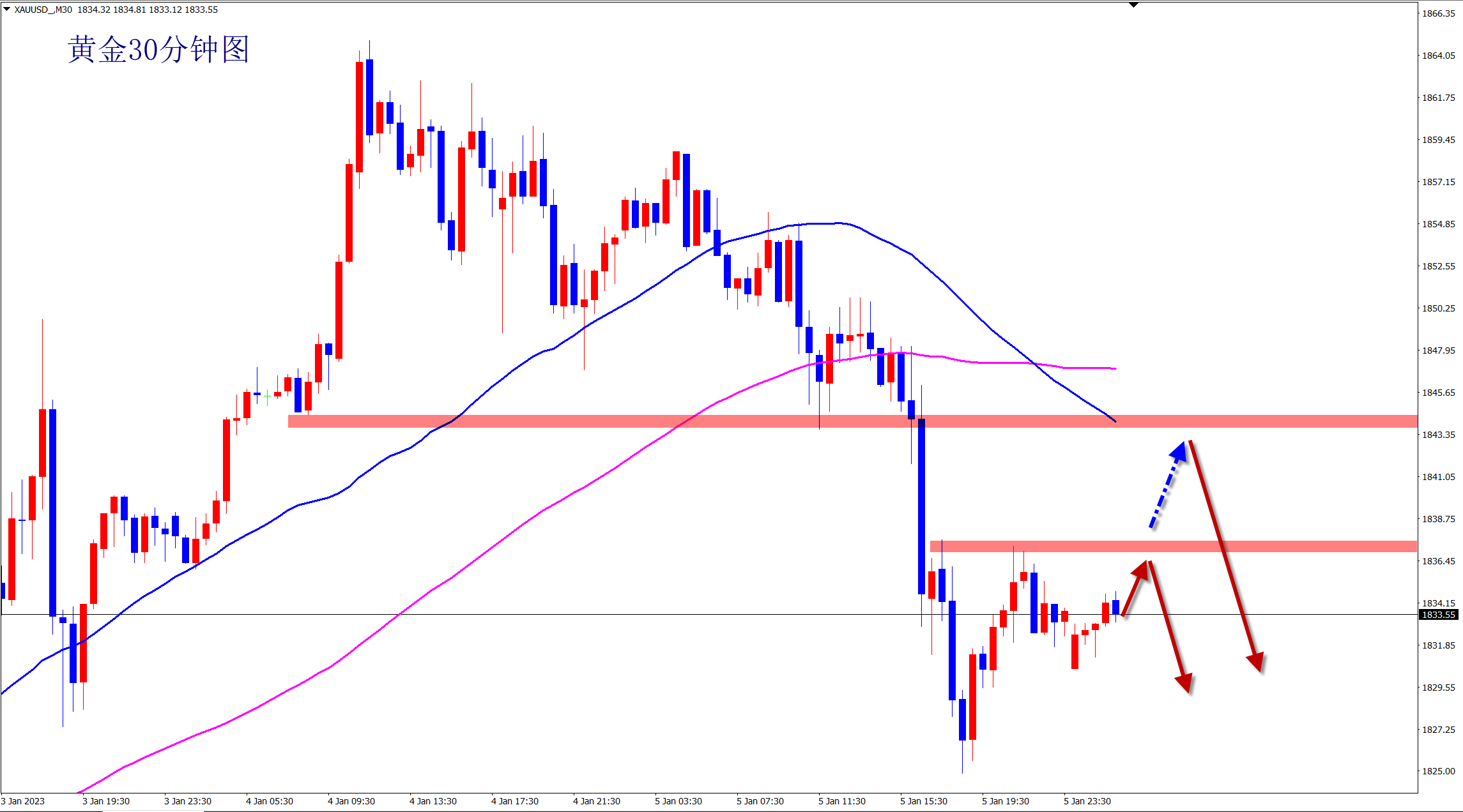 黄金昨日破位大跌,行情转跌,今日早盘依托1843的压力干空! 黄金此前一直强势上涨,但是从昨日开始破位1848的支撑,转为空头跌势!势不变则守,势变则随!趋势已经改变,操作思路就要及时跟进!不破不立,破位翻转!此前的支撑破位已经变为压力! 今日黄金反弹将依托压力位置干空!当前的黄金有两个压力,分