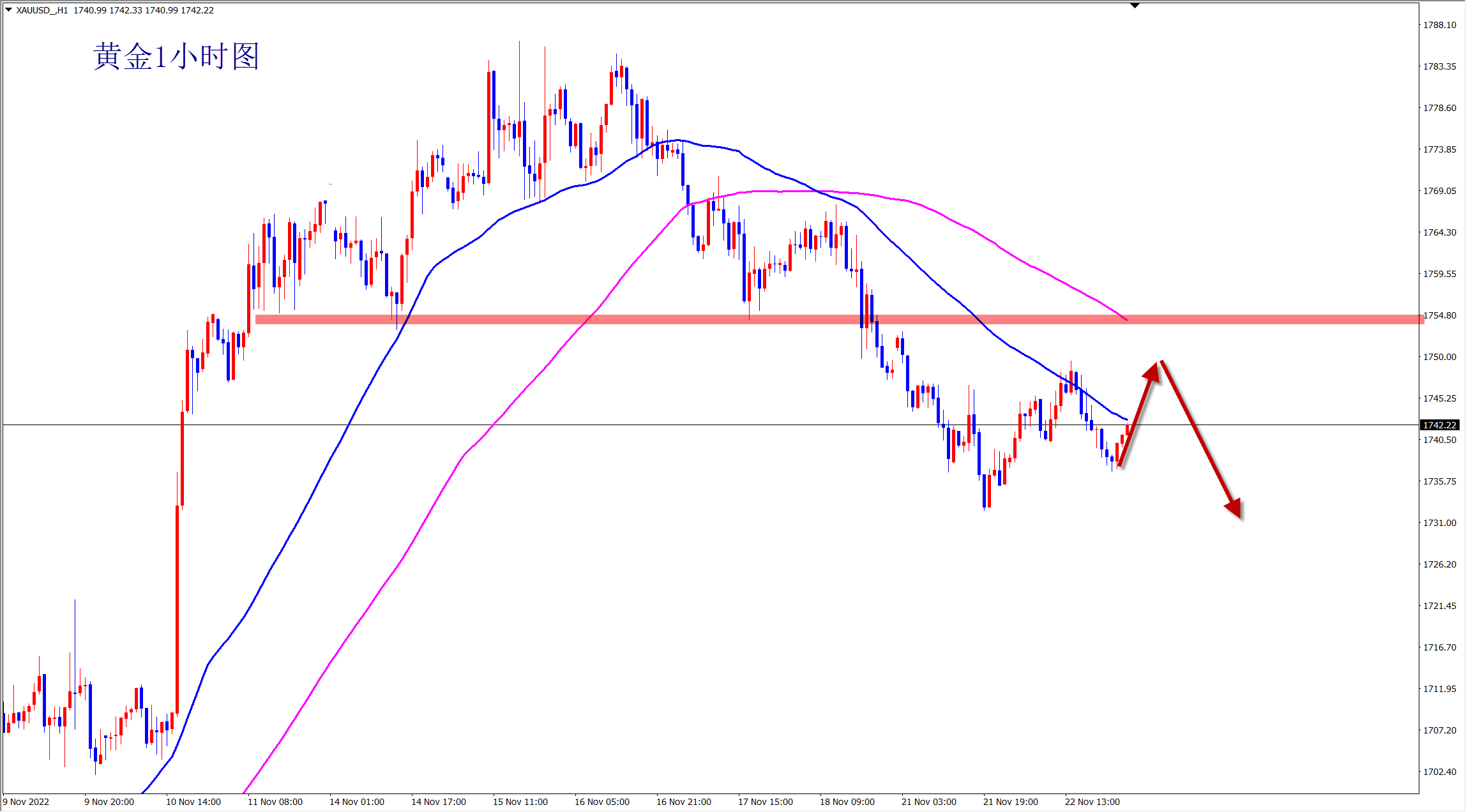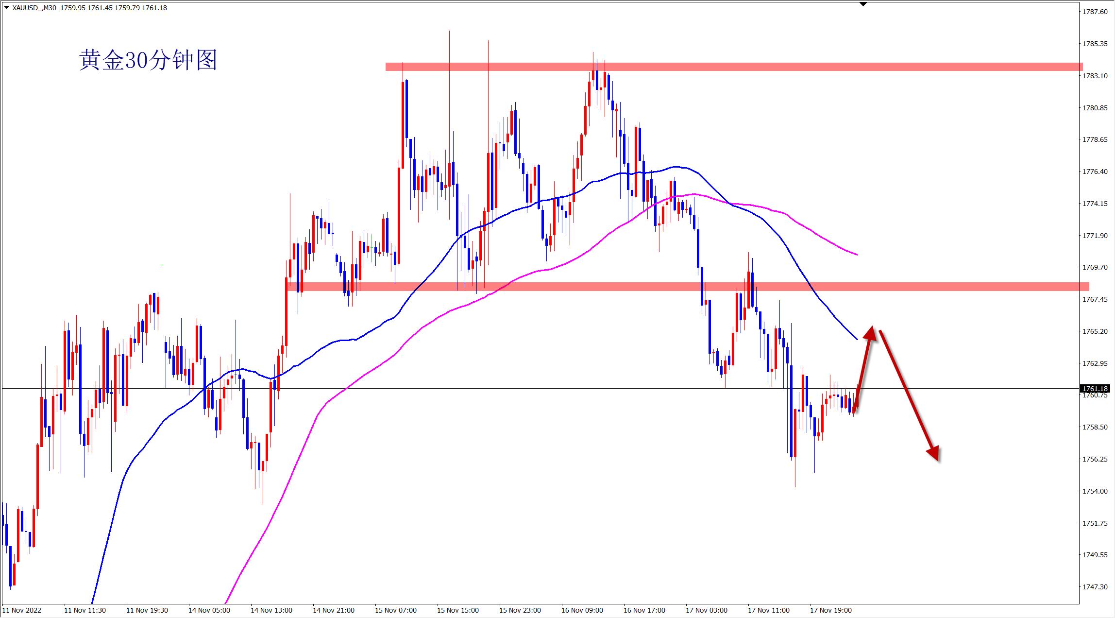 黄金昨日冲高遇阻回落,并且破位日内低点,大阴杀跌,行情转空,早盘1750压力位置反弹干空! 强不再强必转弱!此前黄金强势上涨,但是当前遇阻1765压力后,再难前行一步!非常弱势!并且当前已经跌破均线支撑!破位后多空转换,支撑变压力!今日我们将依托这一阻力反手干空! 计划你的交易,交易你的计划!空