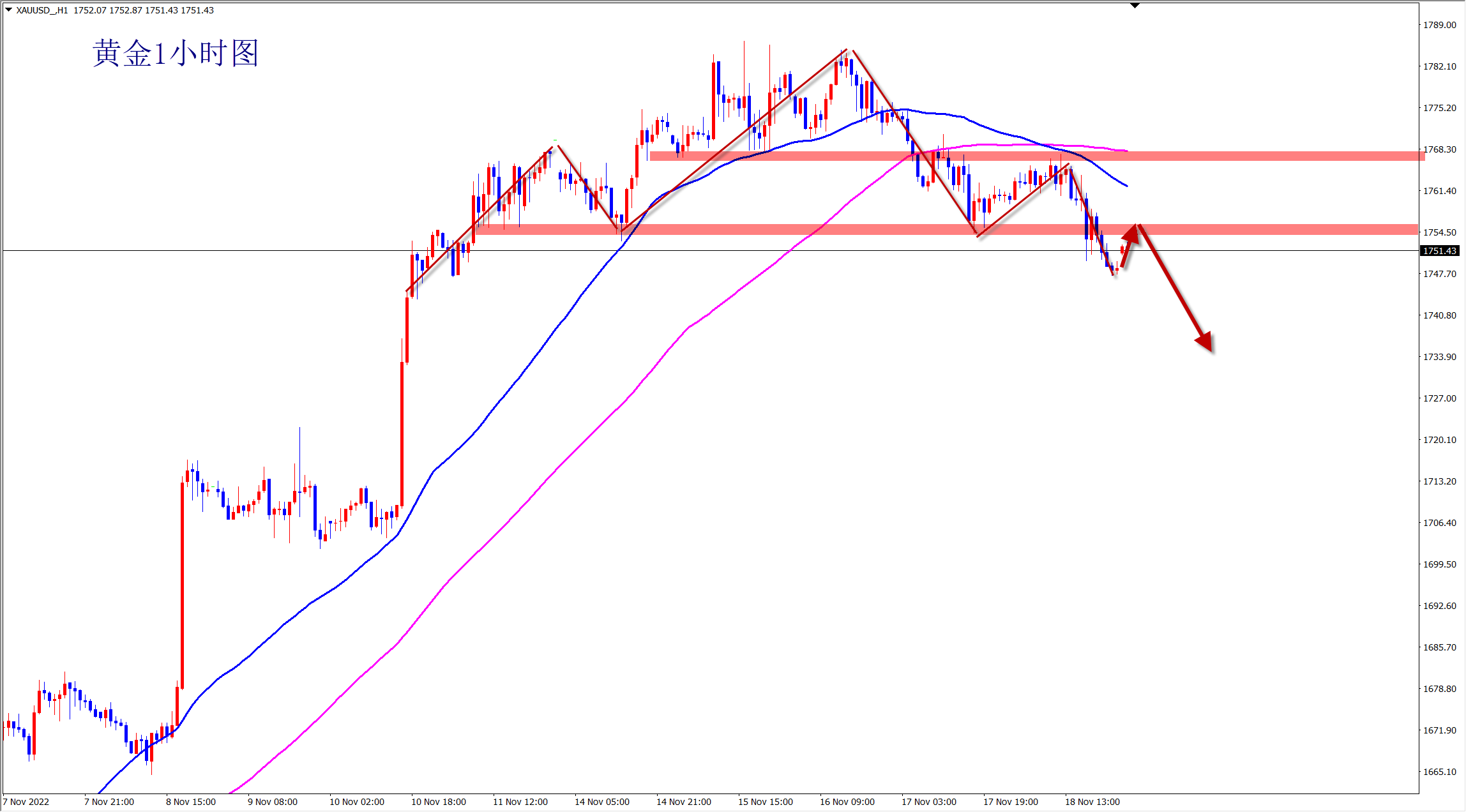 黄金当前构建头肩顶形态,并且破位颈线支撑,已经转为空头下跌走势,周五干空两连胜,今日早盘依托1762的压力干空看跌! 黄金此前一直是强势多头上涨,但是在1785一线遇阻,并且三次上攻都未能突破,小级别上构建三重顶结构!最终破位下行,而且1小时走势图上,黄金形成头肩顶形态,并且破位支撑!强不再强必转弱,