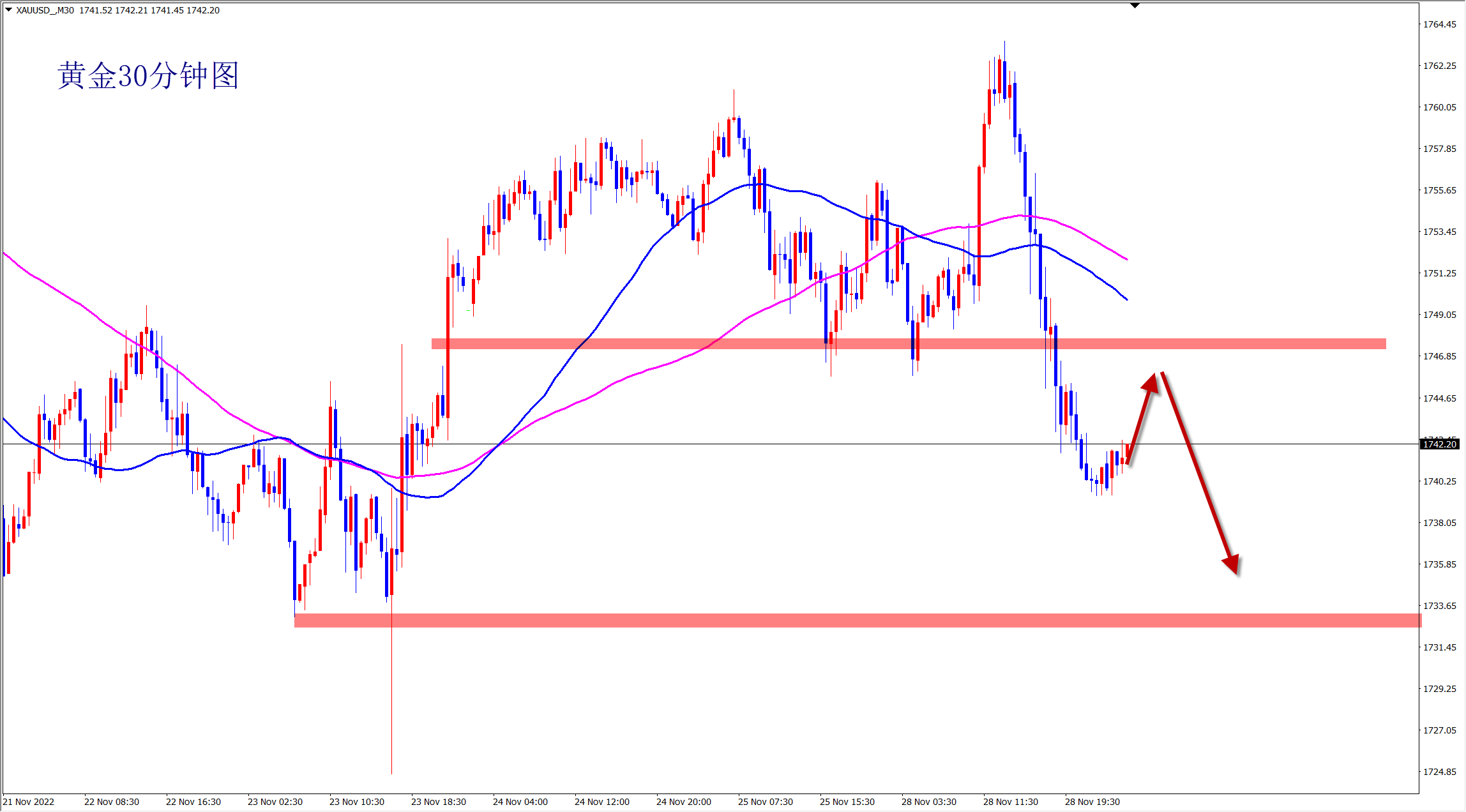 黄金当前趋势下跌走势,昨日1747空和1743空,全部如期下跌获利收割!当前黄金跌势不变,早盘1750压力还是继续干空! 当前的黄金明显的下跌趋势,而且是通道内的震荡下跌!每次反弹遇阻后都会延续下行!顺势轻飘飘,逆势乱糟糟!早盘依托压力位置还是要顺势继续干空,下方的支撑则是前期上涨的盘整1700区域!