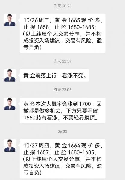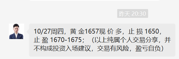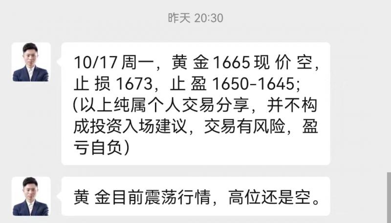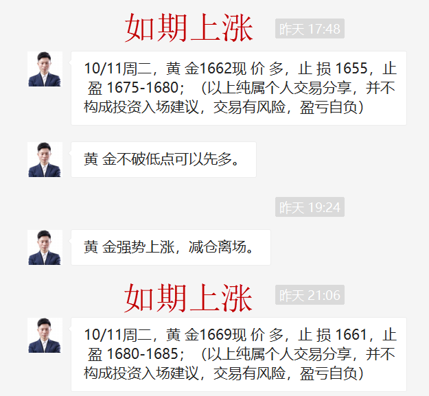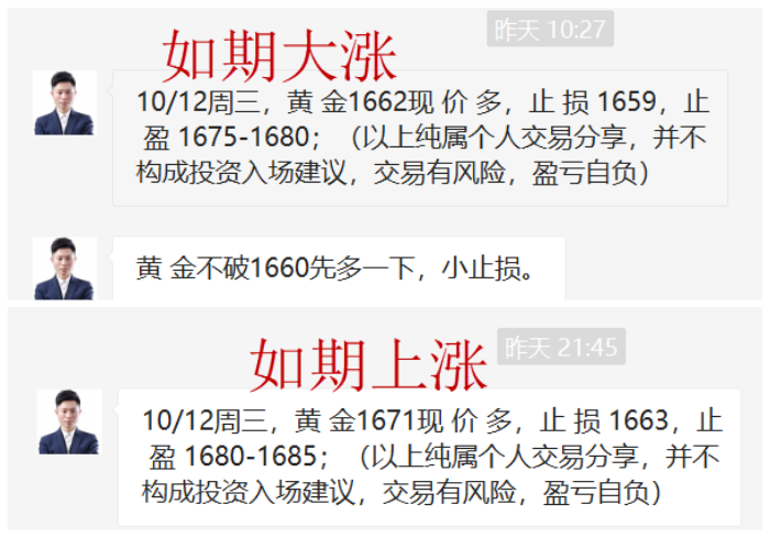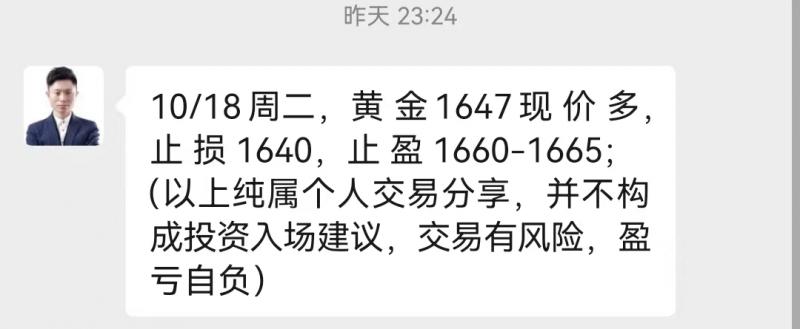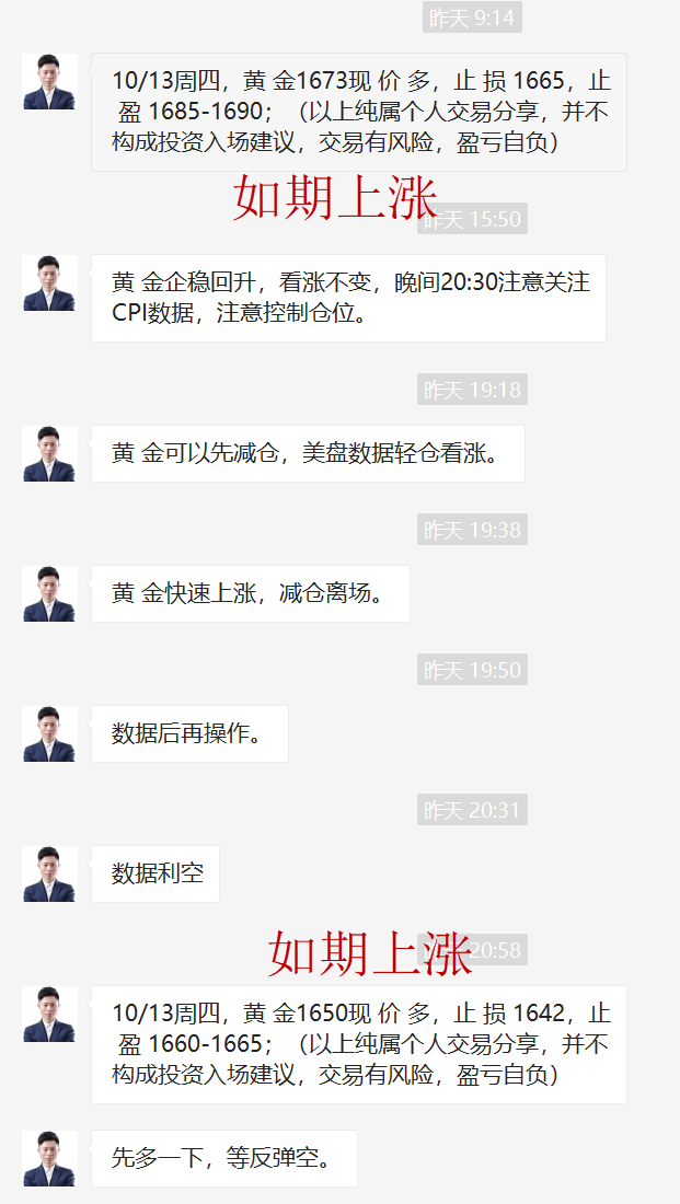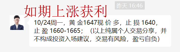 黄金昨日早盘震荡先涨,王杨1673多如期上涨获利,随后行情数据利空后大跌,但是王杨没有追空,而是1650位置做多,最后直接大涨获利!虽然我们没有做空,但是依旧日内两连胜收割!交易就是对点位时机的把握!踩准节奏,才能步步稳赢! 黄金昨日直接深V,下跌暂时告一段落,今日继续低多看涨!依托1655的支撑做多