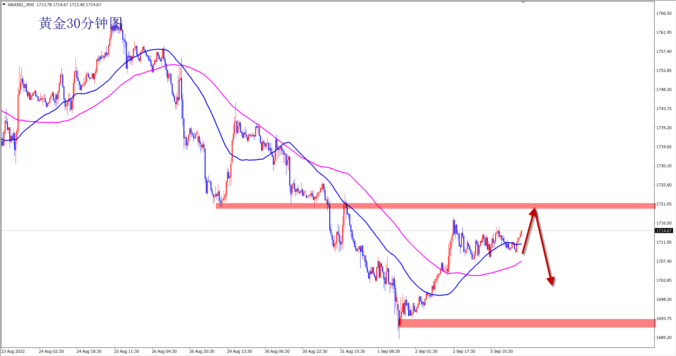 黄金底部区间震荡,上方依旧没有突破1730的压力,当前走区间内的下跌段,早盘1726压力先干空看跌! 黄金当前维持1690-1730的大区间震荡走势,但是反弹没有突破关键压力,整体还是空头跌势!不破不立,破位翻转!而且当前正好反弹至上方压力遇阻,行情回头向下!早盘依托压力位置先空,下方关注1703的支撑,破位看跌