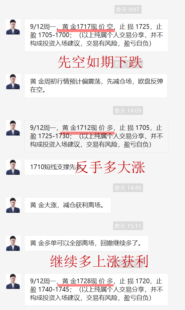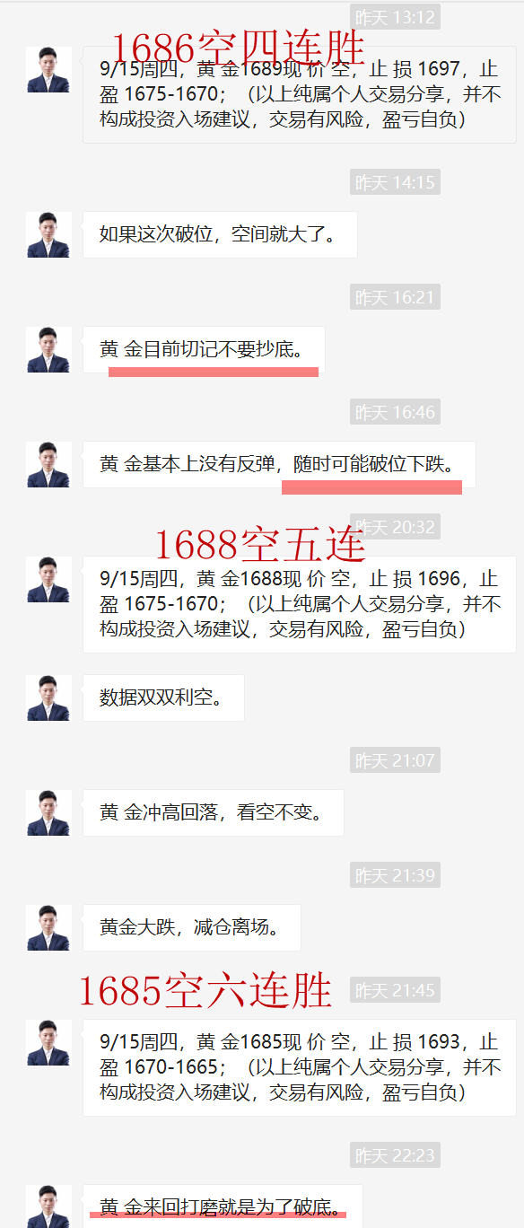 黄金昨日数据前震荡,王杨分别给了1662的多单如期上涨,然后1676反手空,直接下跌收割!王杨已经多次强调,数据前行情区间震荡为主!凌晨美联储利率决议,黄金先跌后涨再跌!反弹压力位置后,王杨果断在1685位置干空,直接下跌获利收割!日内三连胜!给力! 黄金当前还是震荡,但偏空走势!操作上依旧是高空看