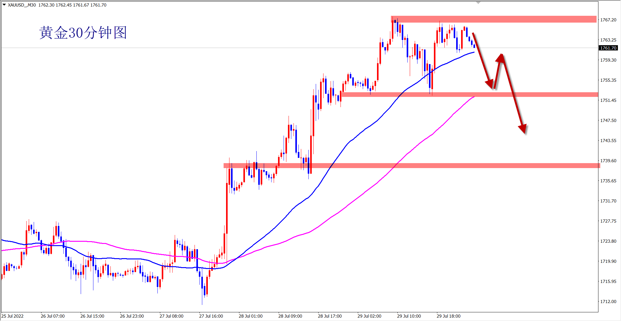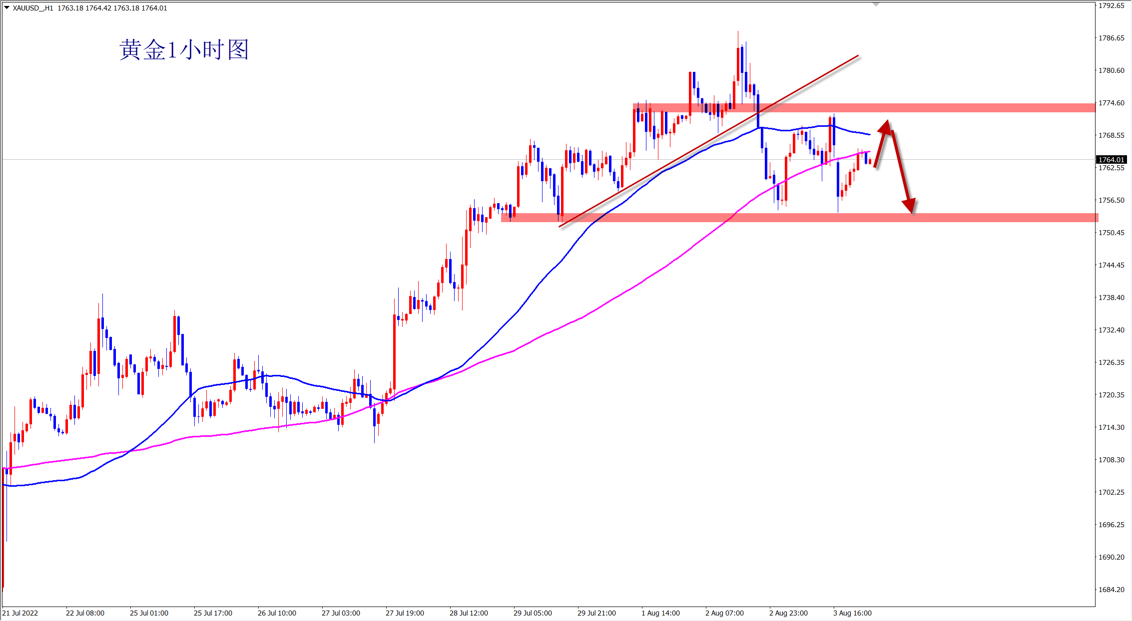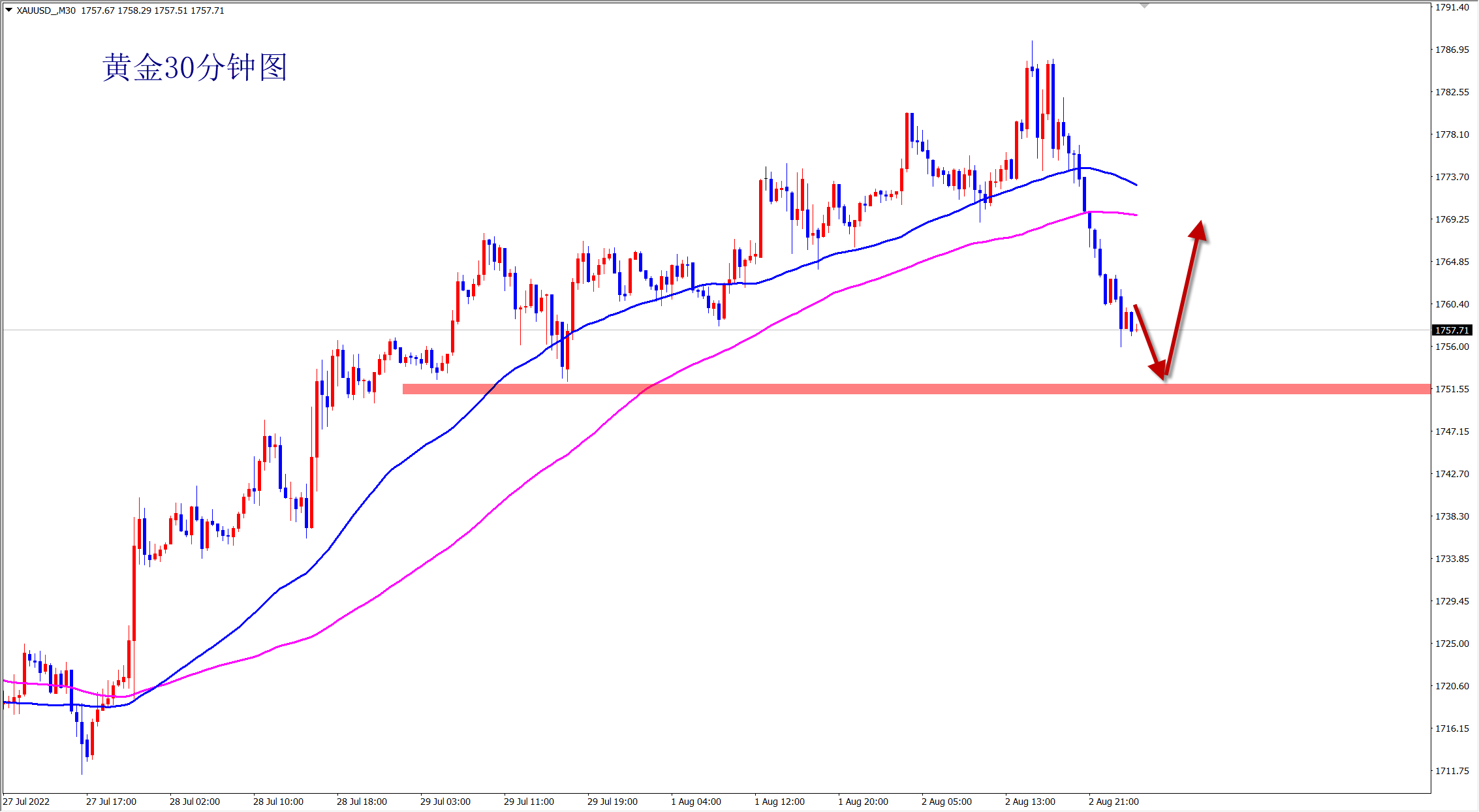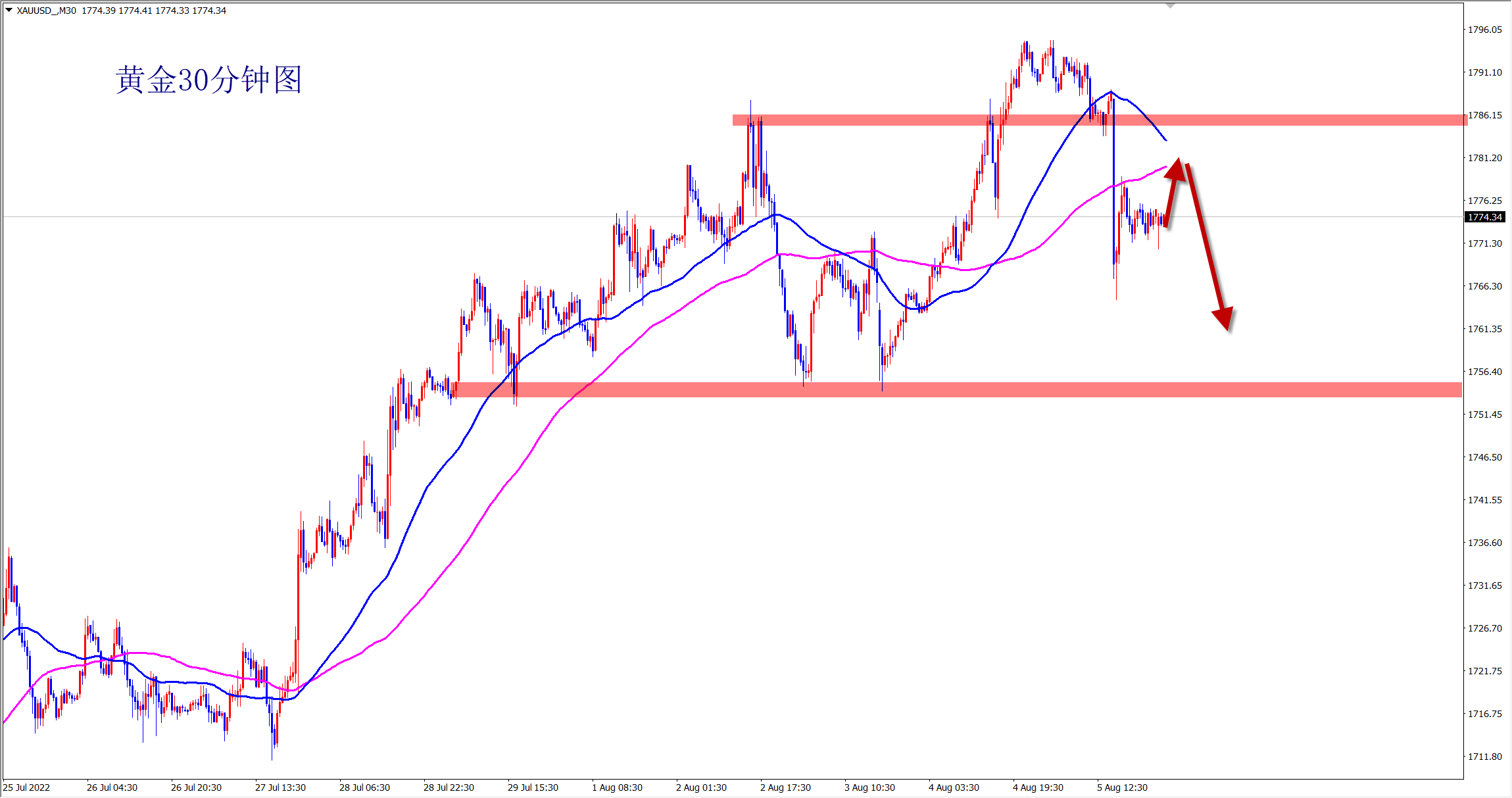 黄金冲高遇阻回落,并且跌破1770支撑,行情转跌!今日我们改变思路,反弹干空了,早盘依托1775的压力干空! 黄金此前强势上涨,但是随后在1788位置遇阻开始回调,并且跌破趋势线支撑,随后行情反弹无力,受到1775位置的压制,行情转跌!破位后多空转换,支撑变压力,早盘将依托1775的压力开始干空! 趋势交易
