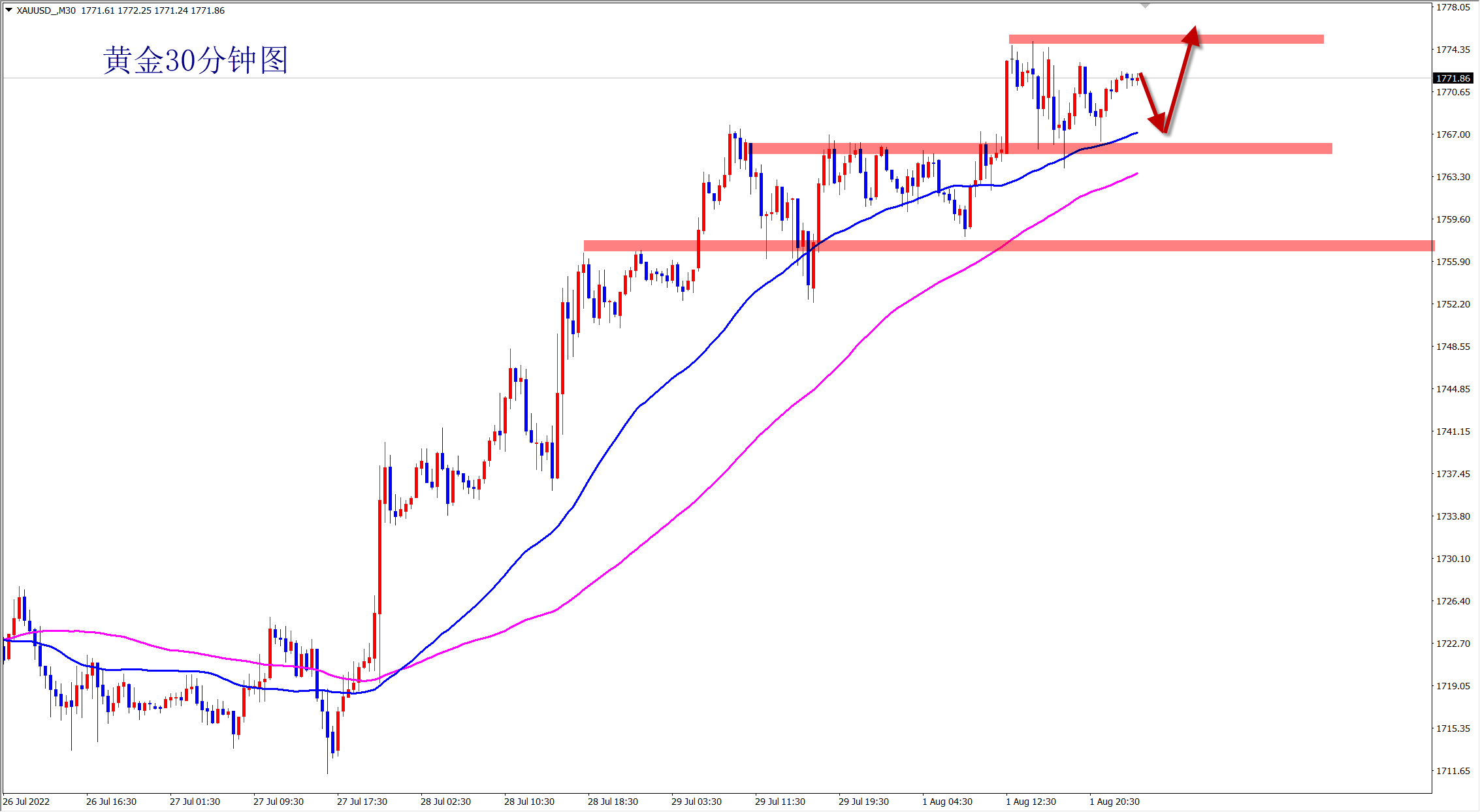 黄金数据后大涨,王杨也顺势跟进拿下利润!周五行情遇阻1770一线后,王杨及时的调整思路,1766干空,1762干空,1758干空,如期下跌!当前黄金上涨遇阻1770,早盘反弹后干空! 黄金当前虽然强势上涨,但是在1770一线遇阻,两次反弹都遇阻,并且30级别上形成双顶结构!如果再次上涨不能突破这一压力,将会进行深度回