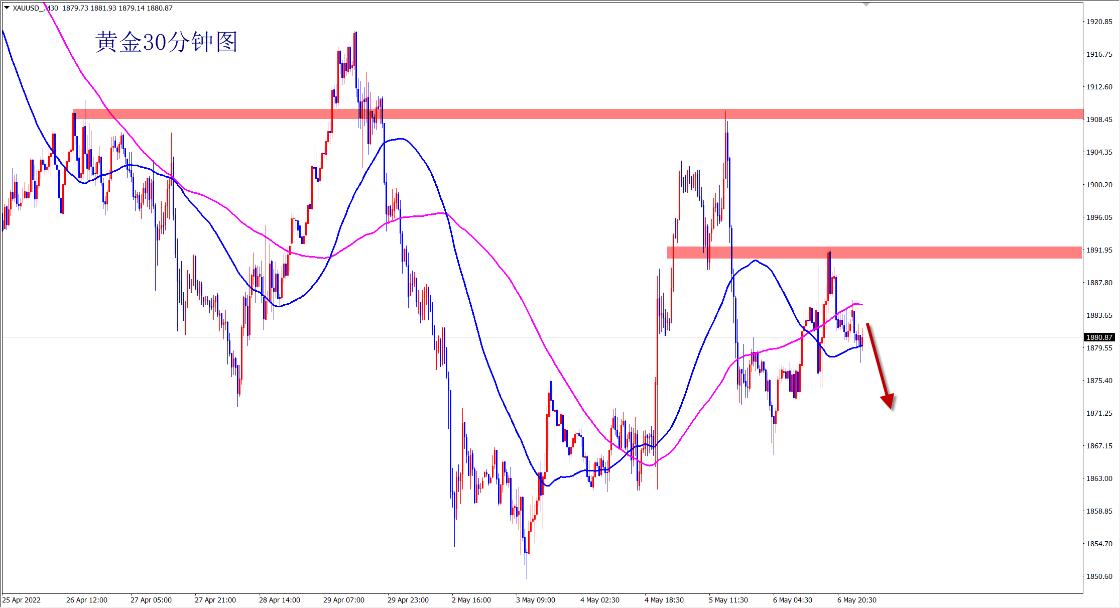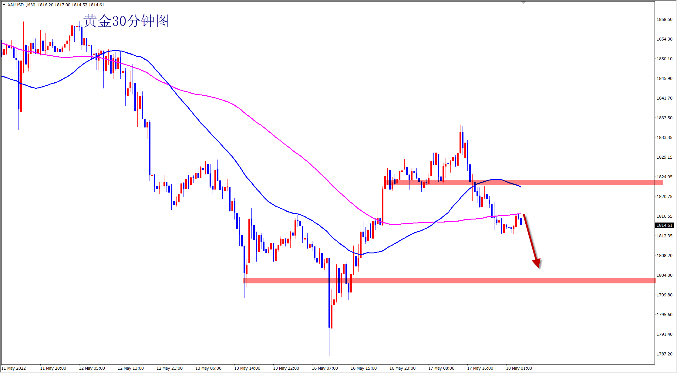 黄金昨日先涨后跌,最终多头还是遇阻后回落,上涨力度不强,空头继续!今日依托1825的压力干空! 黄金最近一直是空头走势,每次看似强势的反弹,最终都是一波结束,遇阻后再次阴跌不止,甚至会破位新低。昨日遇阻后行情再次开启下跌,而且没有反弹,又是阴跌走势!当前只能继续顺势干空,多头无力,继续下探1800!