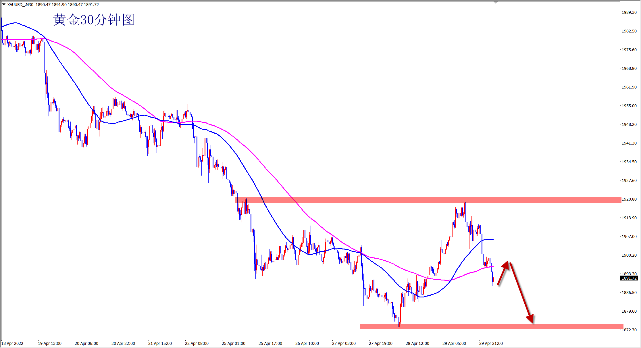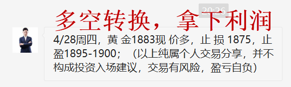 黄金昨日冲高回落后转为跌势,我们及时调整思路,1893和1890分别干空,如期大跌获利!当前跌势继续,反弹依托1880的压力继续干空! 黄金冲高遇阻后大幅回落,标志黄金再次进入下跌趋势!方向很明显,思路很清晰!操作也很简单,反弹就是直接空!黄金上方的压力就是1880位置,昨日下跌后的反弹无力,一直承压188