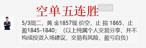 黄金再次下跌,我们1857的空单再次拿下利润,五连胜到手!坚持是一种信念,时间会证明一切!反对的人越多,需要的底气就越要足!趋势行情,捡钱的机会! 做交易形态、时间、压力支撑位、还有心态控制,这些都要考虑进去,千万不要在底部还没有明显信号的时候轻易去博反弹或者反转!那些重仓逆势做多的朋友我就