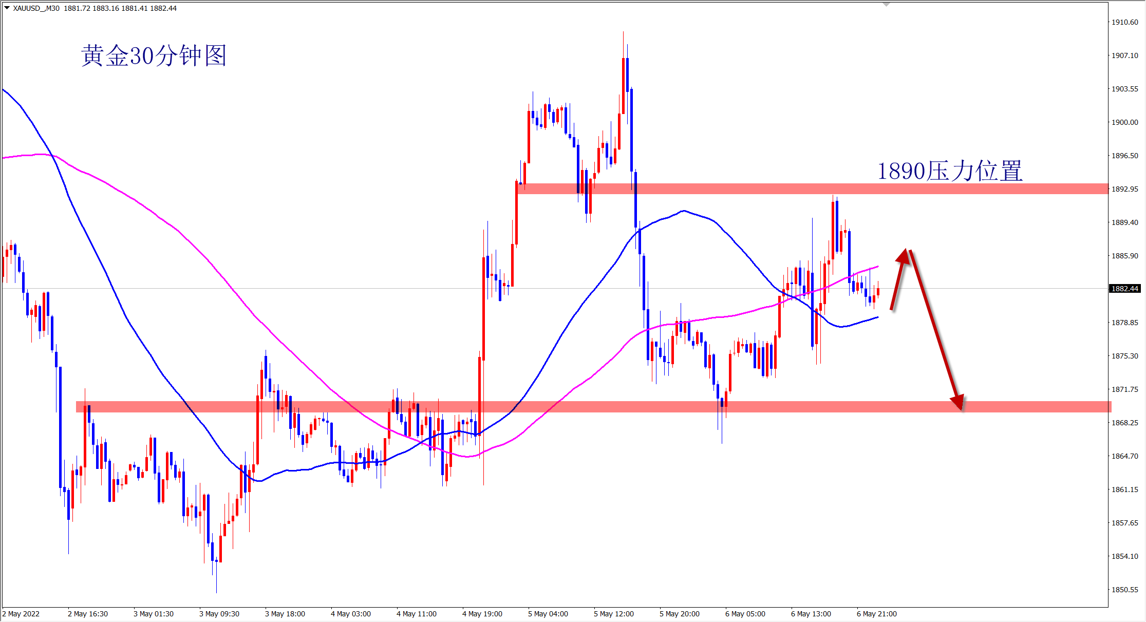 黄金昨日大跌,今日早盘先跌后反弹,但没有突破我们所强调的1880的压力,反弹无力,依旧是空头走势,欧盘依旧是以1880的压力位防守看跌! 计划你的交易,交易你的计划。当前的黄金走势明确,就是下跌空头,反弹就是干空机会!昨日美盘冲高回落,直接下跌40美金,而且没有大的反弹,说明空头下跌非常强势,千万不要
