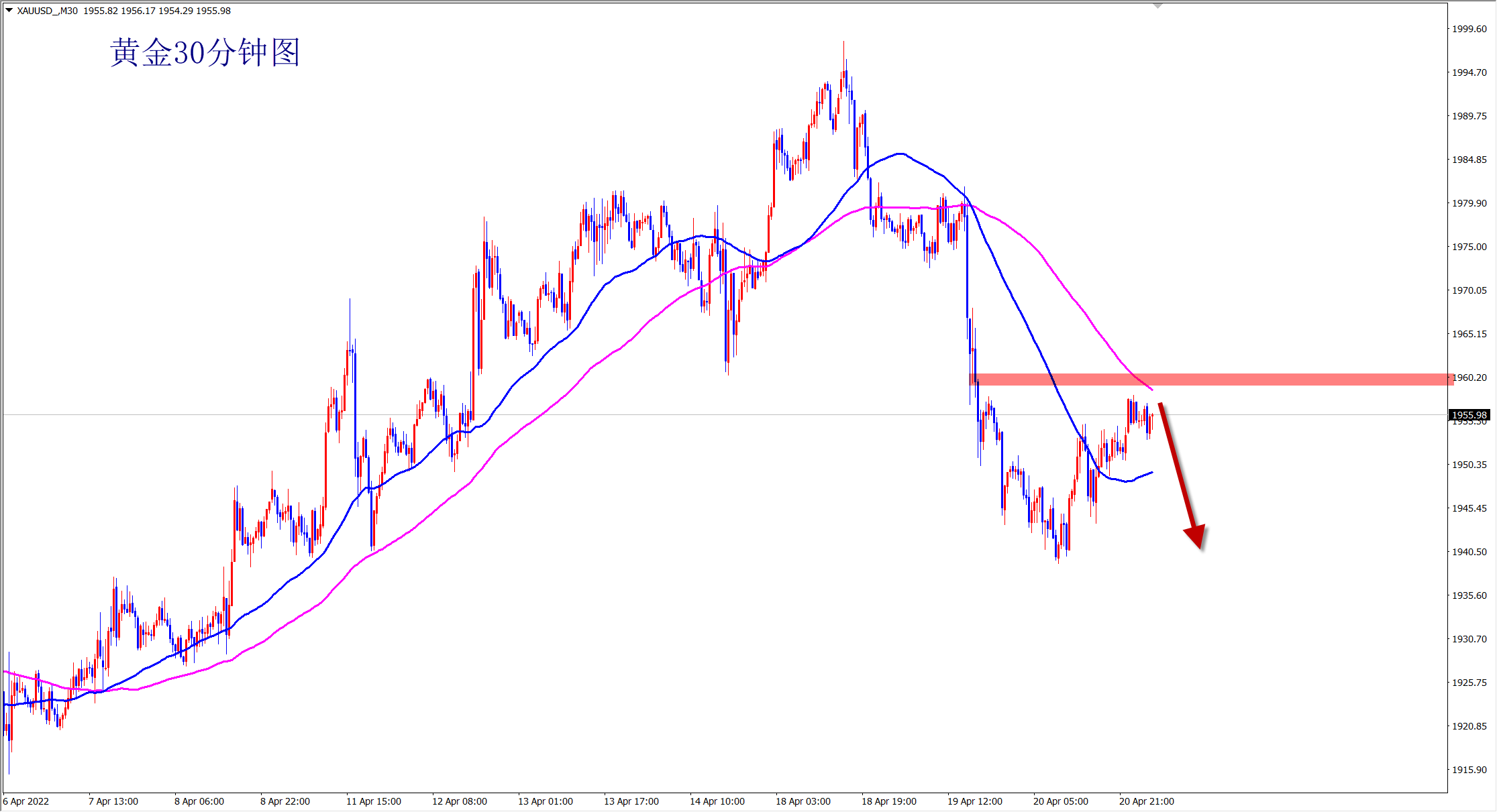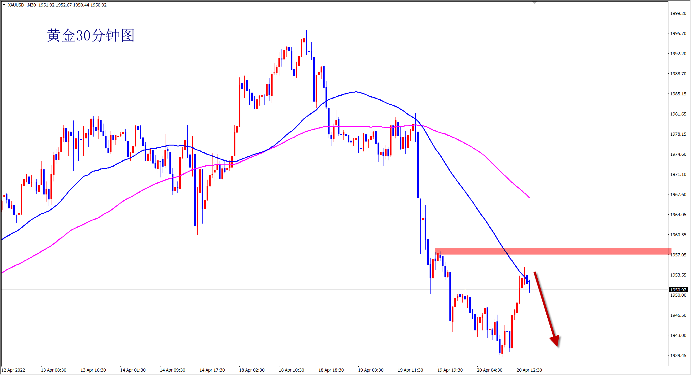 黄金今日再次单边下跌,我们早盘已经提示1960压力位置下,就是干空,1955的空单也是大跌拿下十几美金利润!当前黄金继续破位新低,美盘还是干空,1945直接空! 单边行情来了,你跟上市场的脚步了吗?大跌的走势,不要犹豫,犹豫就是错过!当前黄金反弹调整后继续开启下跌,是二次下跌的走势,破位新低后将直达1930