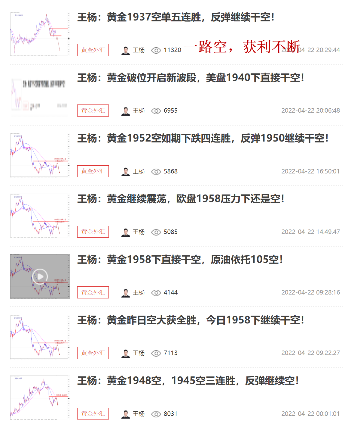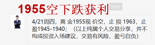 黄金当前震荡调整,但跌势不变,反弹就是干空机会,早盘1955空,已经开始下跌获利中!窄幅震荡的走势,点位抓的好,一样是利润! 黄金已经转为了下跌的走势,方向很明确!行情走的确实是比较墨迹,但是1960的压力我们看的很死,定死了这个位置!只要有效不突破,空单放心持有!我看空就是坚定,实力强大才能临