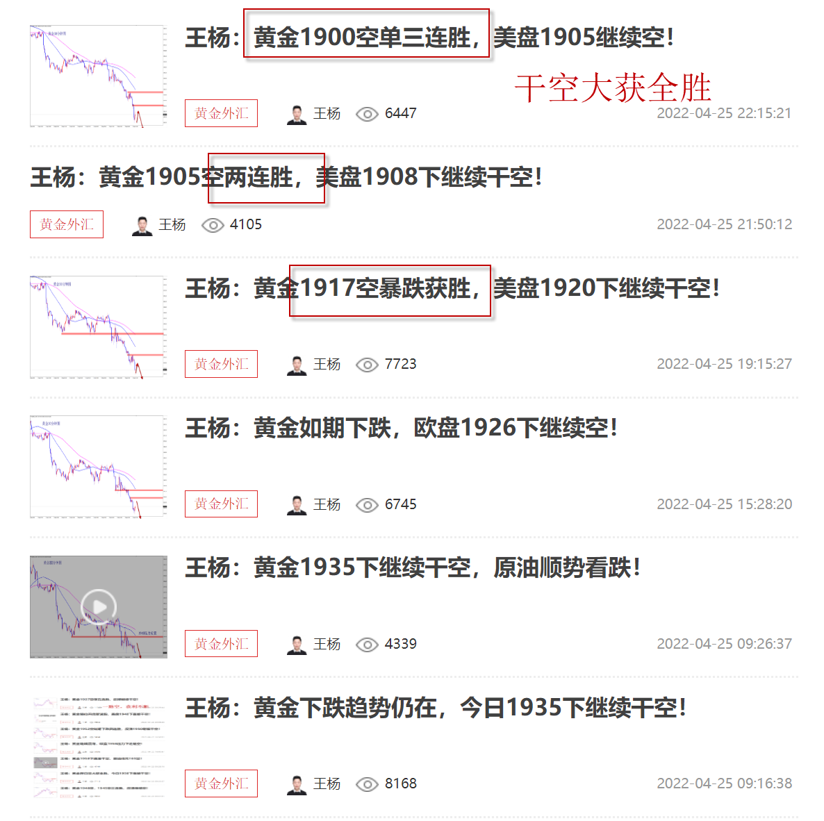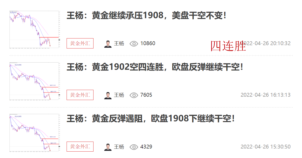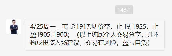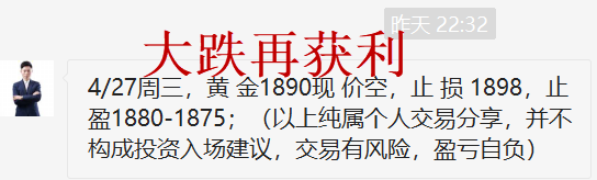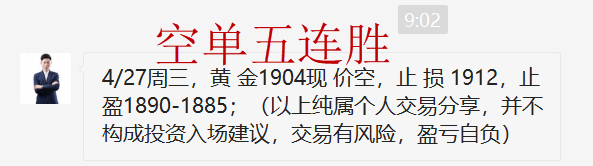 黄金昨日单边大跌,我们顺势跟进空单,从1917开始,然后是1905空,1900空,顺势拿下三连胜,周初大获全胜,开门红!当前黄金跌势不变,今日还是继续干空不变,1908压力还是继续干空! 黄金当前明显的单边下跌走势,趋势下跌,反弹就是干空机会,而且反弹要果断空,否则错过后大腿拍肿了也没有用!在我的操作中
