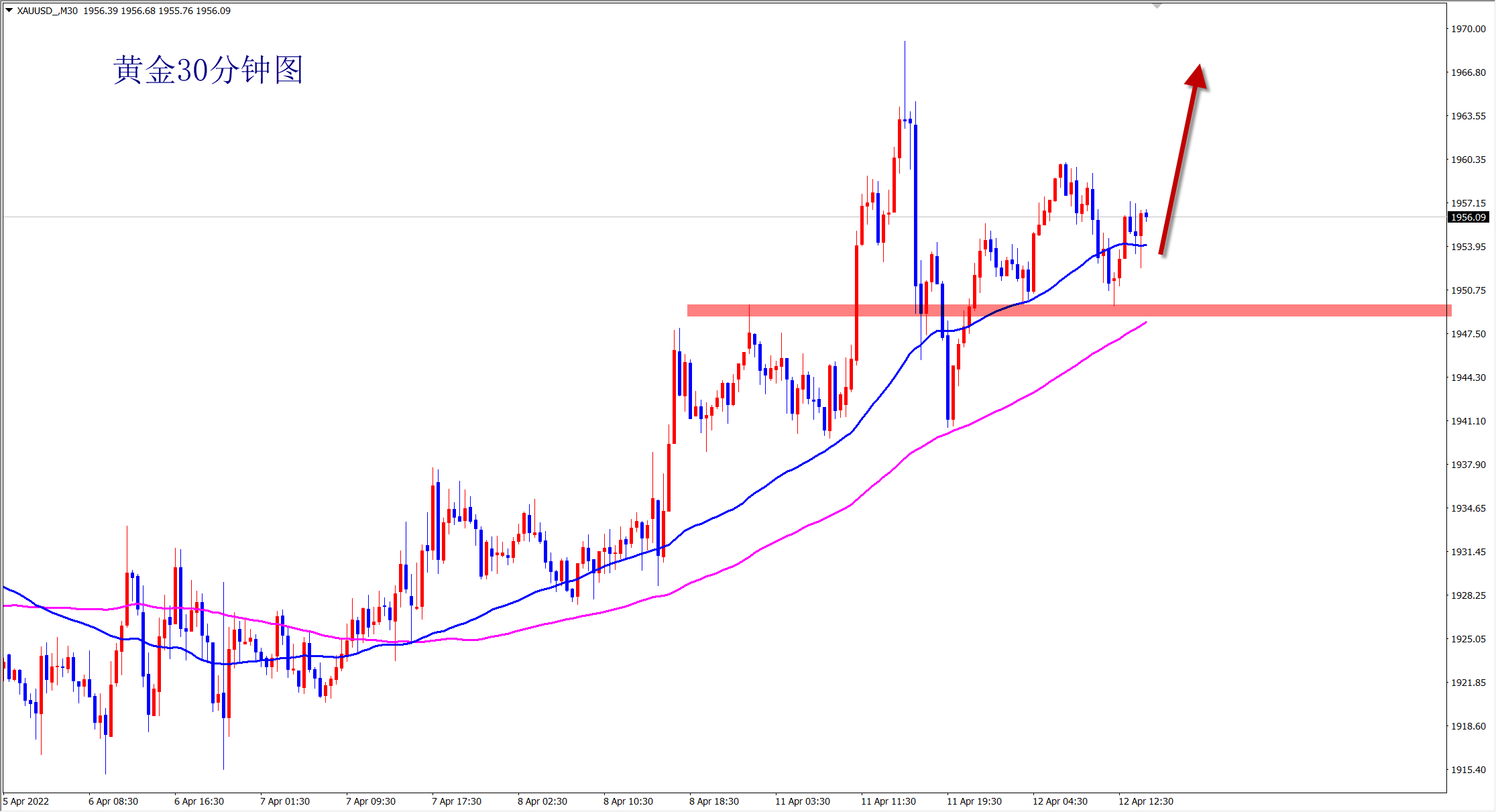 黄金昨日大涨,我们更是顺势跟进,日内拿下4张多单,大获全胜!当前黄金涨势不变,早盘1960继续干多! 黄金当前属于明显的上涨趋势,也是突破底部盘整后的上涨波段,涨势还在继续,干多仍是我们的主思路!黄金30分钟级别上,均线呈平行排列,而K线受到均线支撑上行,上涨走势完好,趋势仍是涨! 早盘黄金