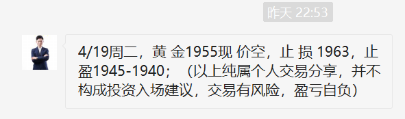 黄金昨日破位下跌,我们1969果断空,反弹1962继续空,1955接力空,隔夜大跌至1943,全部大跌获胜!日内干空三连胜,给力! 当前黄金开启跌势,反弹就是干空机会!方向很明确,思路很简单,剩下的就是执行!如果你还不知道如何操作的,请及时的关注王杨,带你驰骋金市,轻松翻倍! 黄金昨日破位后大跌,并